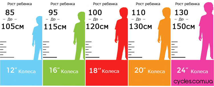 Подбор велосипеда по росту ребенка осуществляется отталкиваясь от диаметра колес.На рисунке детально показано какой диаметр колес оптимален для определенного роста.