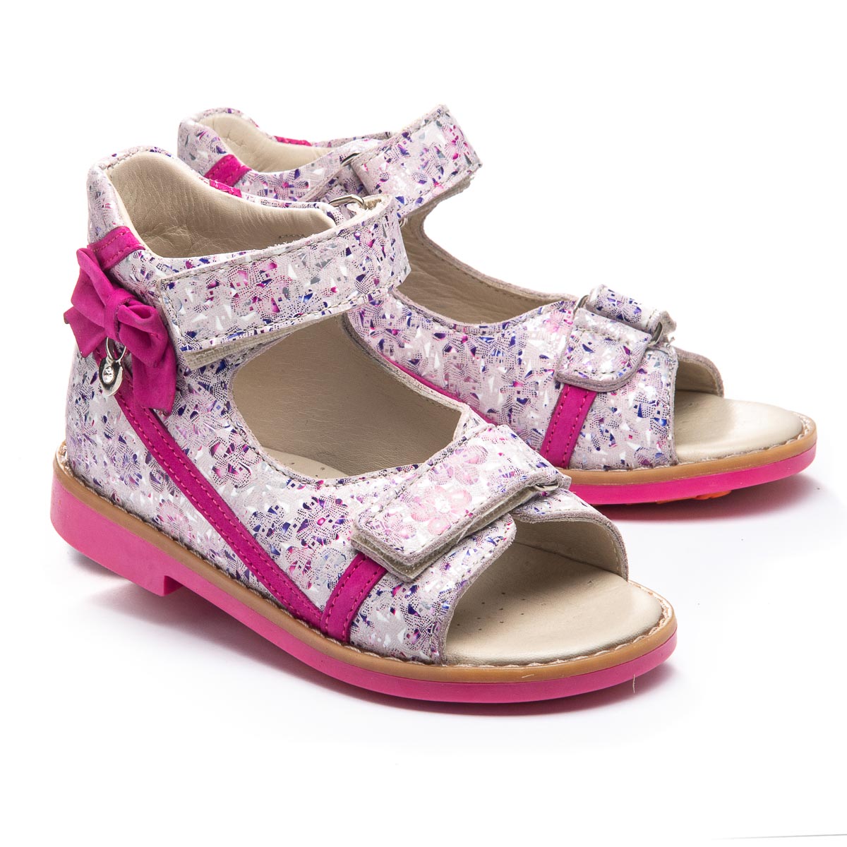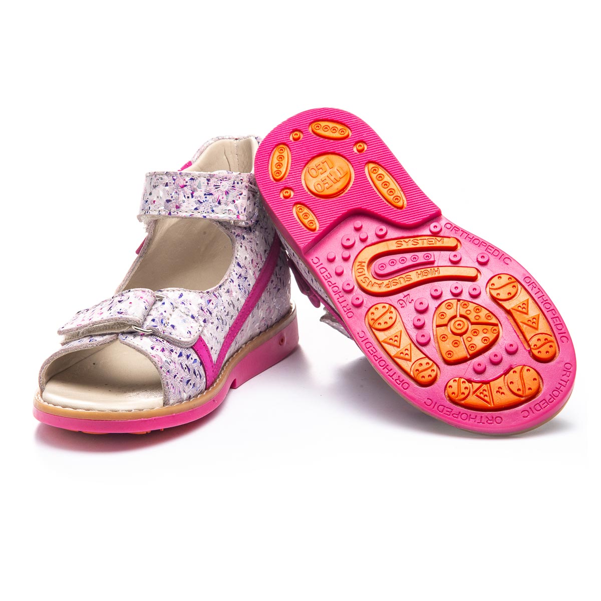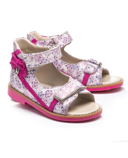 Профилактические босоножки для девочки выполнены из натуральной кожи розового цвета с оригинальным принтом. Особый акцент обуви придает яркий декоративный розовый бантик. Две липучки обеспечивают надежную фиксацию на ноге. Для обеспечения правильного развития стопы, здоровья ног и максимального комфорта, обувь имеет специальные свойства: