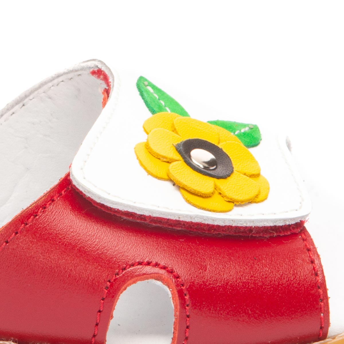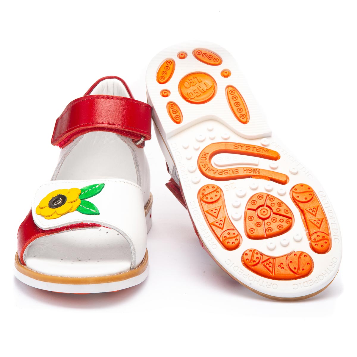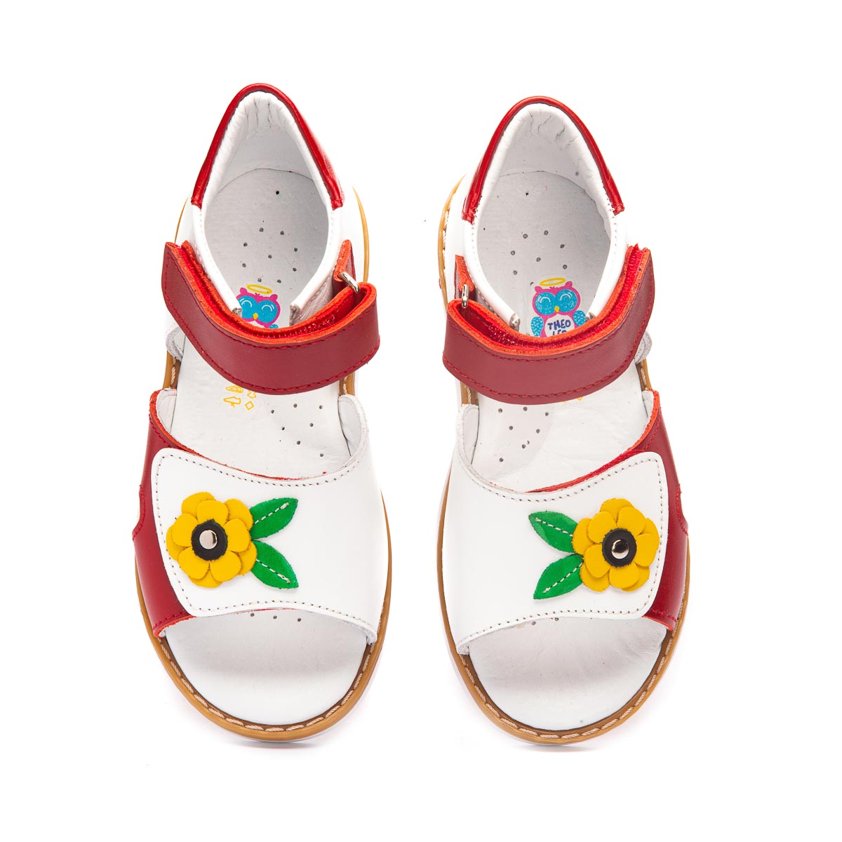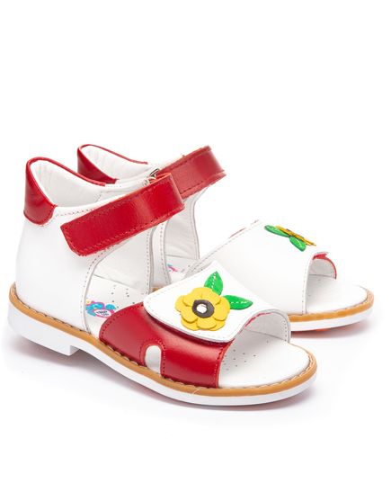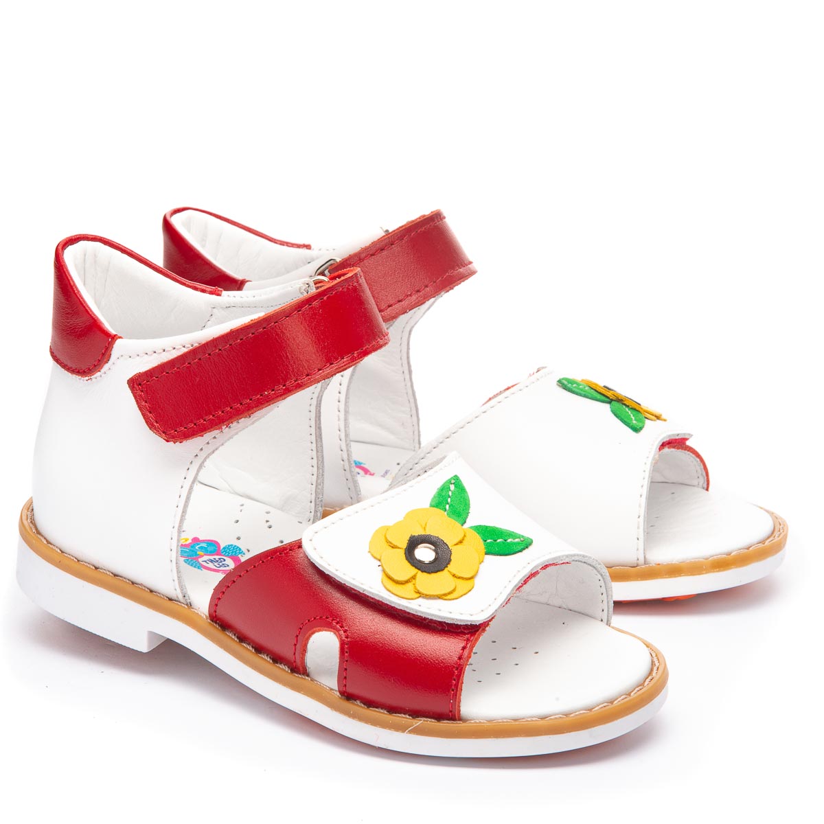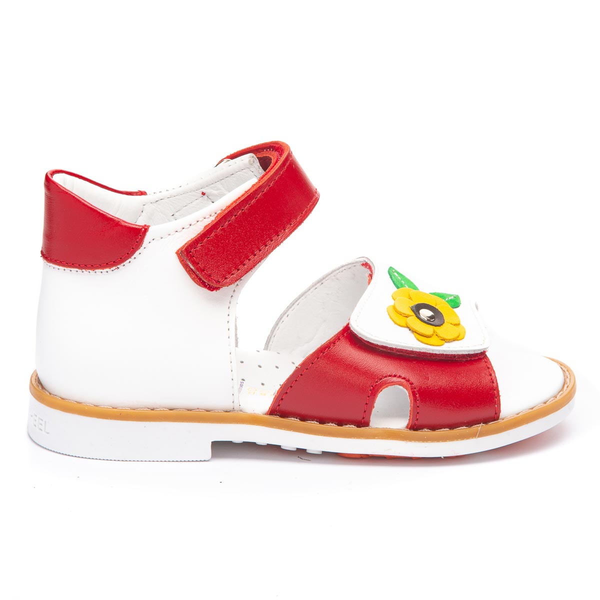 Босоножки для самых маленьких модниц, изготовленные из натуральной кожи. Эта модель представлена в белом цвете с яркими красными акцентами, и украшена цветком. Благодаря красочному дизайну ребенок мотивируется к активности и игре. Застежка-липучка не только облегчает процесс обувания и снятия обуви, но и гарантирует надежную фиксацию на ножке вашей дочери. Стелька кожаная с анатомическим супинатором. Подошва с каблуком Томаса - из термопластичной резины. Эти босоножки идеально подойдут для активных игр и прогулок.