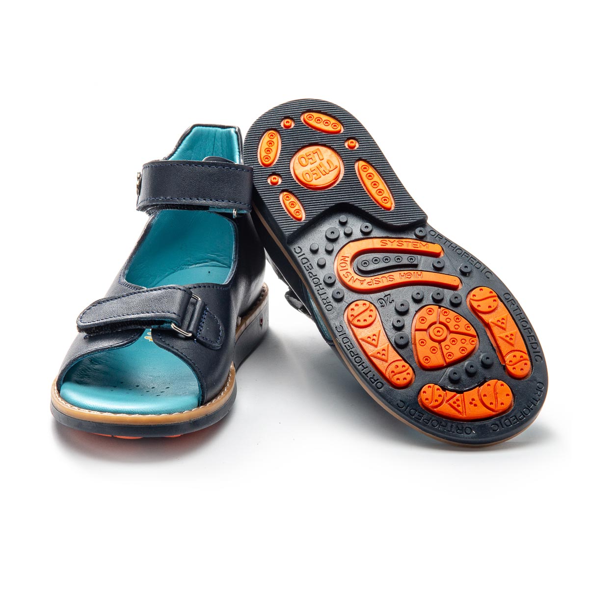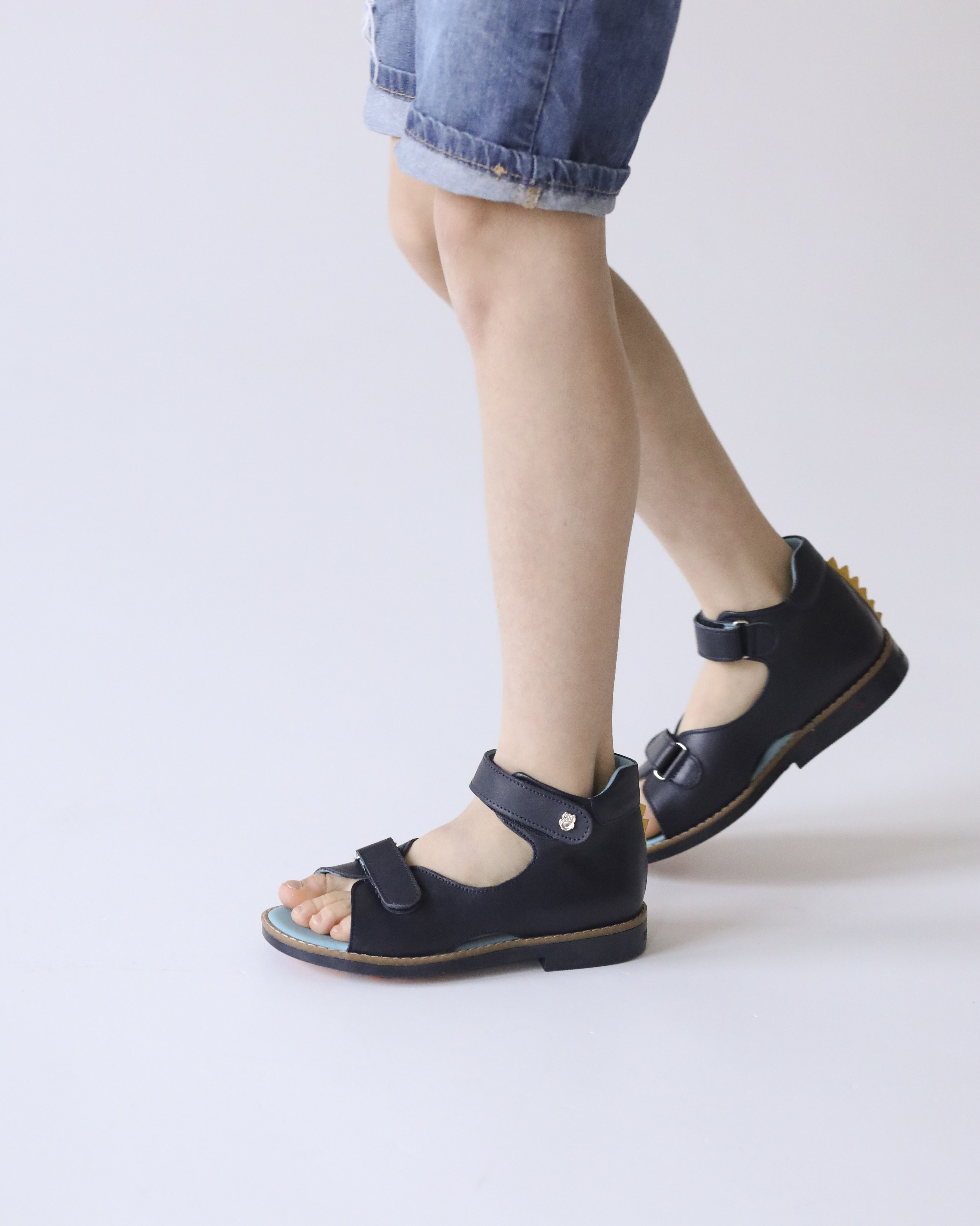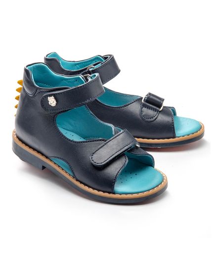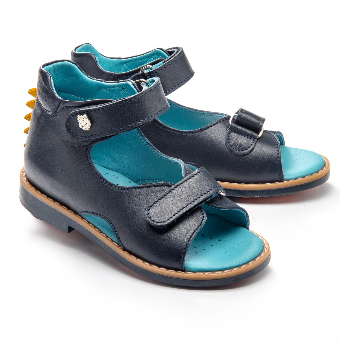 Босоножки для мальчиков, выполненные из гладкой натуральной кожи темно-синего цвета. Особым элементом этих босоножек является декор в форме зубцов, что придает им оригинальный и интересный вид. Босоножки оснащены удобными застежками на липучках. Для обеспечения правильного развития стопы, здоровья ног и максимального комфорта, обувь имеет специальные свойства: