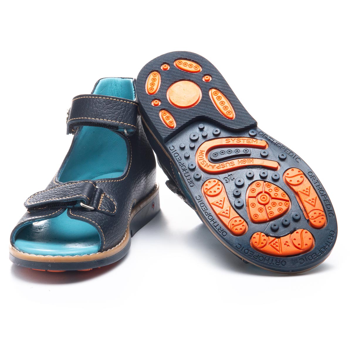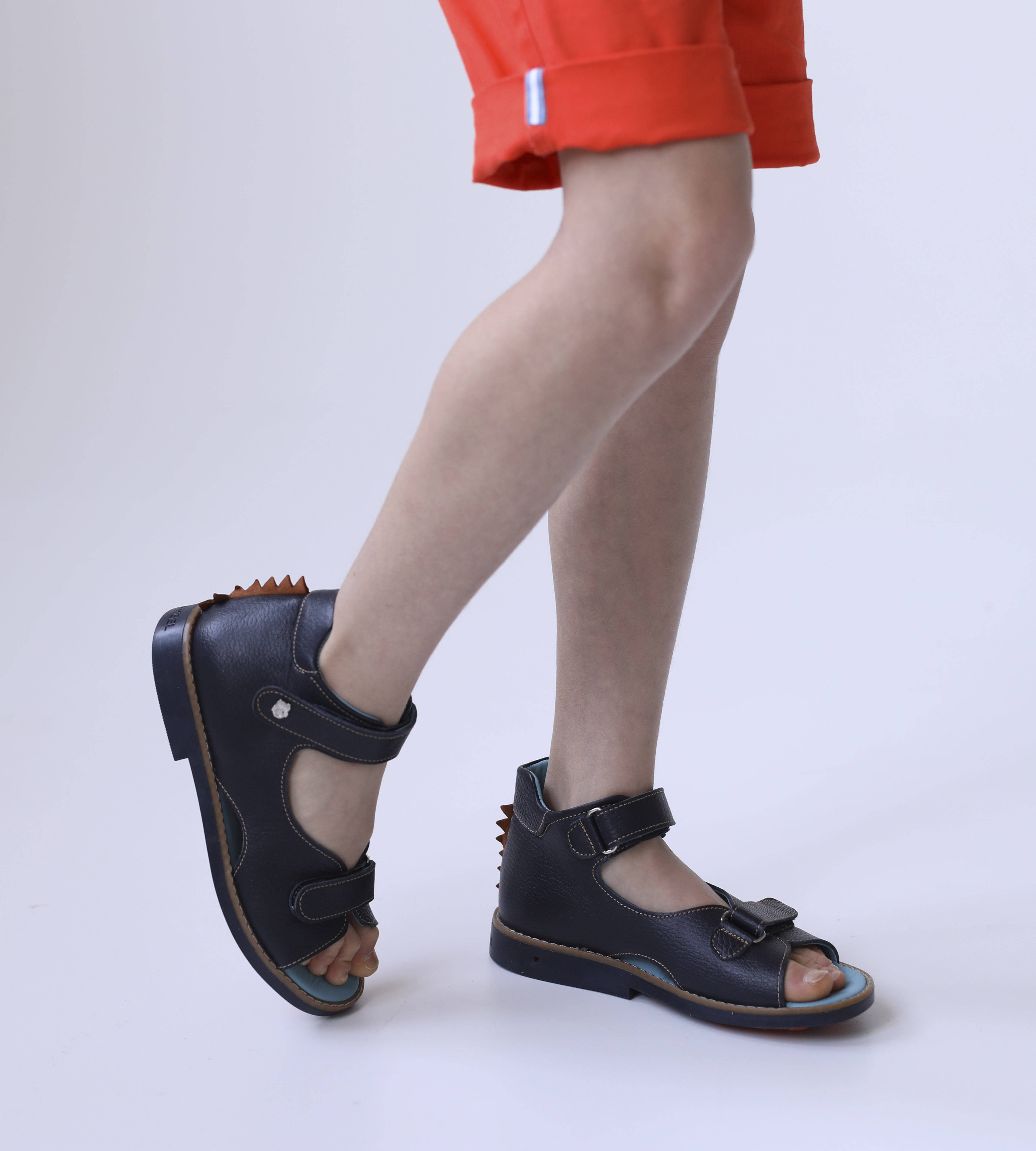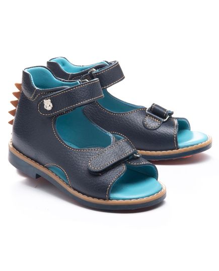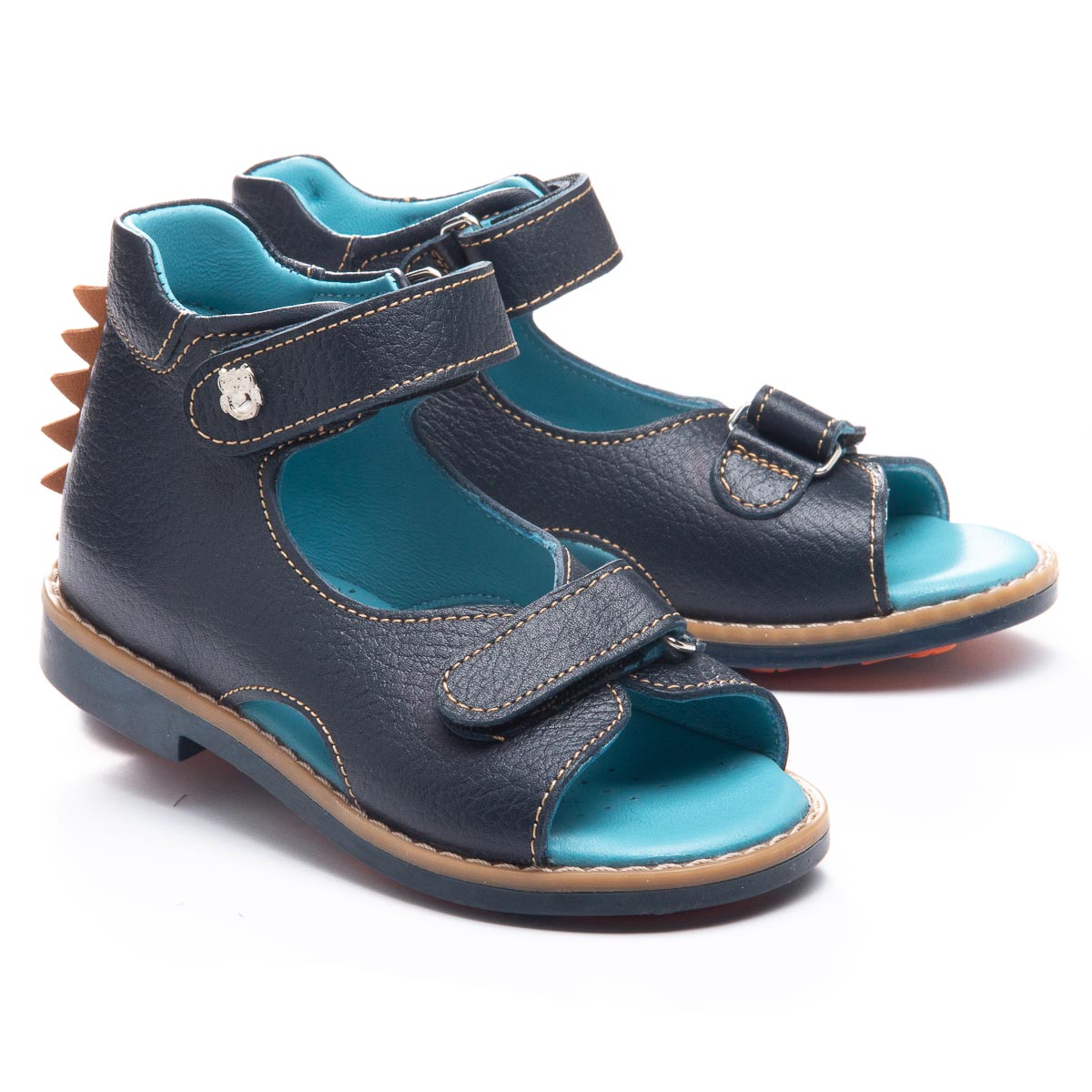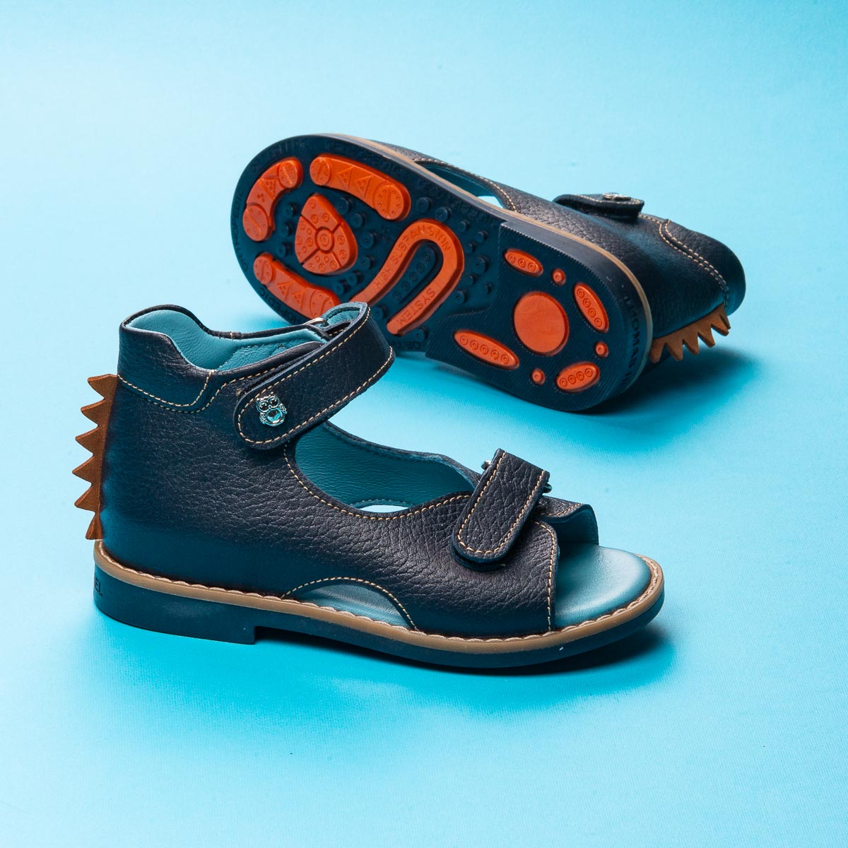 Босоножки для мальчиков, выполненные из натуральной кожи темно-синего цвета, на пятке украшены зубцами. Этот декор создает стильный акцент и делает обувь неповторимой. Имеют удобные застежки на липучках. Для обеспечения правильного развития стопы, здоровья ног и максимального комфорта, обувь имеет специальные свойства: