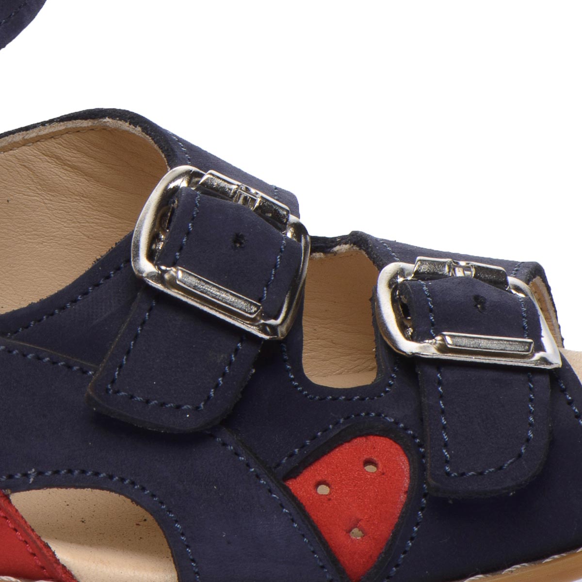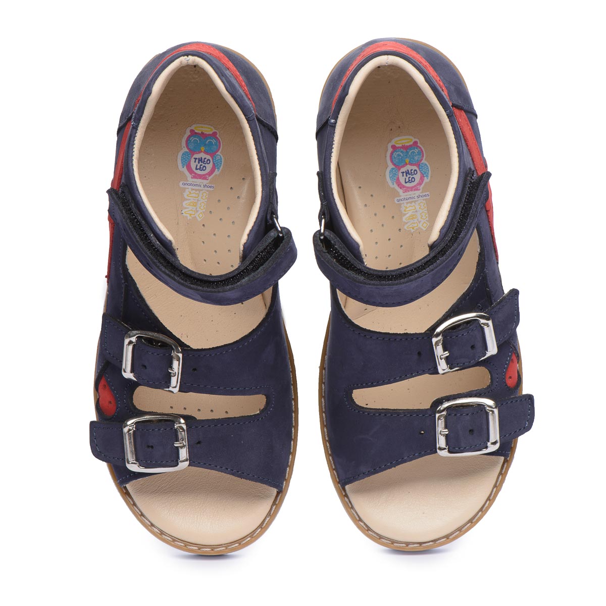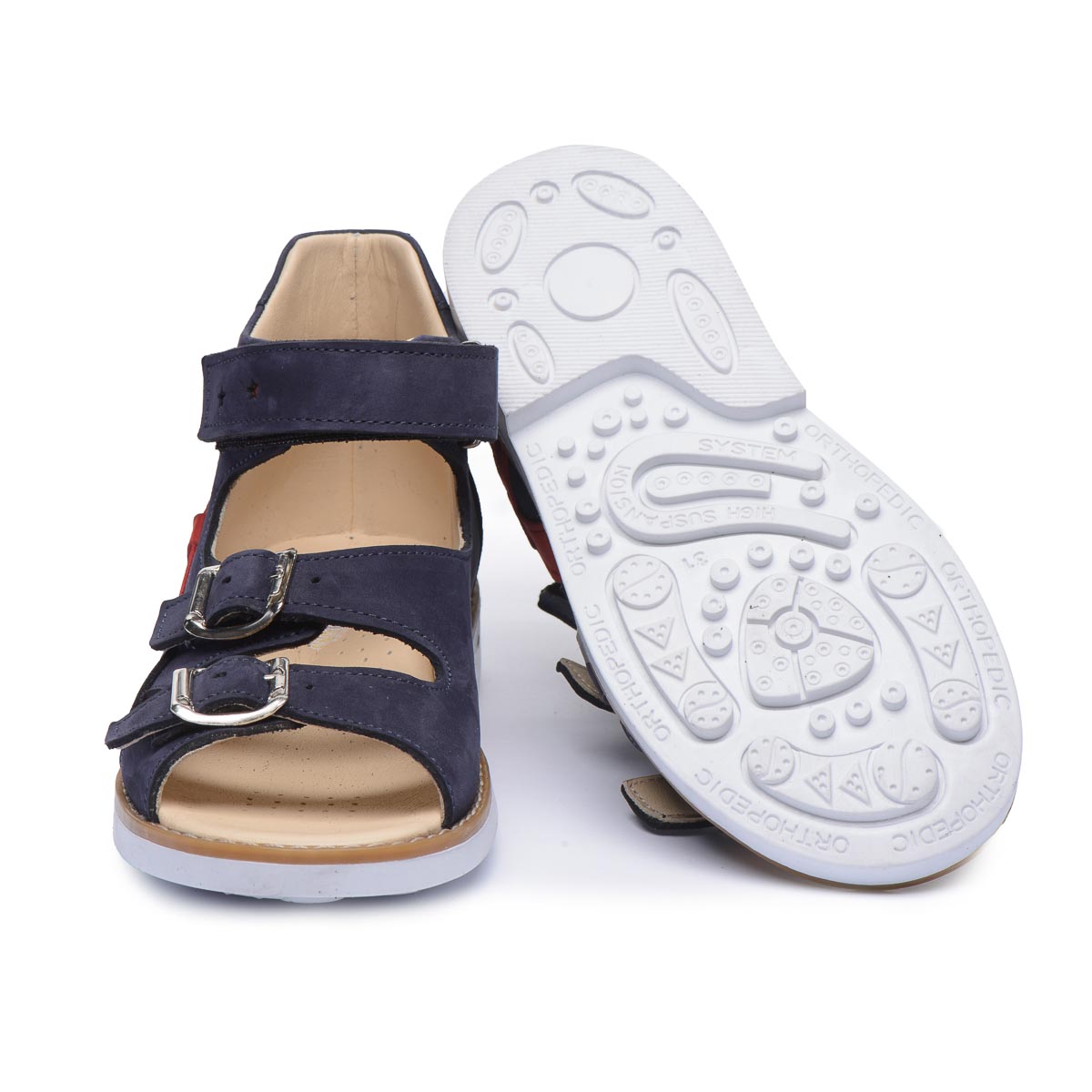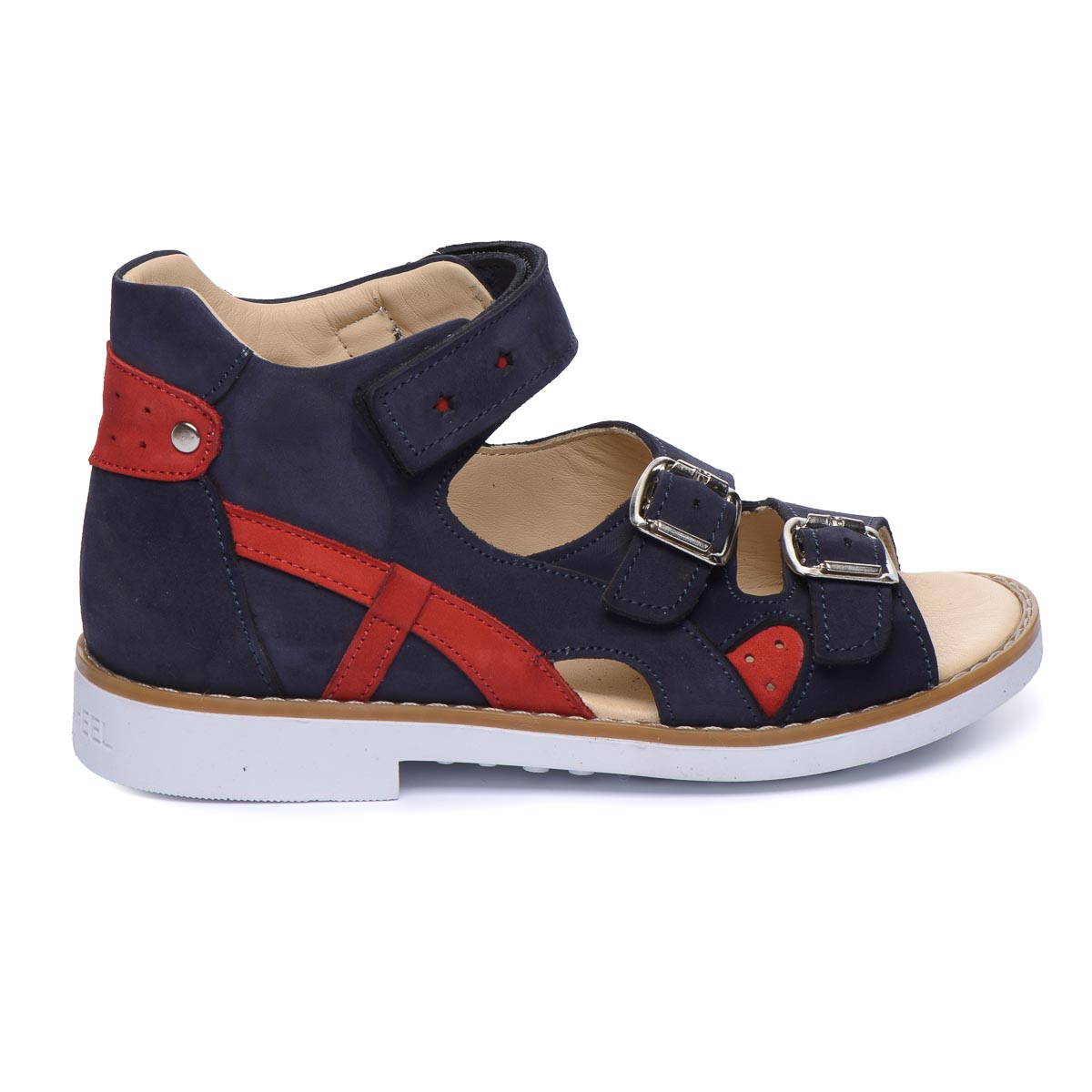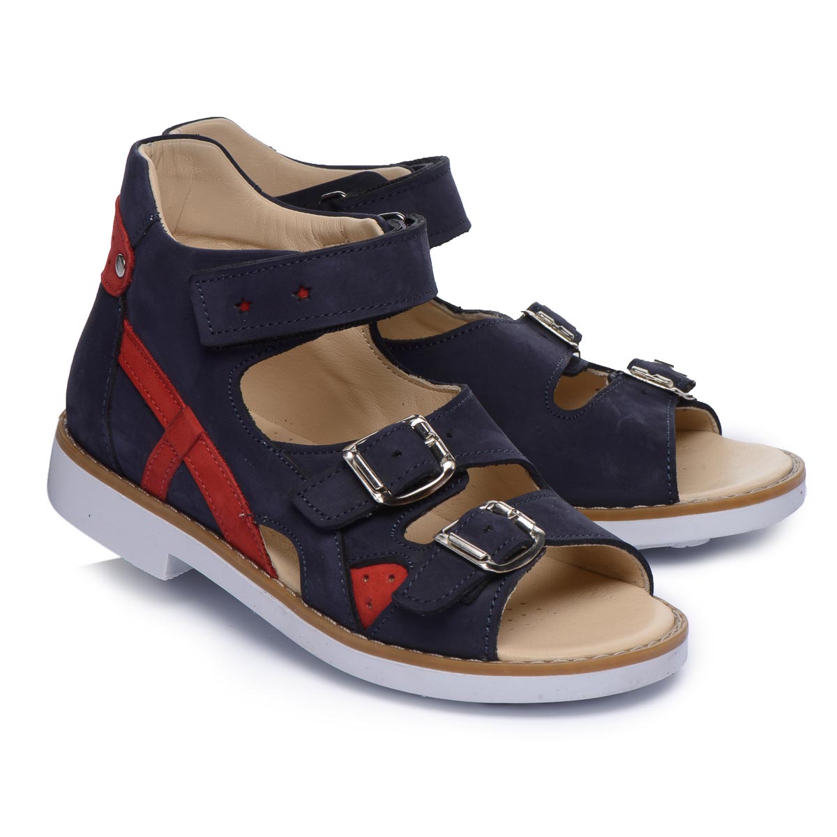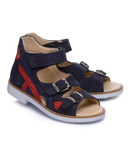 Босоножки для мальчиков, выполнены из натурального нубука темно-синего цвета, украшены красными вставками. Оснащены удобной застежкой на липучке и парой ремешков. Для обеспечения правильного развития стопы, здоровья ног и максимального комфорта, обувь имеет специальные свойства: