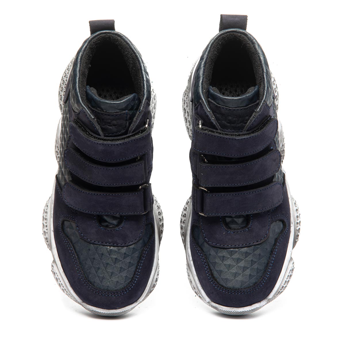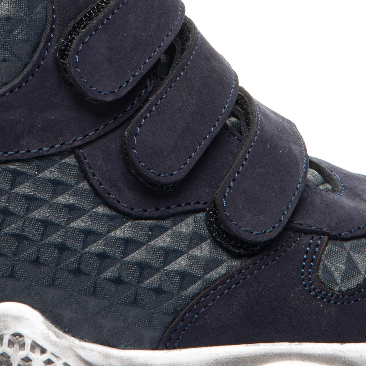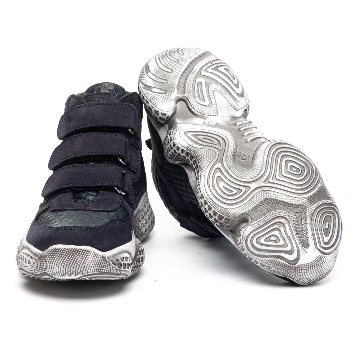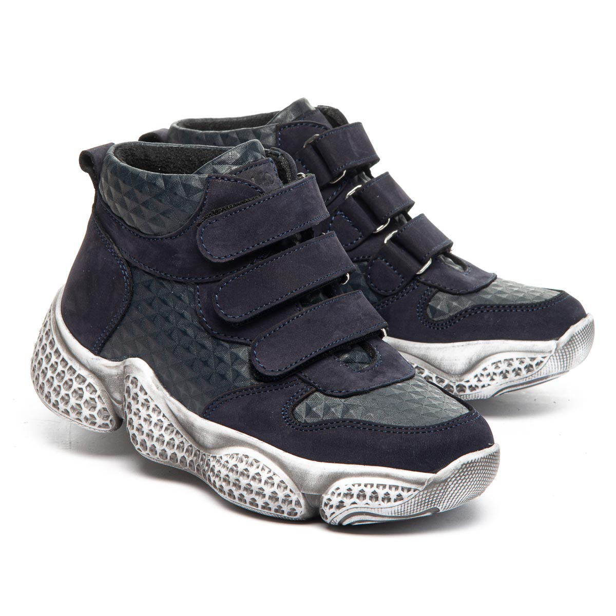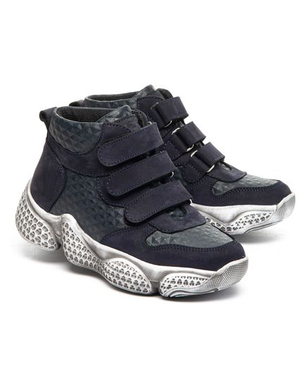 Ботинки изготовлены из натурального синего нубука и кожи с оригинальной текстурой. Внутри утеплены флисом для дополнительного тепла и комфорта. На ножках фиксируются с помощью трех прочных липучек. Стелька из натуральной кожи содержит анатомический супинатор для поддержания правильного положения стопы. Массивная подошва с использованием термопластичной резины, украшенная стильным напылением, обеспечивает отличную устойчивость и безопасность на любых поверхностях. Эти ботинки являются идеальным выбором для весенних и осенних прогулок, а также для активных подвижных игр на улице.