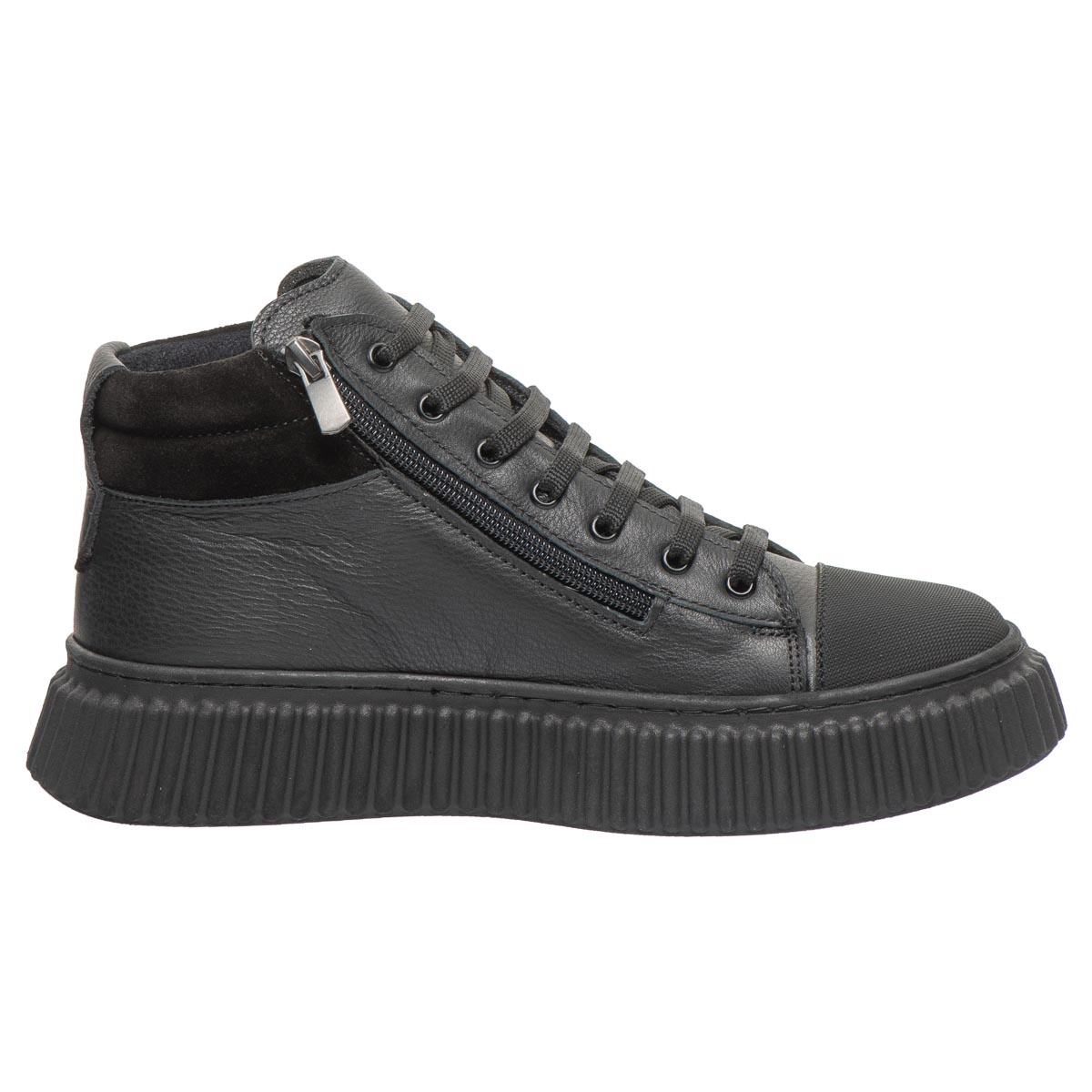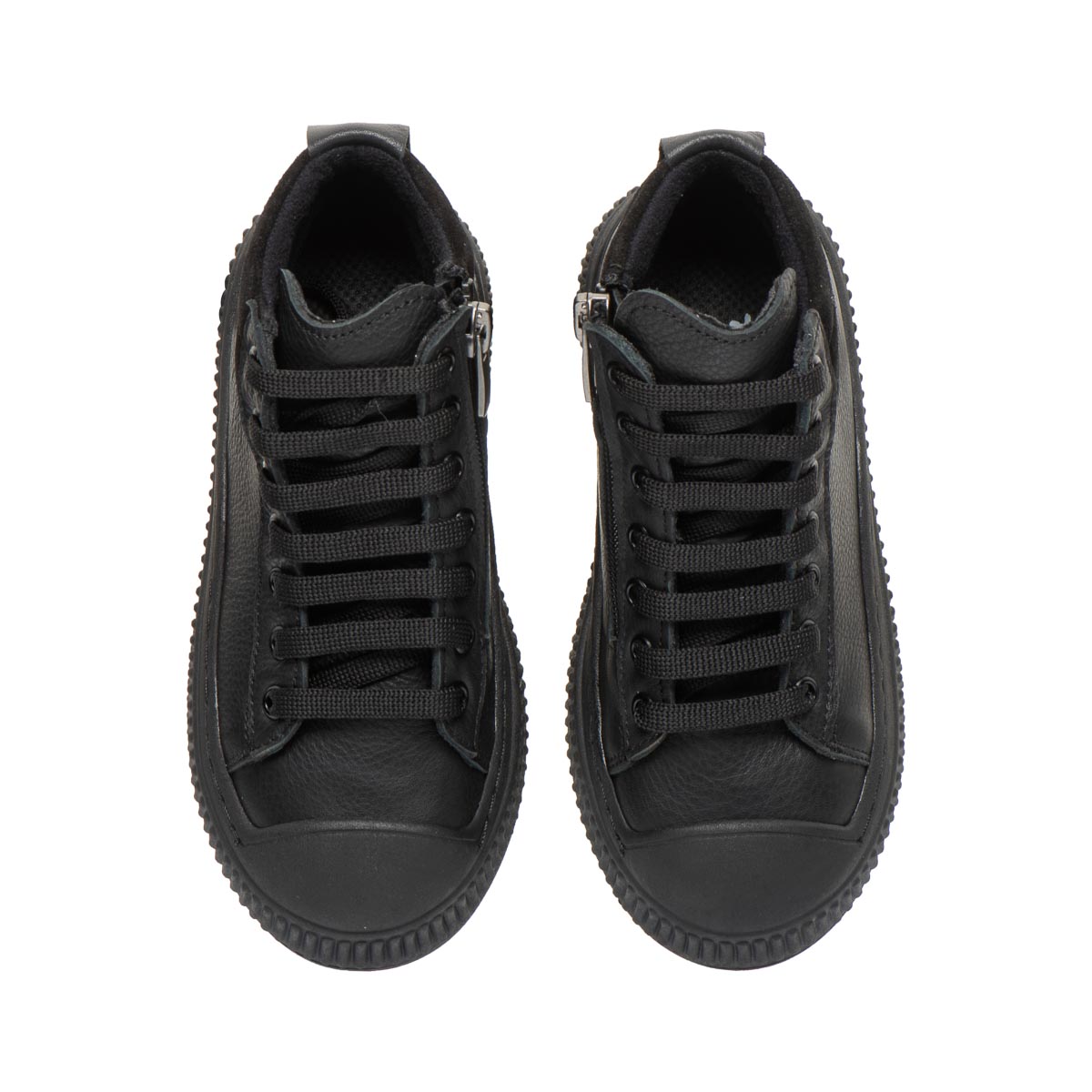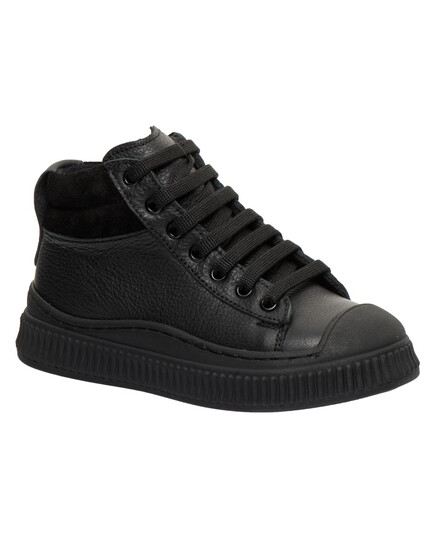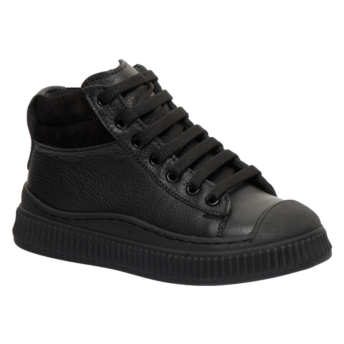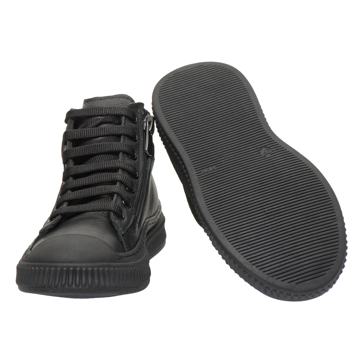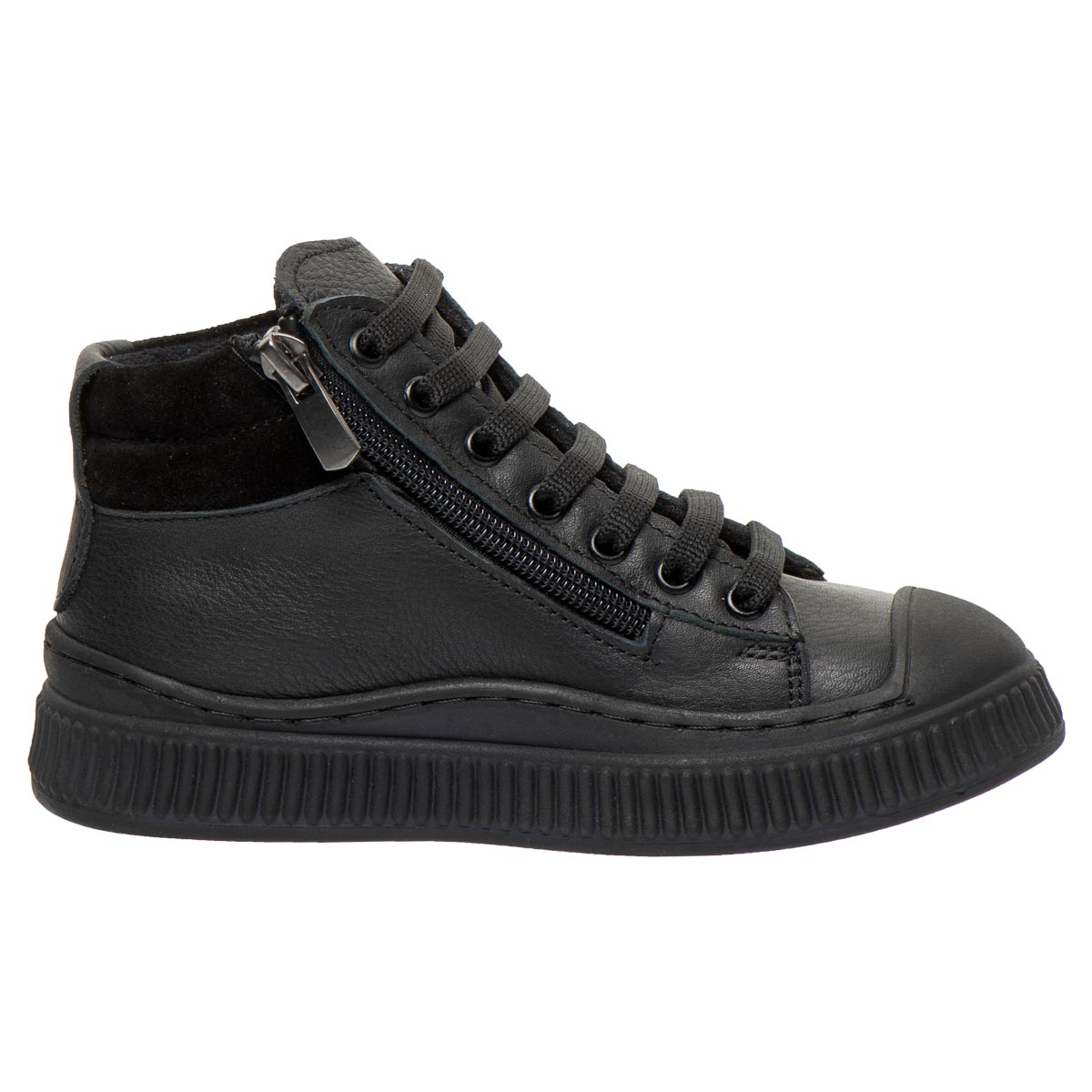 Осенние ботинки изготовлены из натуральной кожи в классическом черном цвете. Модель имеет укрепленный задник, который надежно удерживает ножку и обеспечивает правильную фиксацию стопы. Комбинация шнурков и молнии делает обувание простым и удобным. Внутри — теплая флисовая подкладка и ортопедическая кожаная стелька, гарантирующие комфорт и тепло во время прогулок. Благодаря рельефной подошве модель имеет современный дизайн.