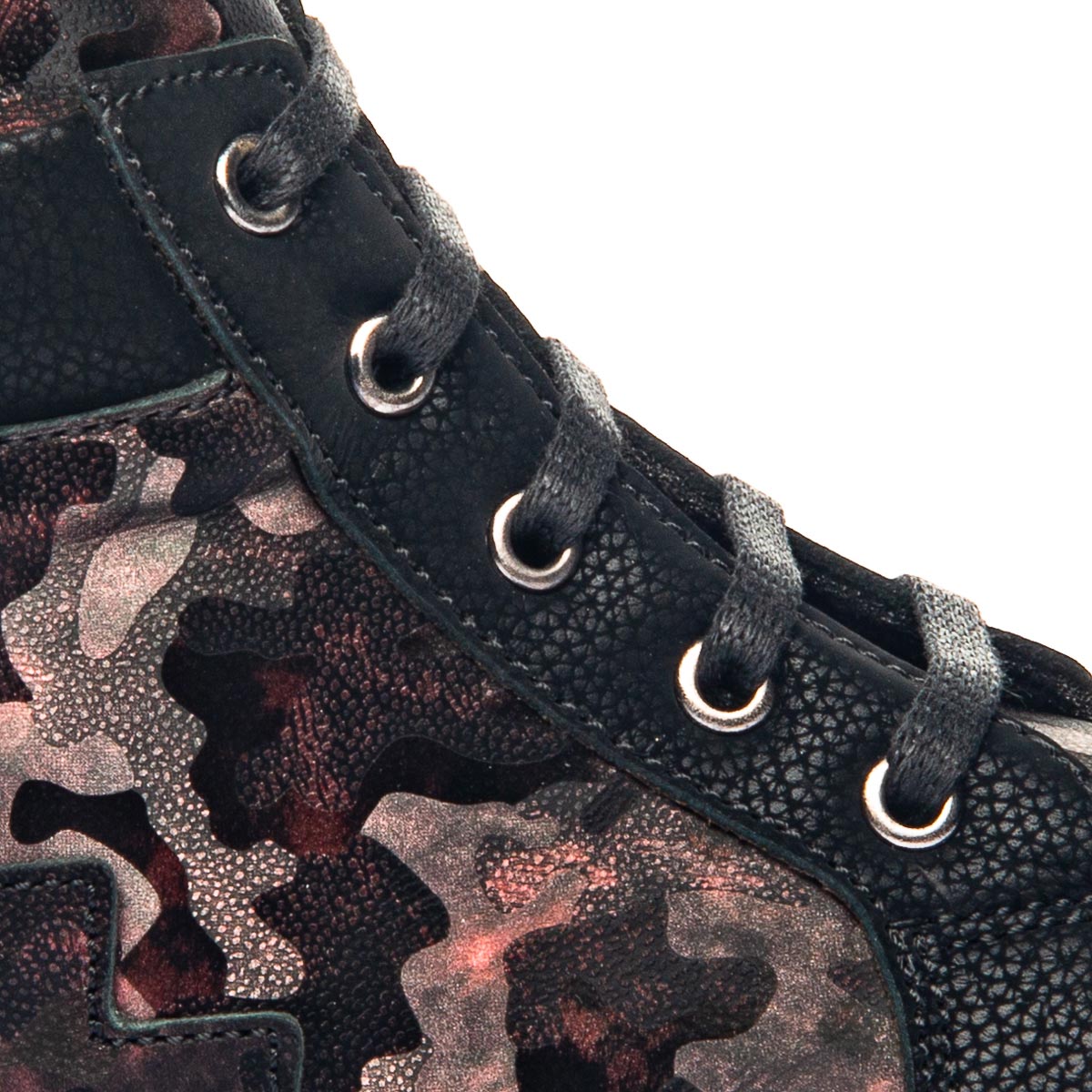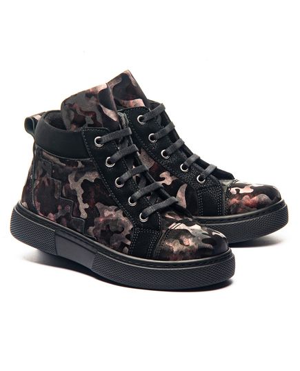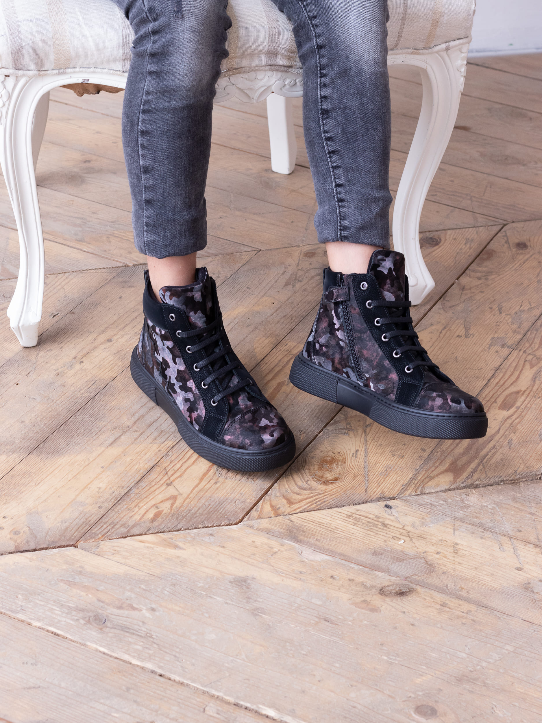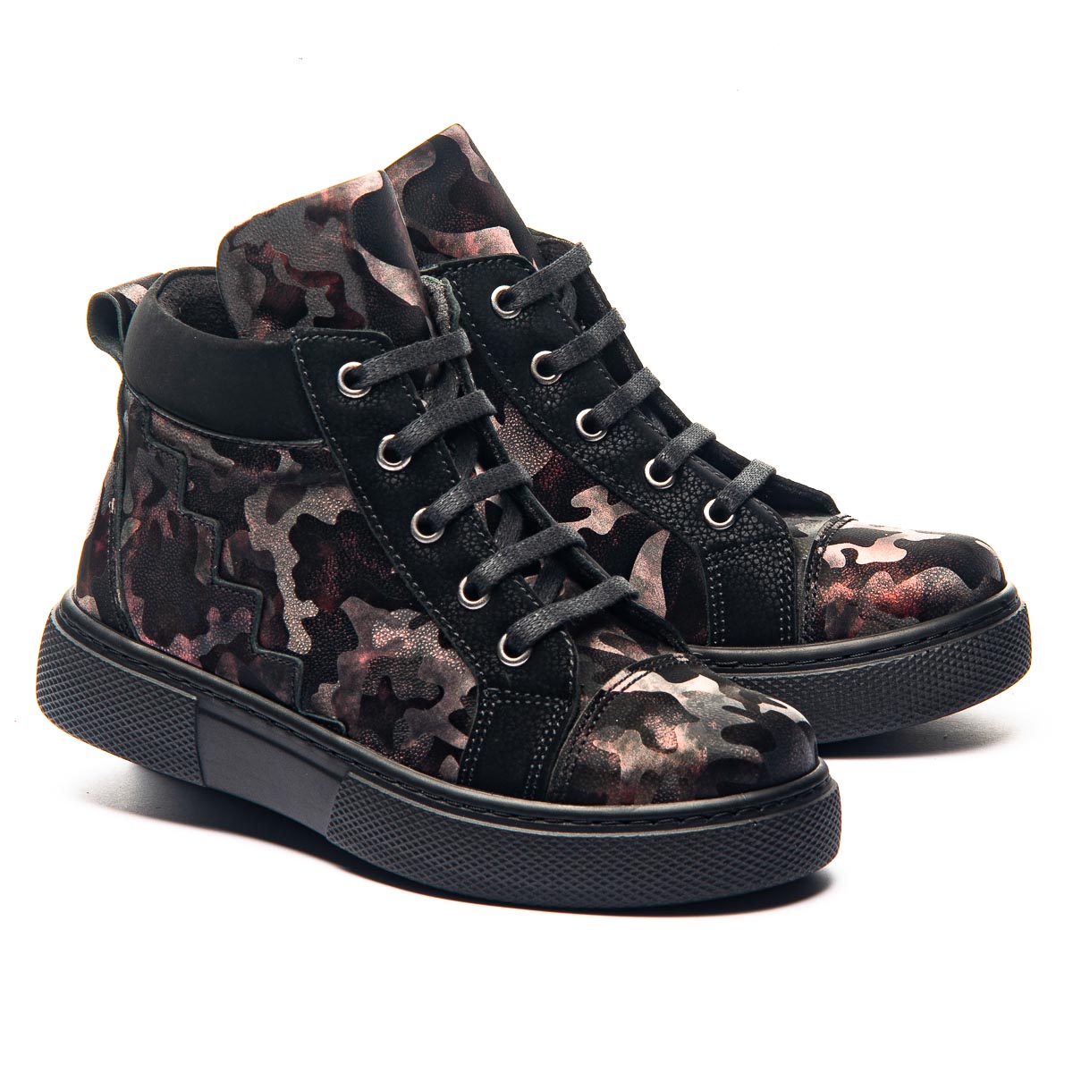 Ботинки для девочки из натуральной кожи с камуфляжной расцветкой. Внутренняя часть, выполнена из флиса для максимального тепла и комфорта. Стелька кожаная с анатомическим супинатором, что обеспечивает правильную поддержку стопы. Это удобная модель обуви на молнии, с шнурками. Подошва из термопластичной резины не скользит и хорошо амортизирует, что делает эти ботинки идеальными для активных прогулок.