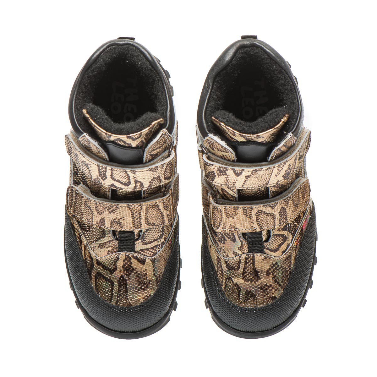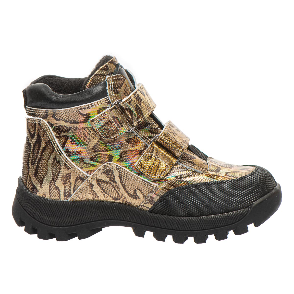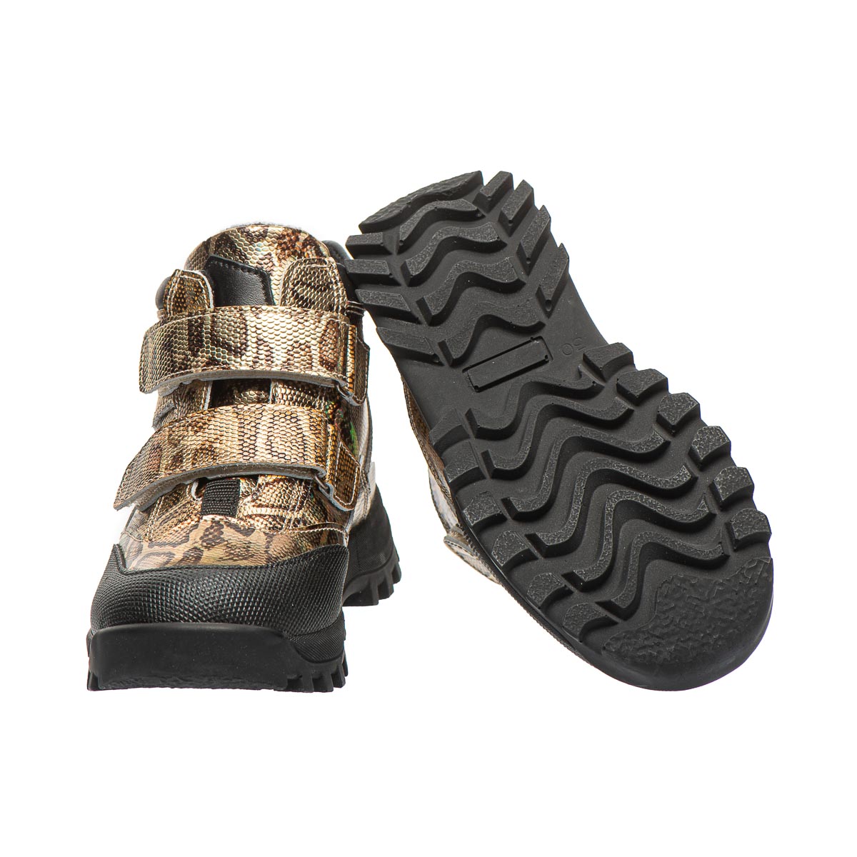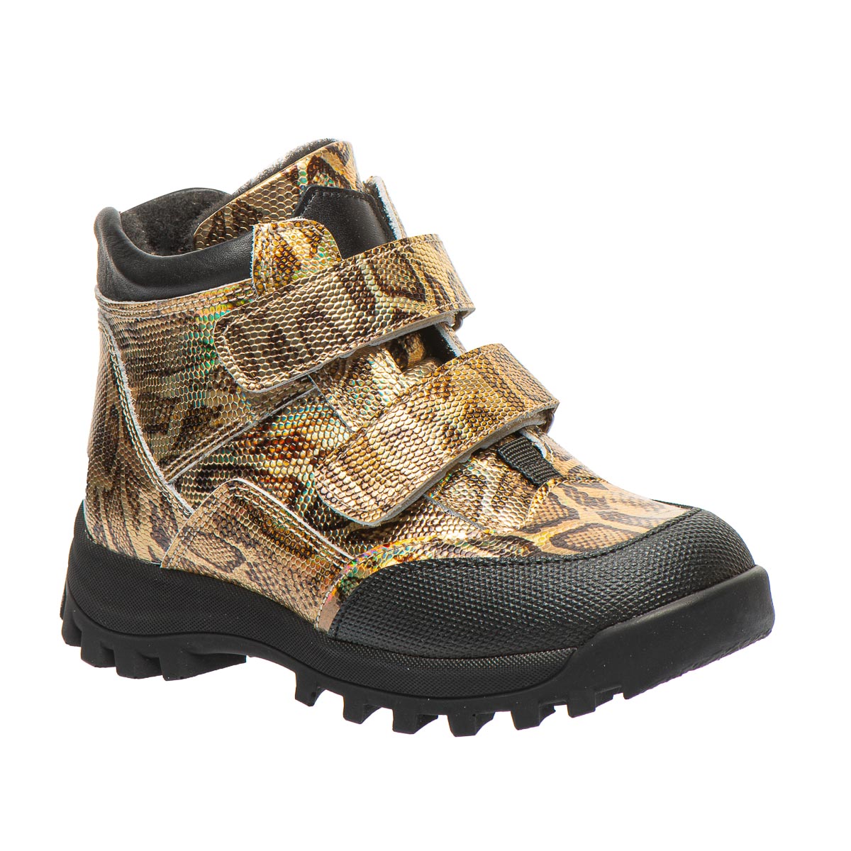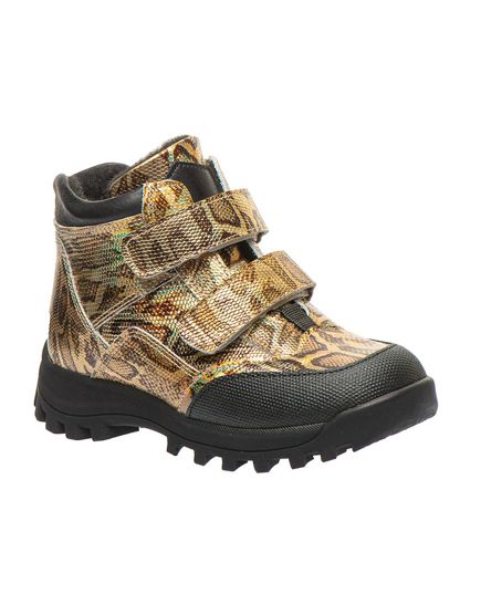 Светлая обувь в моде, и не обязательно белая. Представляем вам детские ботинки с принтом под "питона" в светлых песочных и коричневых оттенках. Утеплены флисом для комфортного ношения, а удобная застежка из двух липучек обеспечит легкость в использовании. Стелька кожаная с анатомическим супинатором. В таких ботинках ваш ребенок без сомнения выделится среди городских джунглей.