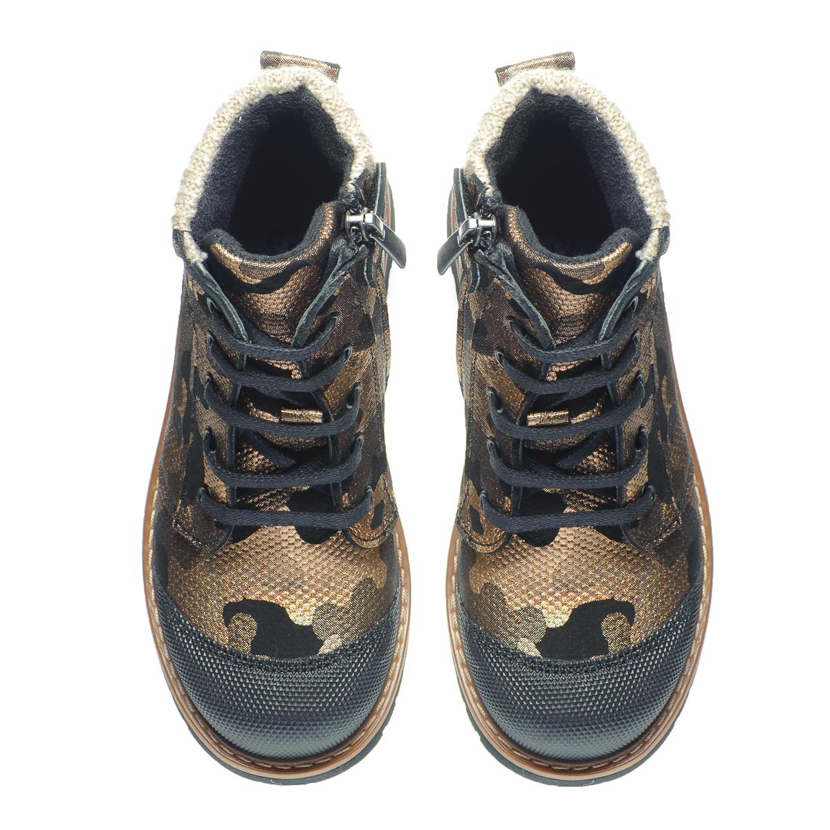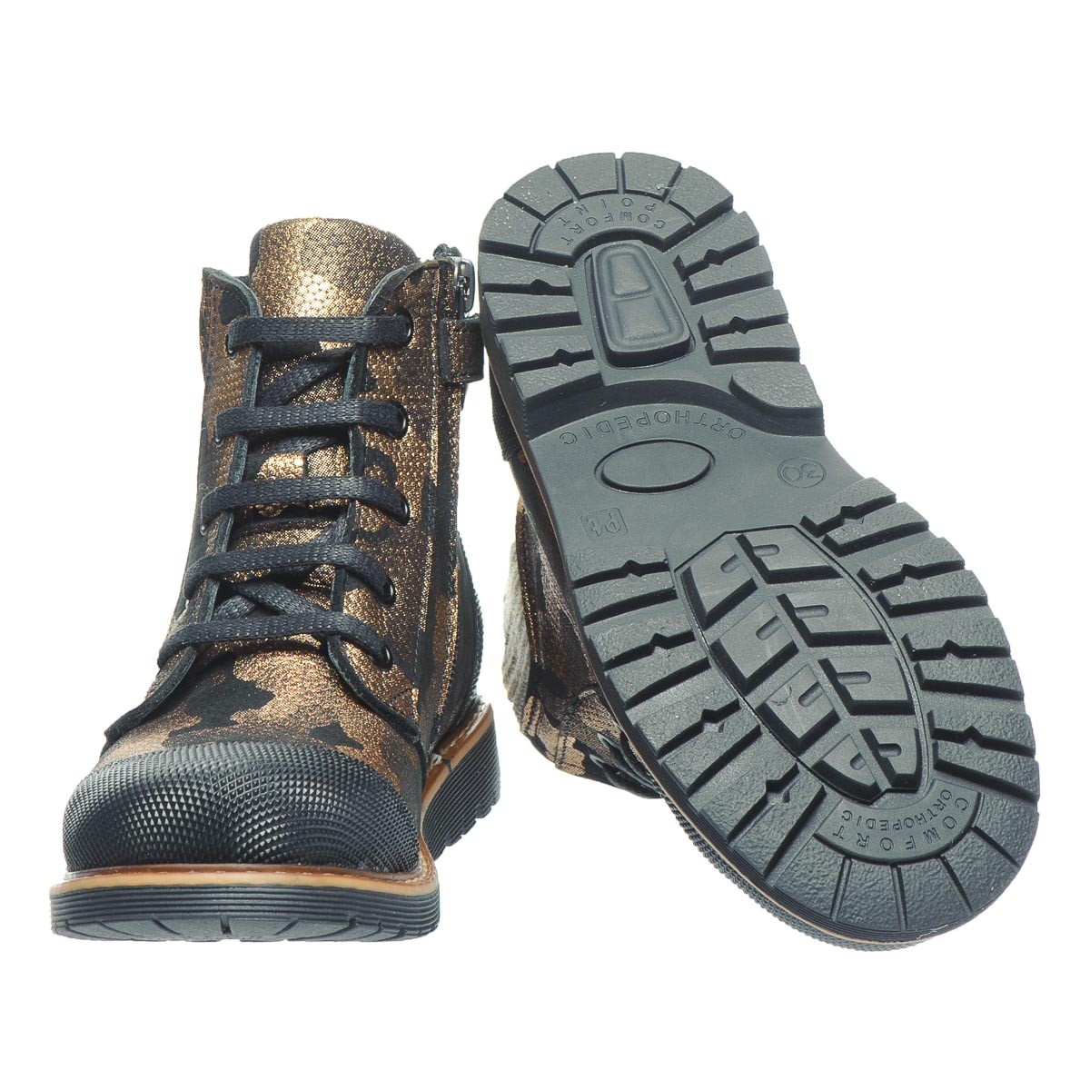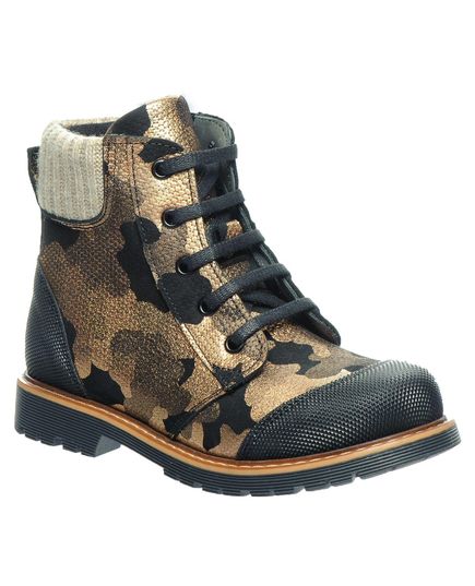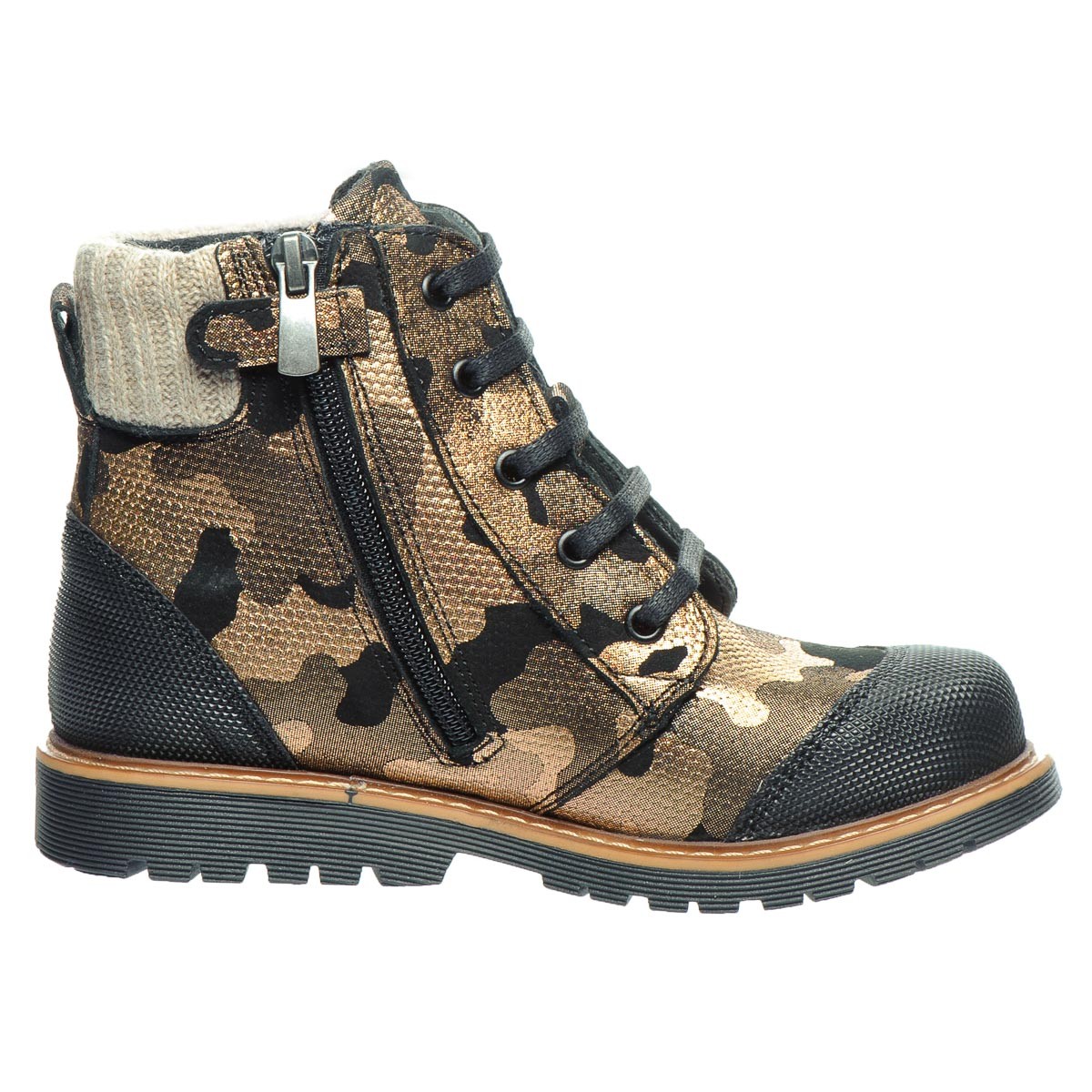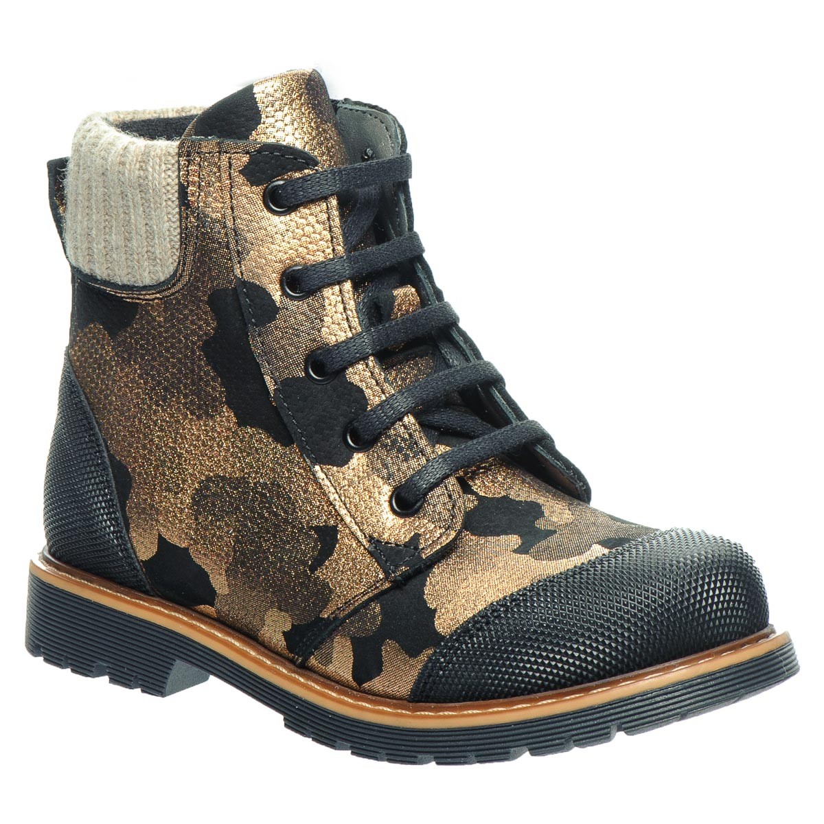 Ботинки для девочки выполнены из натуральной кожи золотого цвета с рисунком в стиле милитари. Высота ботинок немного превышает среднюю, что придает им дополнительной защиты в холодное время года. Шнуровка обеспечивает возможность регулировки посадки, а удобная молния сбоку упрощает процесс обувания. Ботинки утеплены мягким флисом. Особенностью являются ортопедические элементы: каблук Томаса для правильного положения стопы, супинатор для поддержки свода и жесткий задник для надежной фиксации пятки, что обеспечит здоровое развитие ножек ребенка.