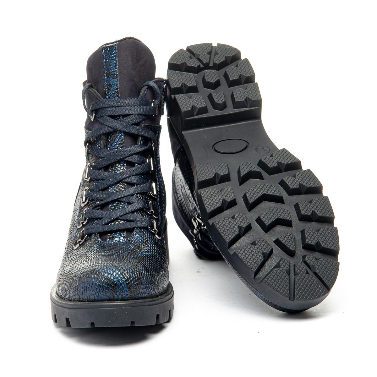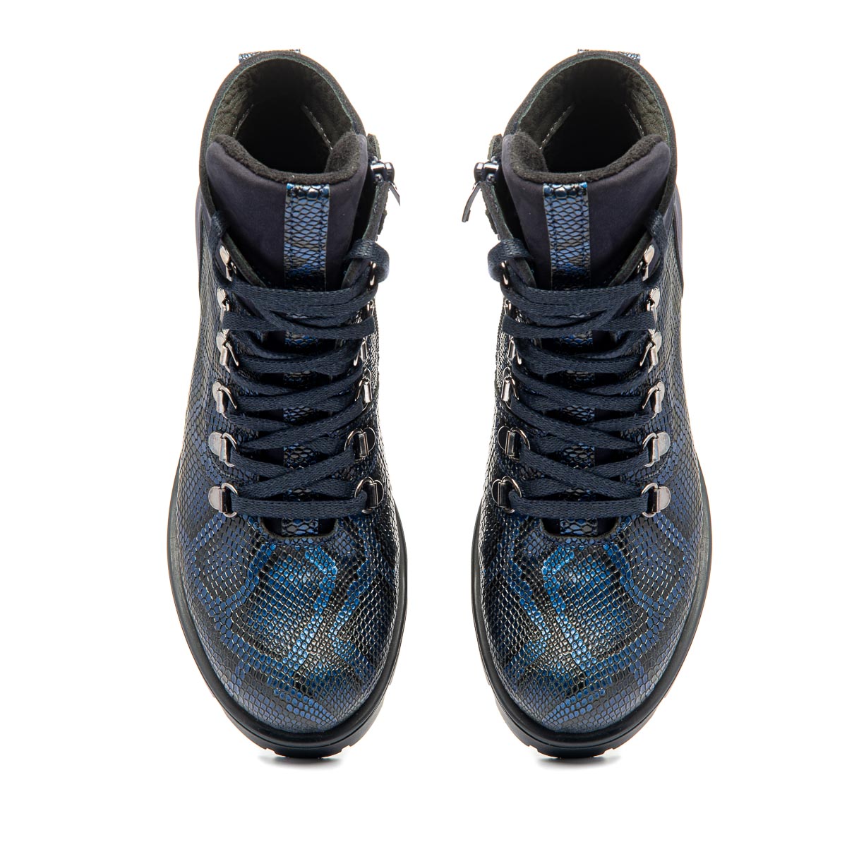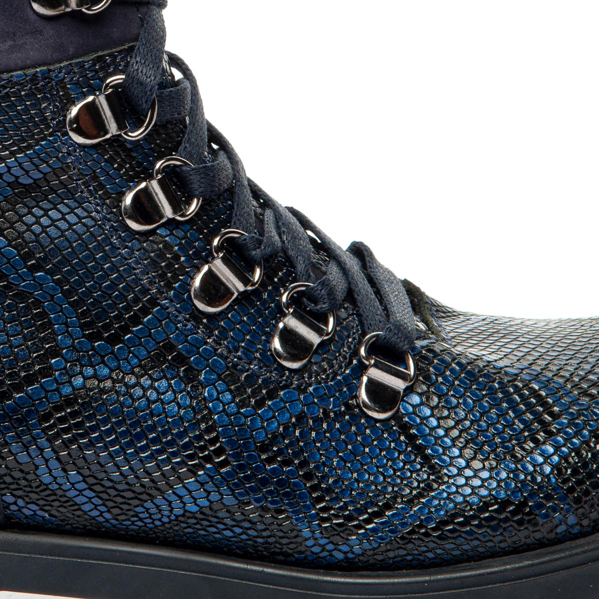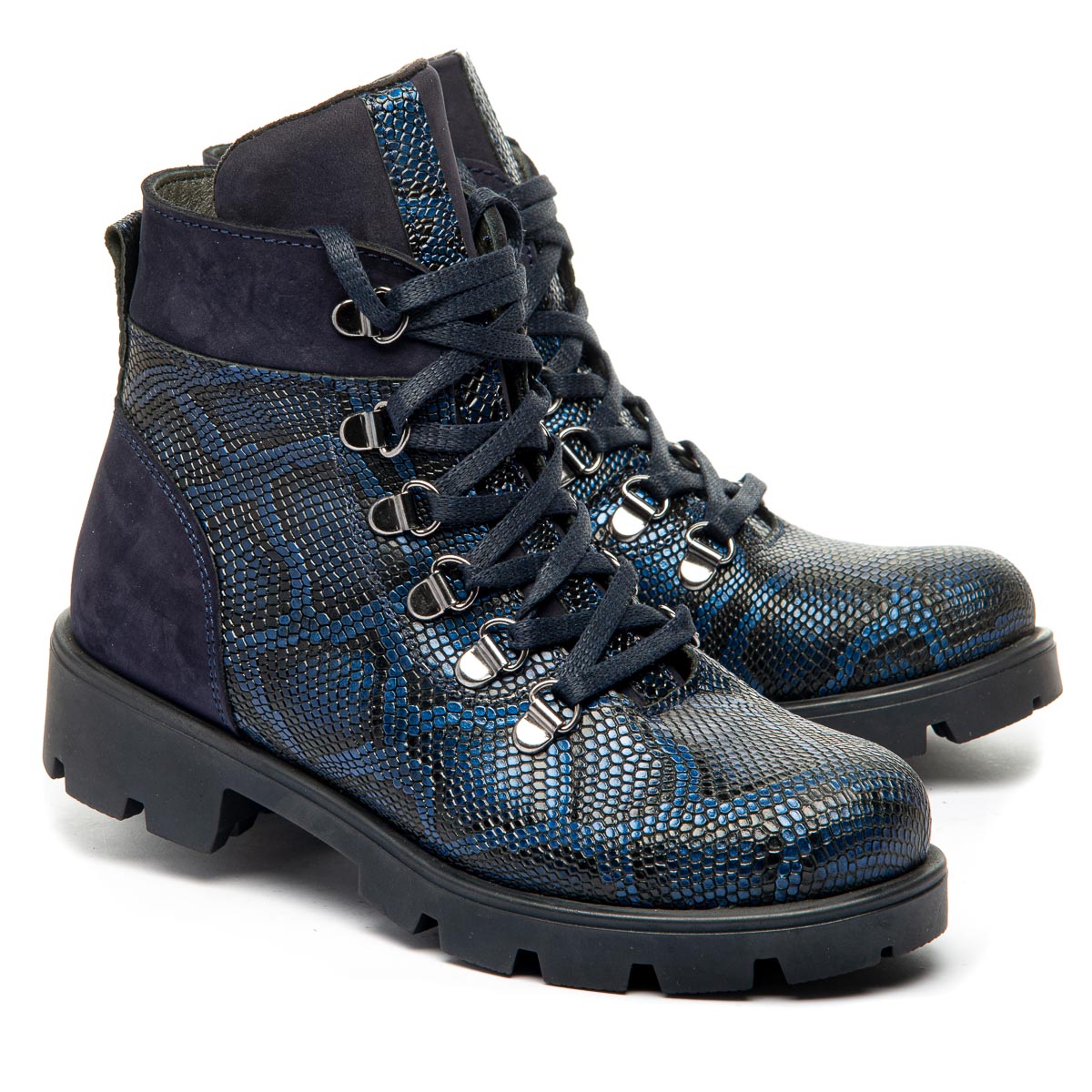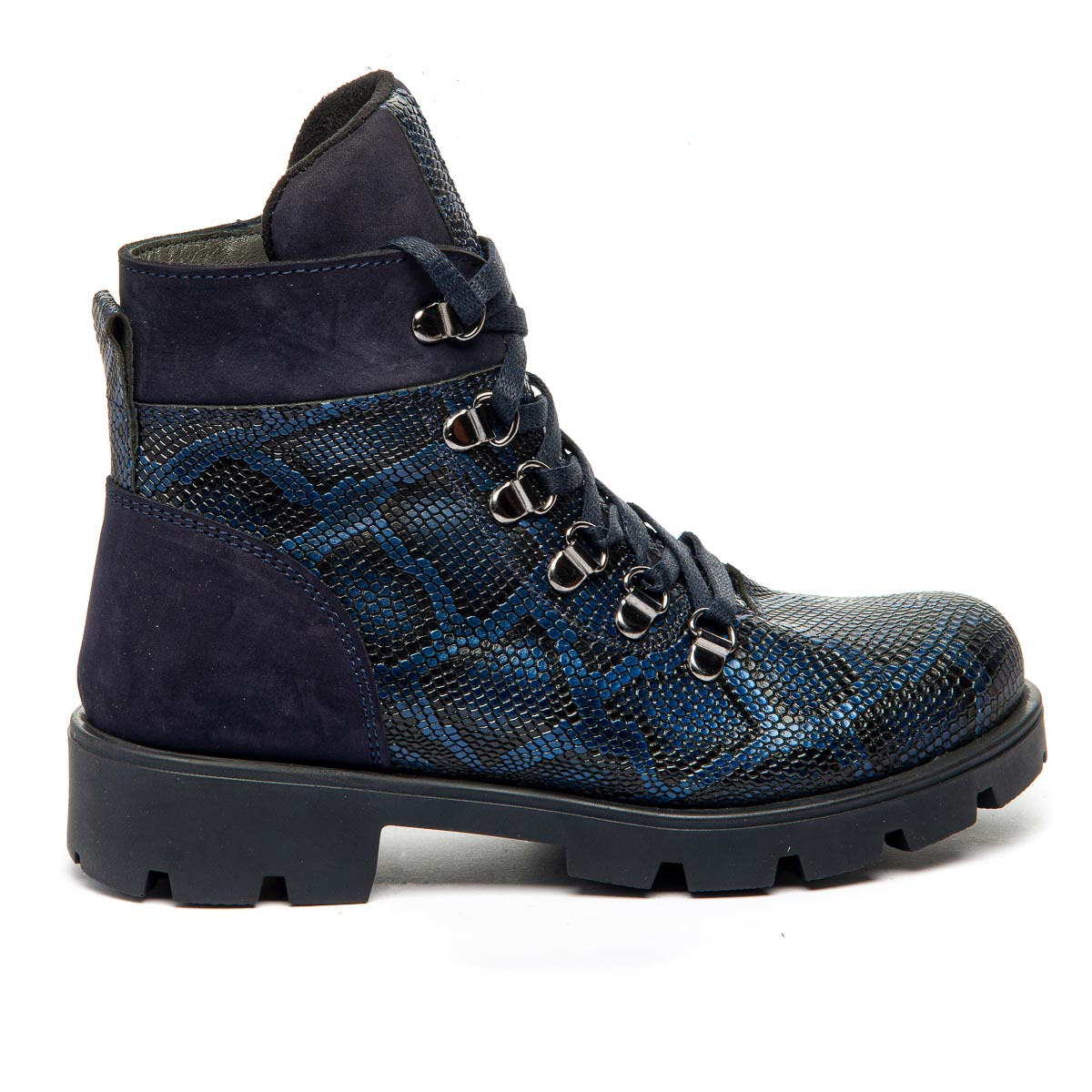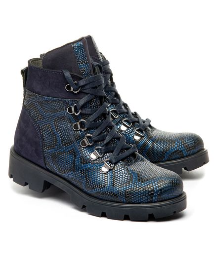 Модель восхищает своим оригинальным дизайном: ботинки синего цвета из натуральной кожи, имитирующей змеиную. Для удобства обувания предусмотрены шнуровка на металлических петлях и боковая молния. Внутренняя часть ботинок отделана мягким флисовым утеплителем. Кожаная стелька с супинатором поддерживает правильное положение стопы. Эти ботинки гармонично впишутся в любой гардероб, придавая ему оригинальность и стиль, подчеркивая уникальность.