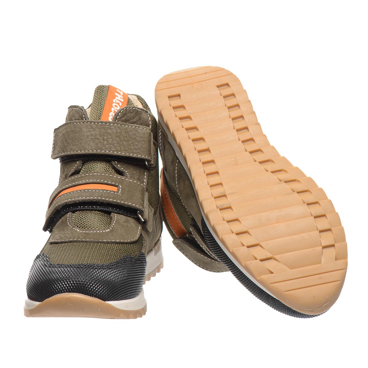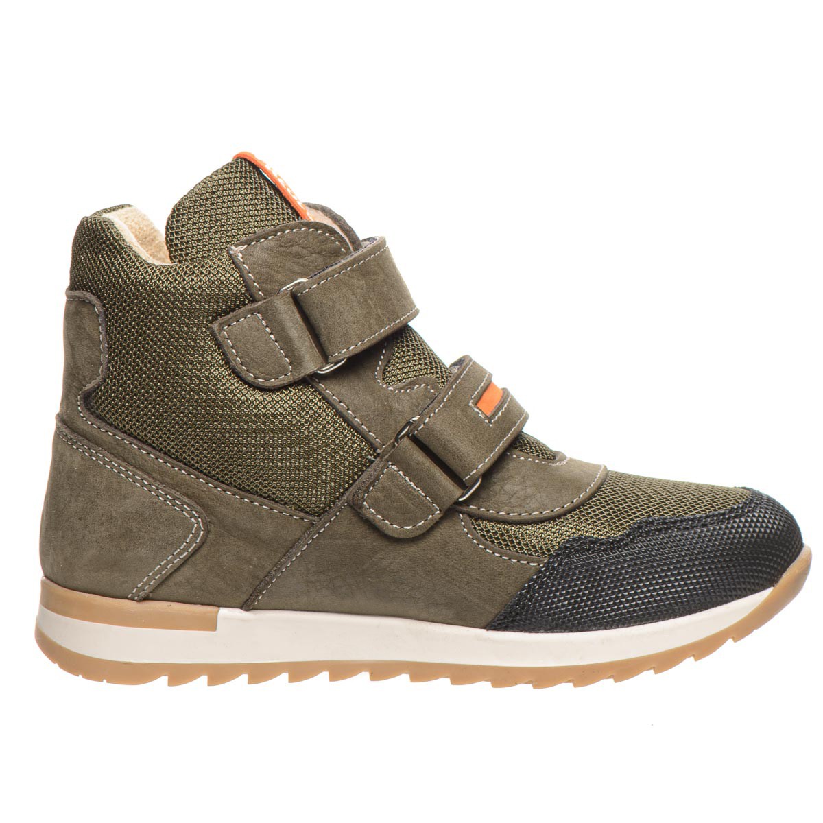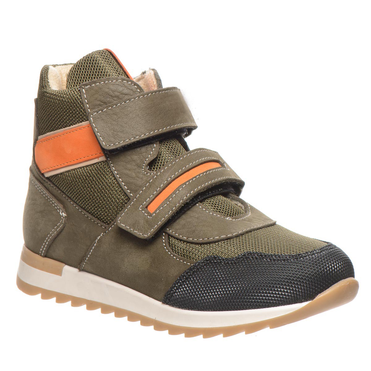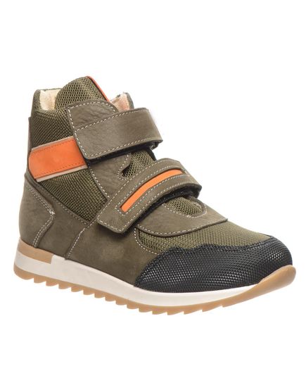 Эти ботинки, выполненные в цвете хаки, изготовленные из натурального нубука и водоотталкивающего текстиля, оснащены двумя липучками для быстрого и удобного обувания. Мягкая флисовая подкладка обеспечивает тепло, а кожаная стелька с анатомическим супинатором и жесткий задник поддерживает здоровье детских ножек. Передняя часть обуви усилена устойчивым материалом, надежно защищает носок. Подошва из термопластичной резины, имеет отличную амортизацию, делая каждый шаг легким и безопасным. Это замечательная обувь для осени.