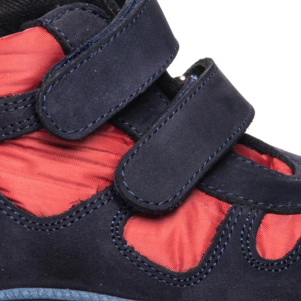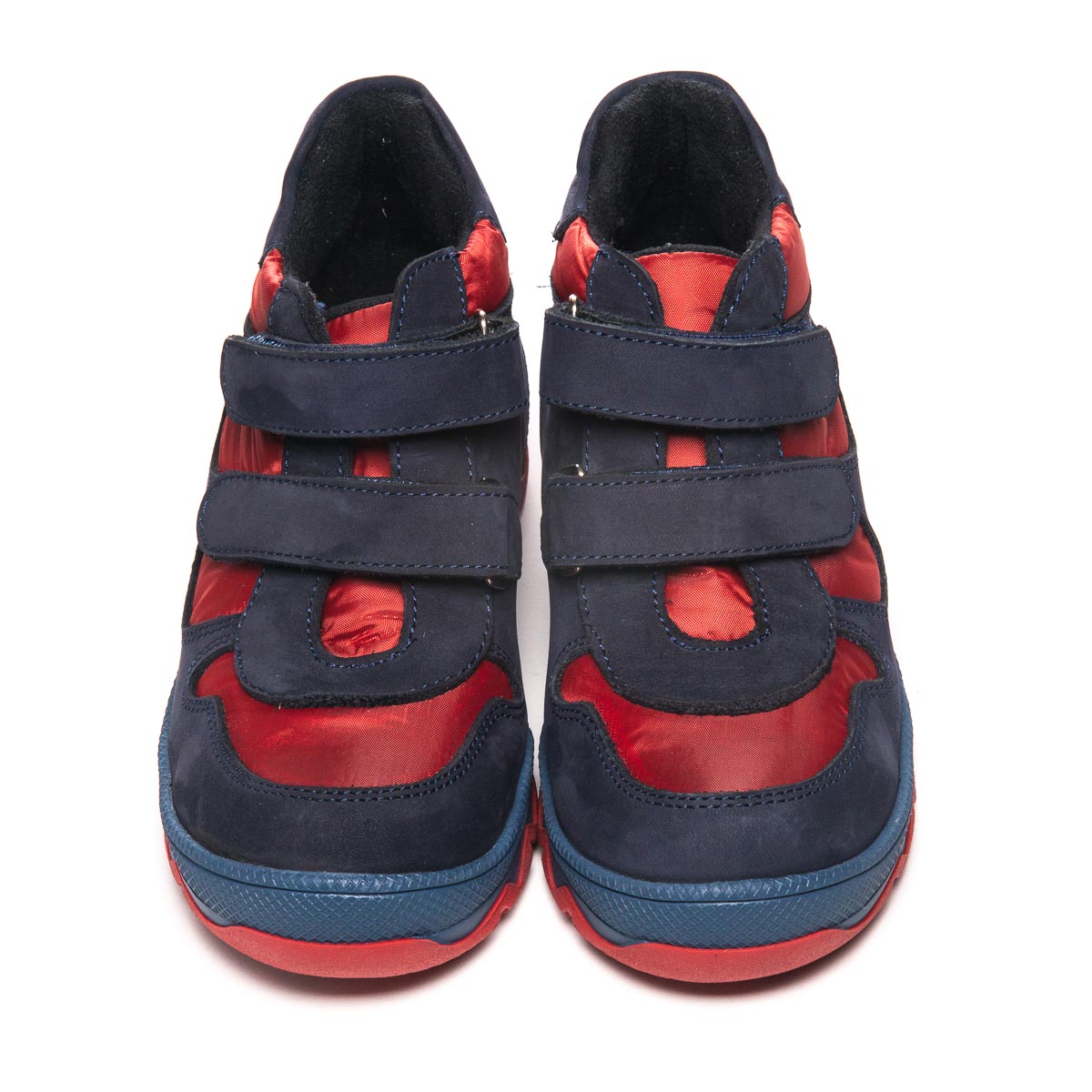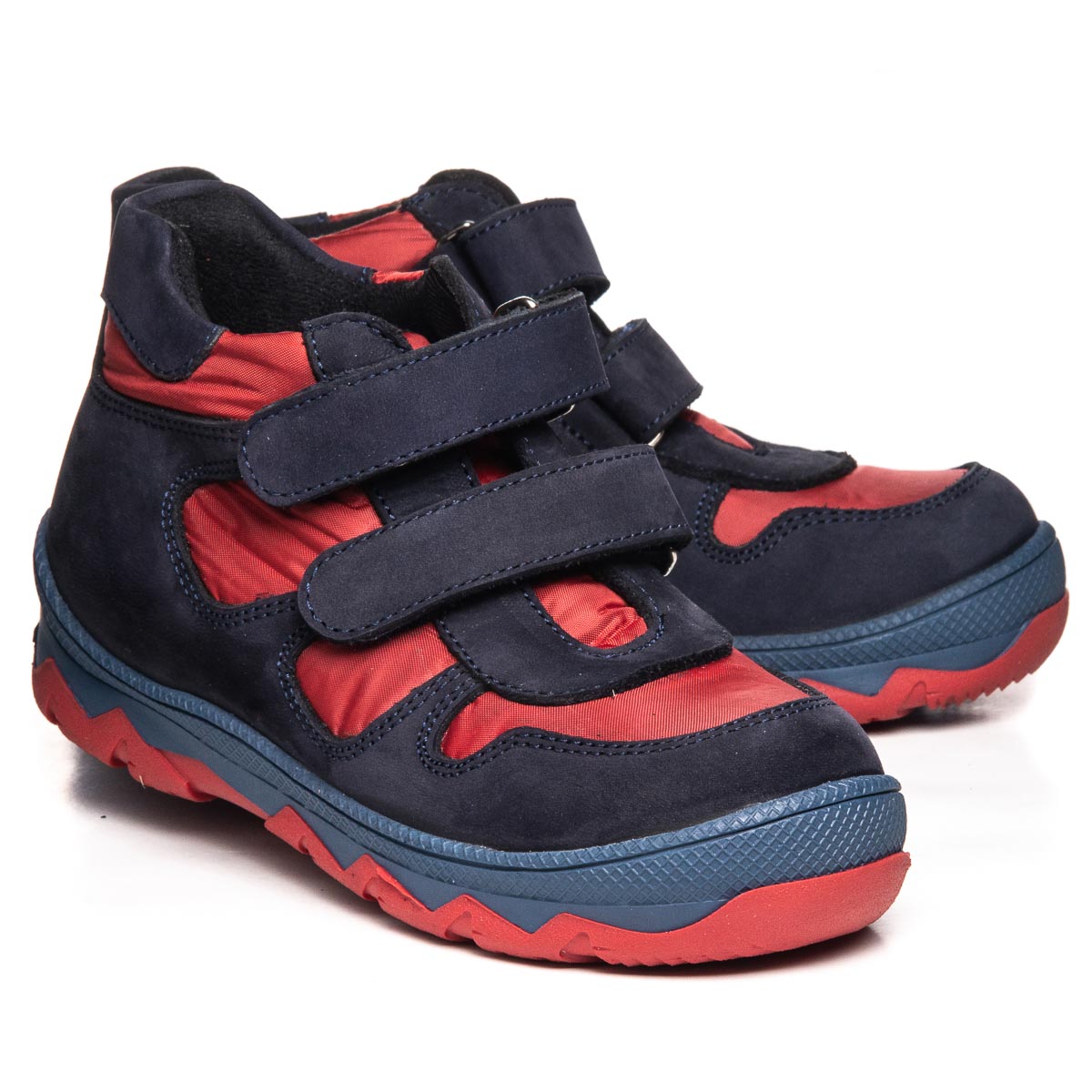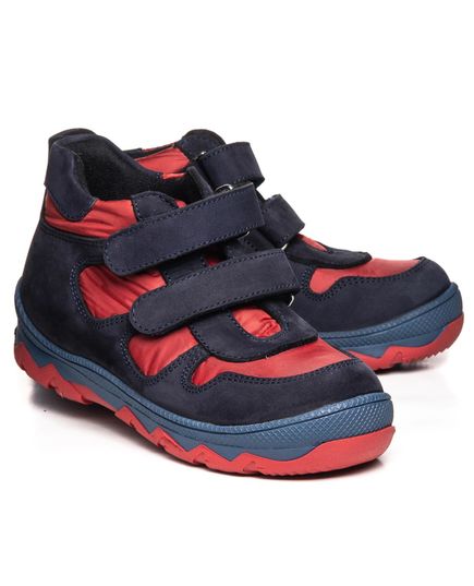 Демисезонные ботинки из натурального синего нубука с яркими, красными текстильными вставками, выглядят стильно и ярко. Они надежно фиксируются на ноге благодаря двум липучкам, что обеспечивает легкость в обувании. Утепленная флисовая подкладка гарантирует тепло и комфорт, а стелька из натуральной кожи с супинатором поддерживает правильное положение стопы. Подошва из термопластичной резины не скользит и обеспечивает отличную амортизацию, что делает эти ботинки идеальными для активного досуга в холодные дни.