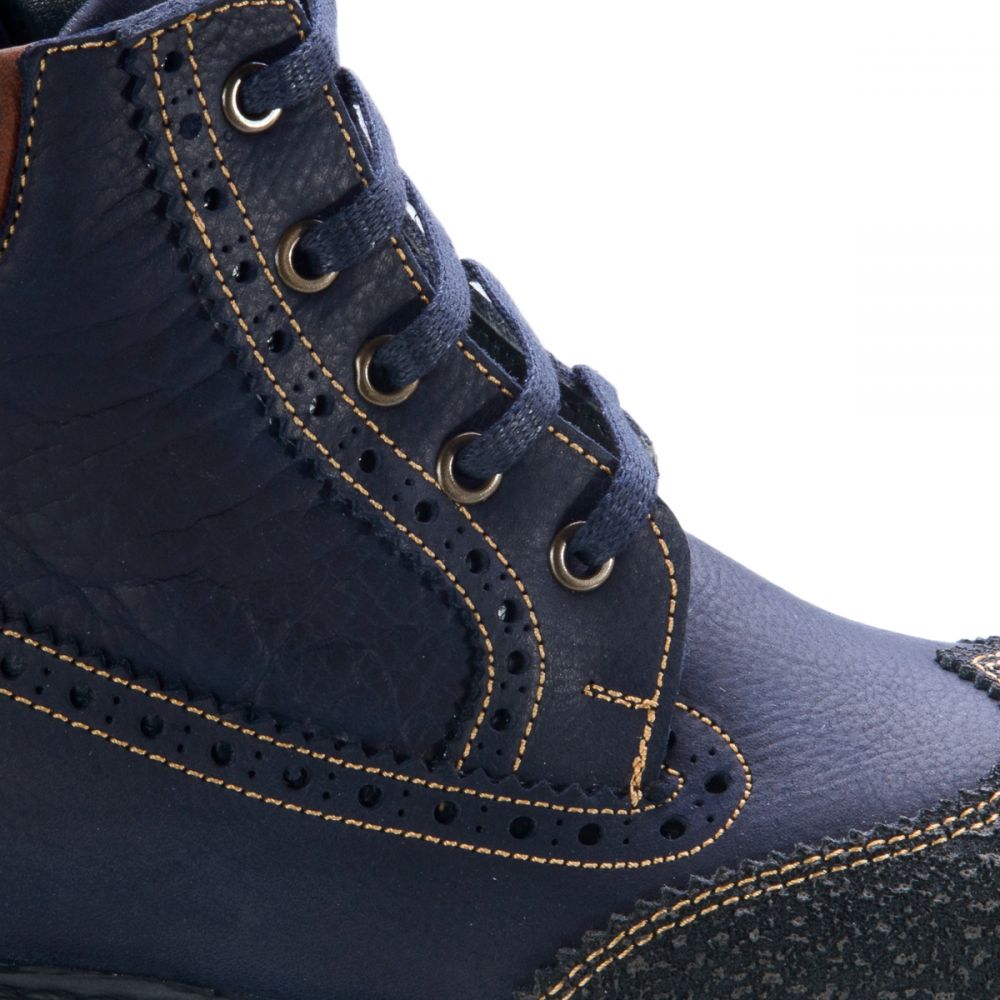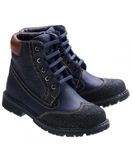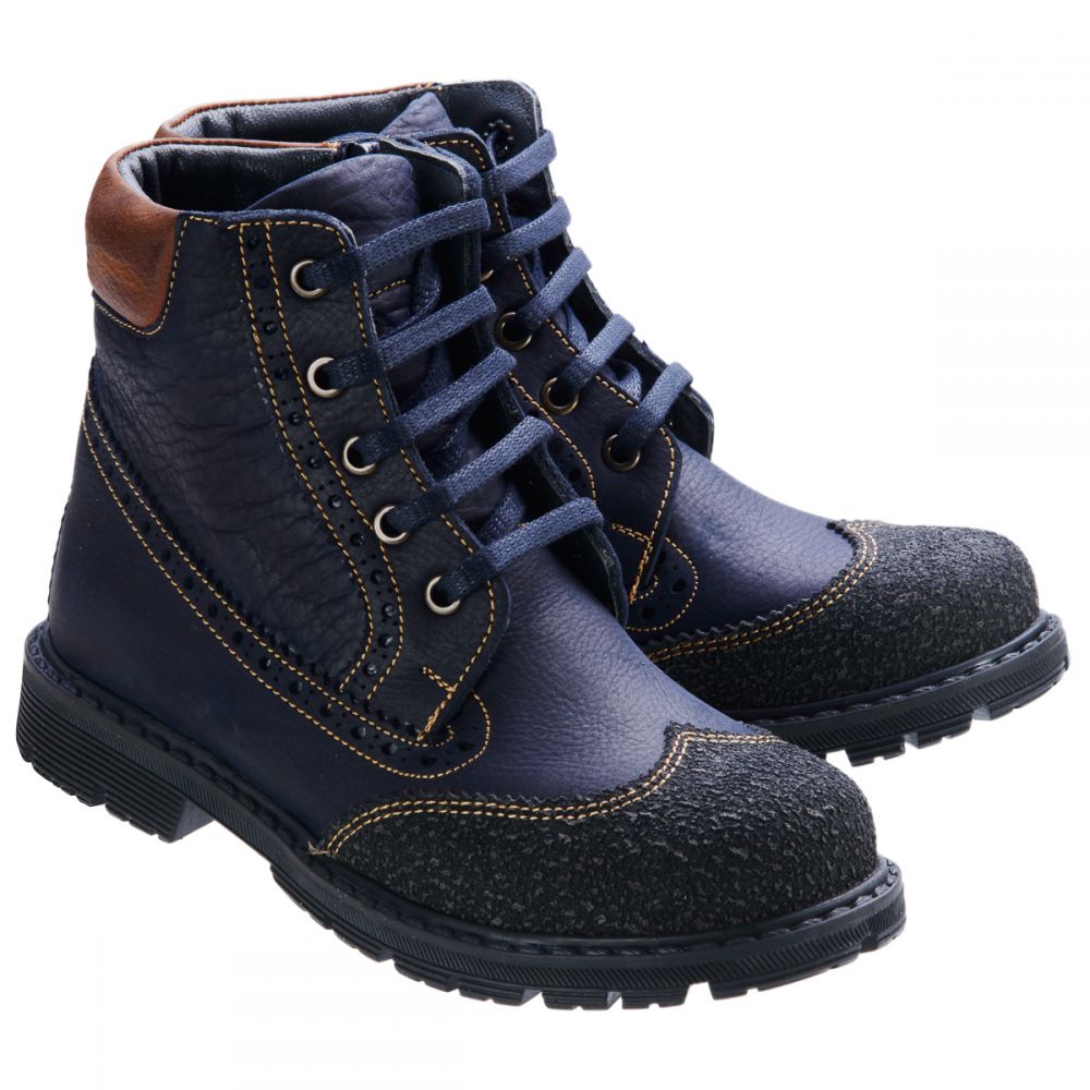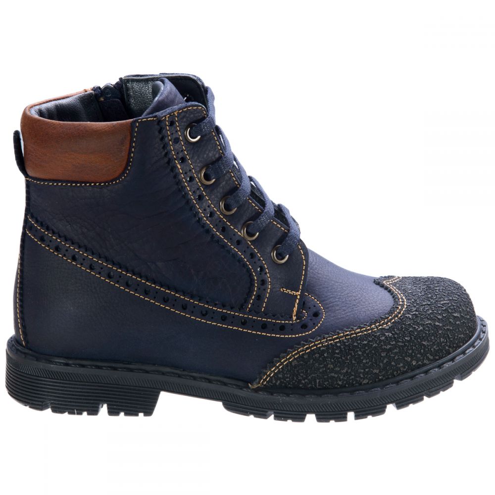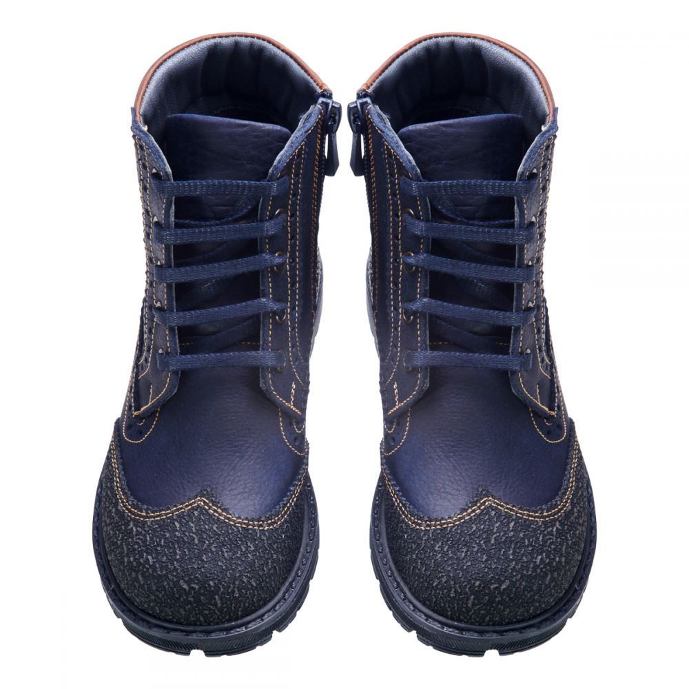 Осенние ботинки для мальчика выполнены из натуральной кожи синего цвета с добавлением коричневого. Носочная часть декорирована вставкой из прочного материала для предотвращения потертостей при использовании. С помощью шнурков и молнии на внутренней стороне легко и просто снимать, обувать и фиксировать на ноге. Благодаря утепленному флису ноги будут в тепле даже в самые сырые и холодные дни. Стелька с анатомическим супинатором - натуральная кожа. Подошва - термопластичная резина, не скользит и устойчива к температурам. Отличный выбор как под брюки, так и под джинсы. Осень - лишний повод приобрести стильную и яркую обувь.
