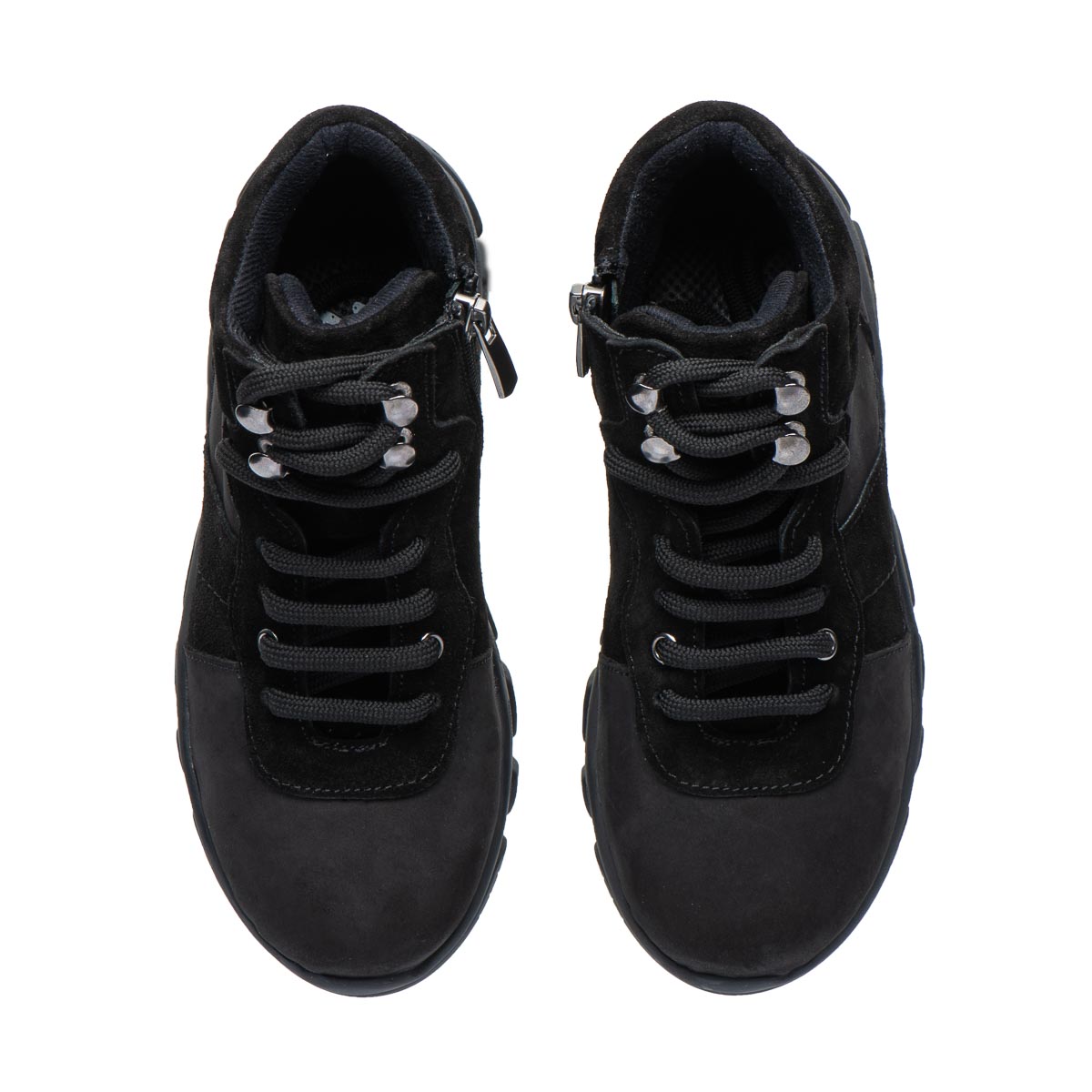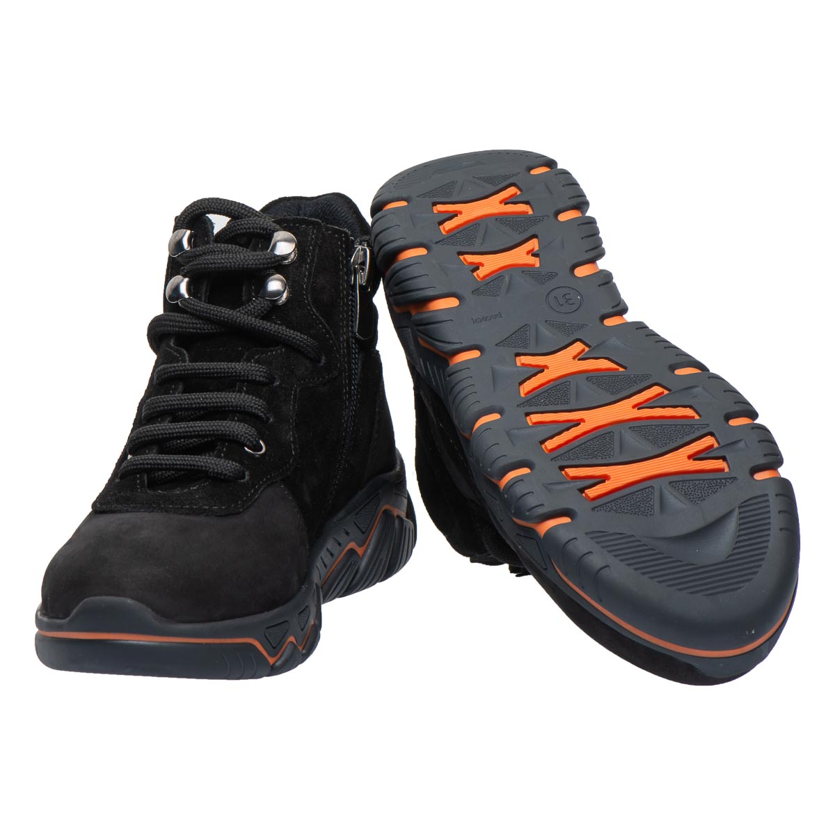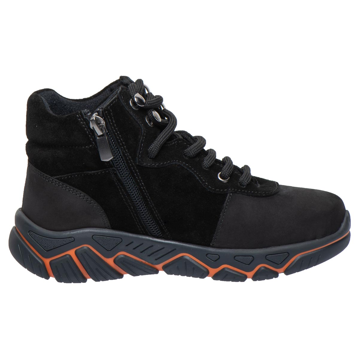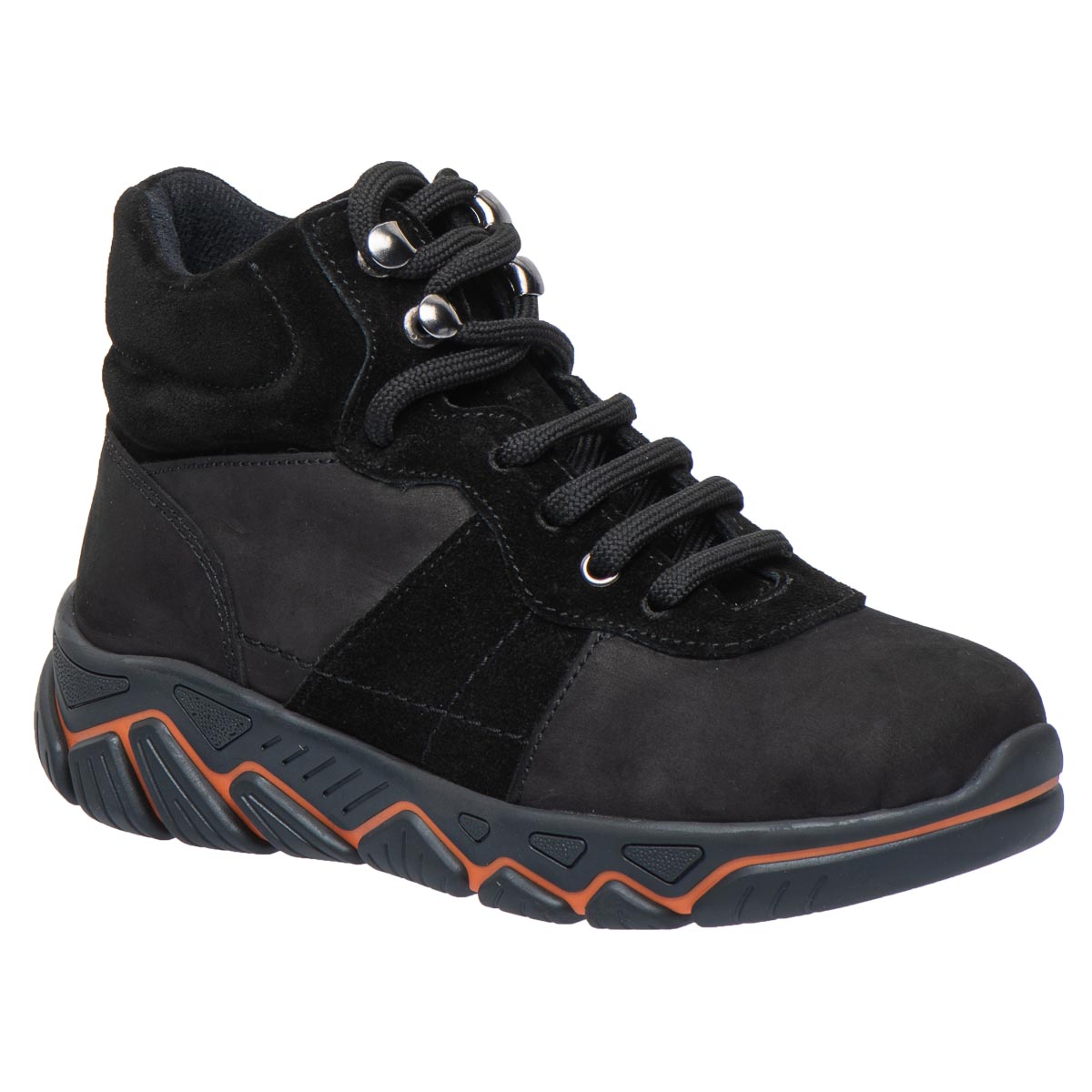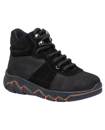 Стильные ботинки из натурального нубука, выполненные в практичном черном цвете с акцентом на подошву с яркими элементами. Комбинация шнуровки и боковой молнии обеспечивает легкую обувку и надежную фиксацию на ноге. Мягкая стелька с анатомической поддержкой способствует правильному развитию стоп. Эта обувь сочетает в себе прочность, комфорт и стиль, создавая универсальный вариант для демисезонного периода.