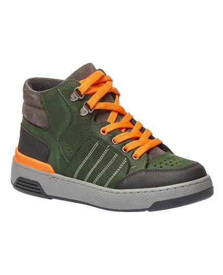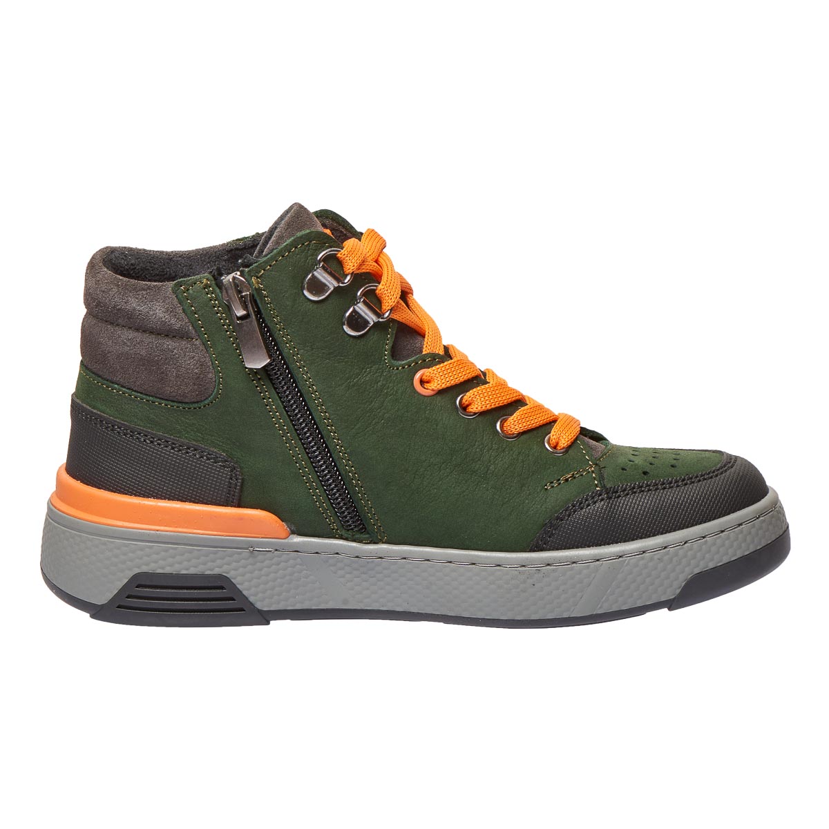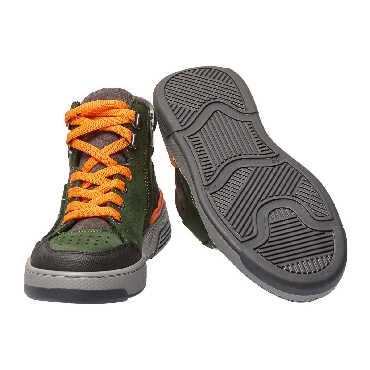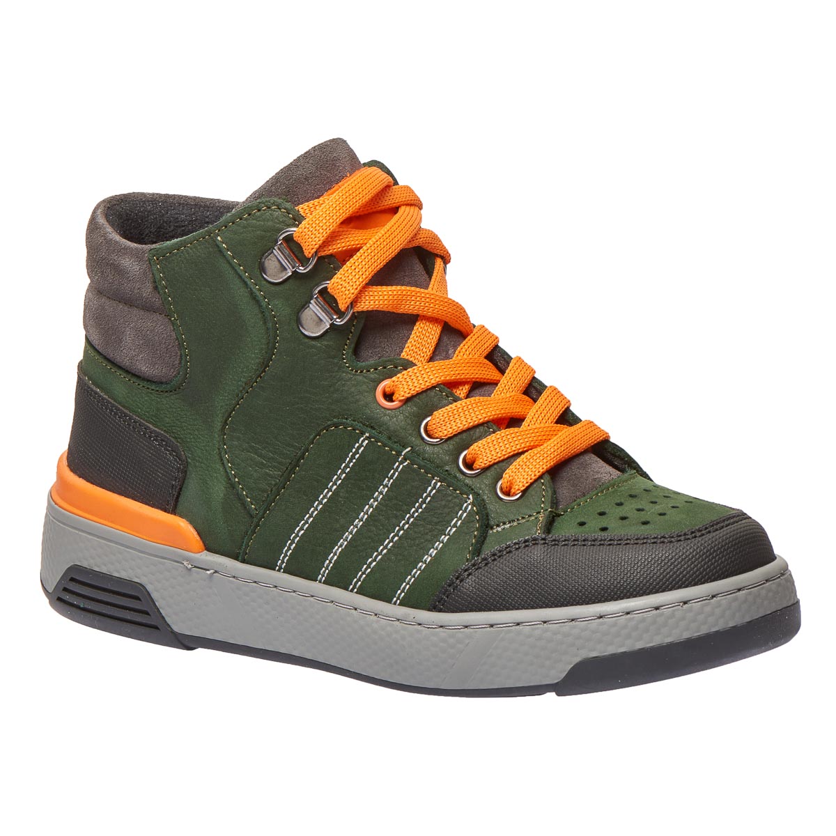 Демисезонные ботинки зеленого цвета, изготовленные из натуральной кожи. Для удобства обувания ботинки оснащены молнией и яркими шнурками, которые не только упрощают процесс одевания, но и добавляют модного акцента. Особенностью модели являются контрастные детали и декоративные швы. Носовая часть и пяточная зона защищены от повреждений благодаря современному искусственному материалу. Эта модель не только имеет стильный вид, но и учитывает важные ортопедические элементы для максимального комфорта. Жесткий задник, супинатор и анатомически правильная стелька с подушечкой под свод стопы гарантируют правильную поддержку ножек.