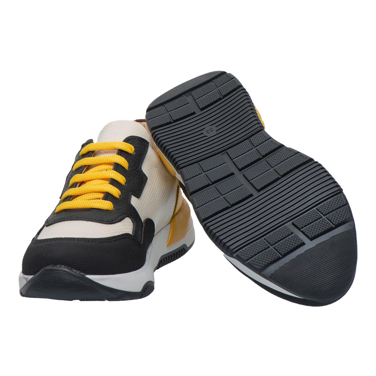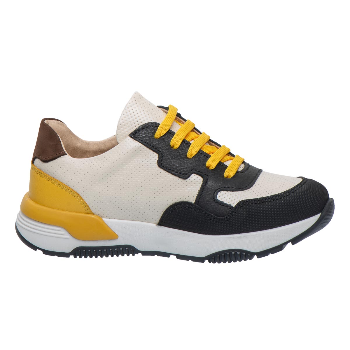 Яркие детские кроссовки в сочетании желтого, бежевого и черного цветов создают стильный и современный вид. Модель изготовлена из натуральной кожи как снаружи, так и внутри, что обеспечивает долговечность и комфорт. Усиленная передняя часть защищает обувь от быстрого износа. Внутри — анатомический супинатор с ортопедической стелькой, поддерживающий правильное положение стопы. Гибкая подошва из термопластичной резины дарит устойчивость, а классическая шнуровка надежно фиксирует обувь на ноге. Идеальный выбор для активных детей.