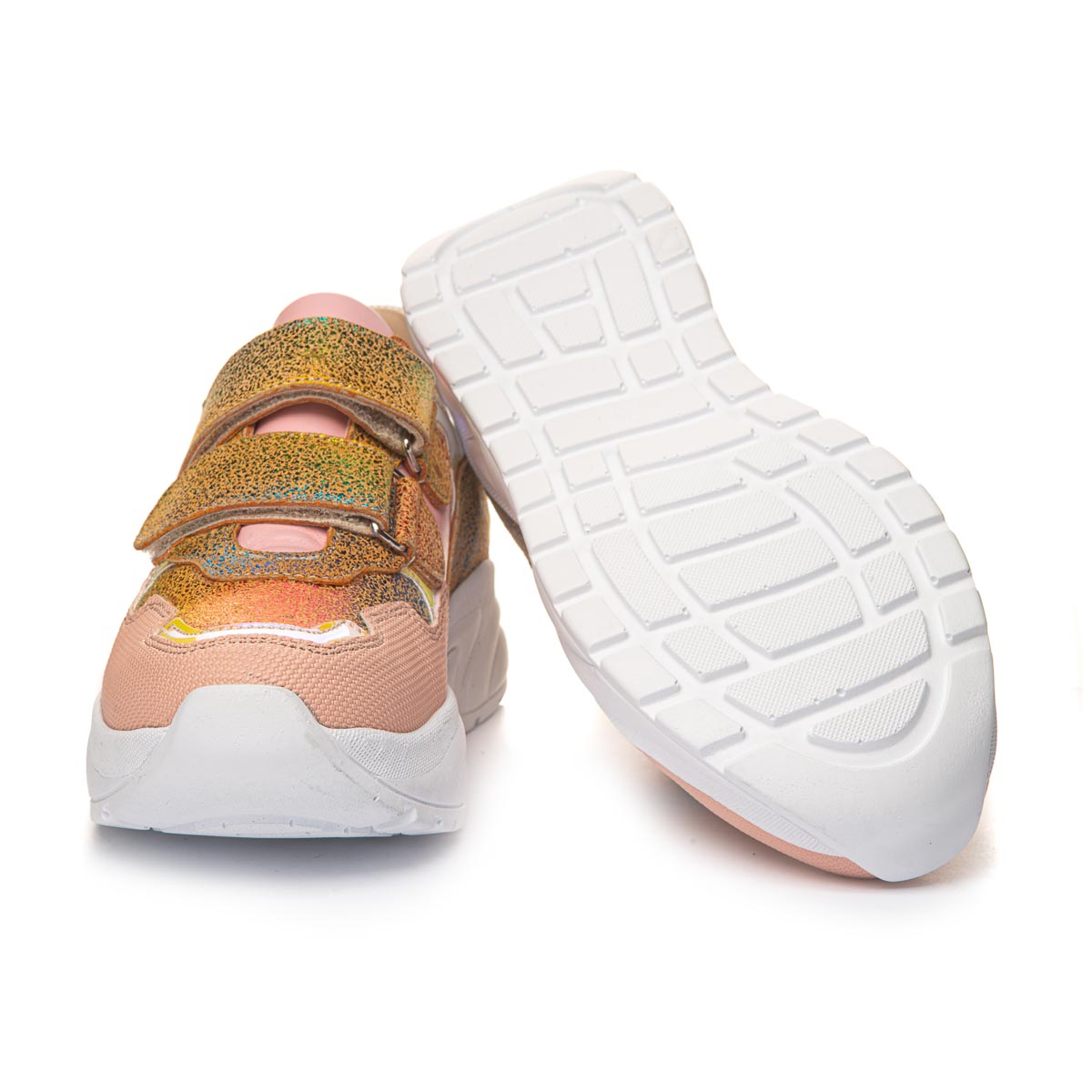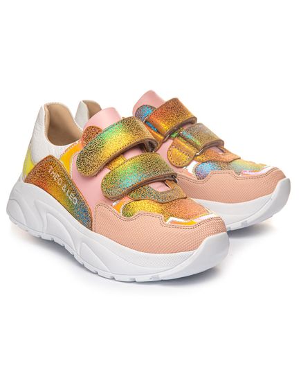 Пудровые кроссовки для девочки, украшены яркими вставки, которые сверкают  в цветах от желтого до голубого. Имеют дополнительную защиту от царапин - укрепленную переднюю часть, за счет специальной накладки, которая защищает от повреждений. Две липучки-застежки позволяют легко надевать и снимать обувь. Ортопедическая стелька с анатомическим супинатором поддерживает правильное положение стопы, уменьшая нагрузку на суставы и мышцы. А жесткий задник оказывает дополнительную поддержку. Их уникальный дизайн обязательно понравится любой девочке.