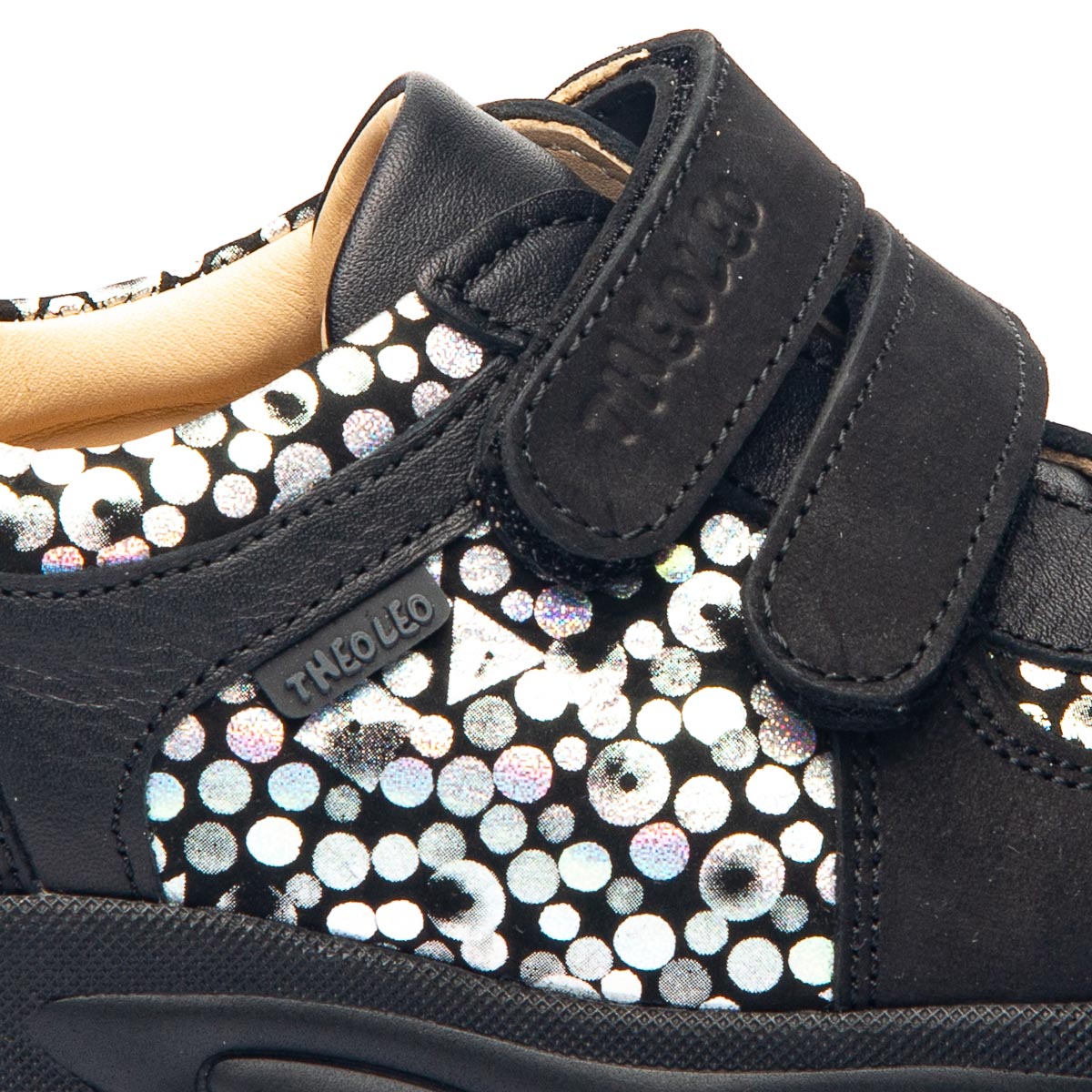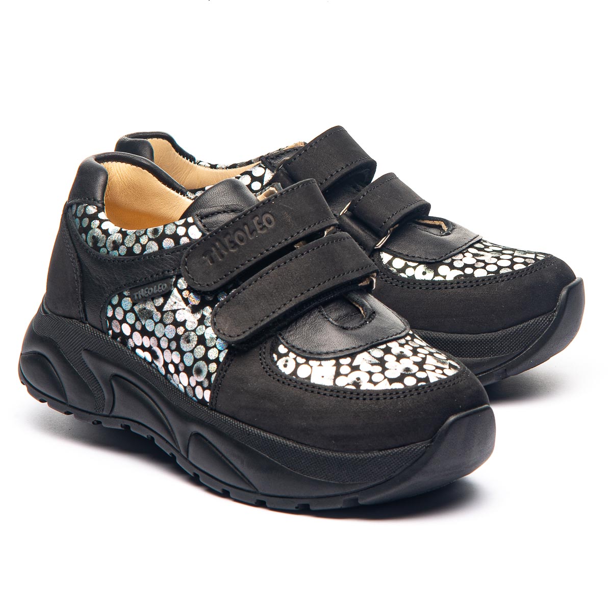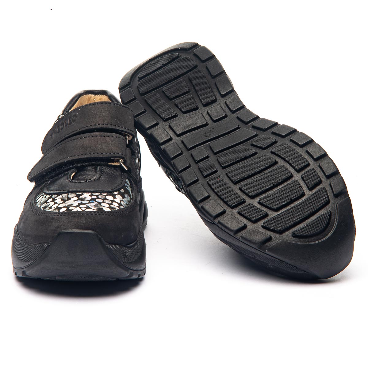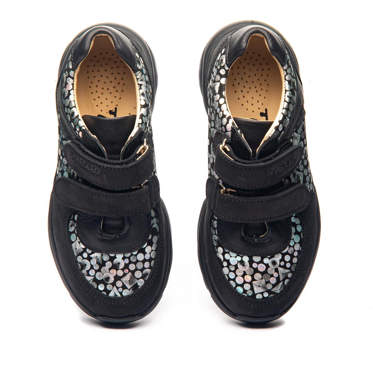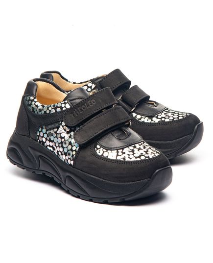 Кроссовки для девочек, выполнены из натурального нубука черного цвета, и декорированы серебряным узором по бокам. Две липучки-застежки позволяют легко надевать и снимать обувь ребенку самостоятельно. Ортопедическая стелька с анатомическим супинатором поддерживает правильное положение стопы, уменьшая нагрузку на суставы и мышцы. А жесткий задник оказывает дополнительную поддержку. Подошва из термопластичной резины. Эти стильные кроссовки идеально подходят для школьных будней.