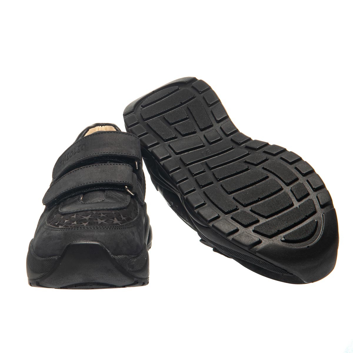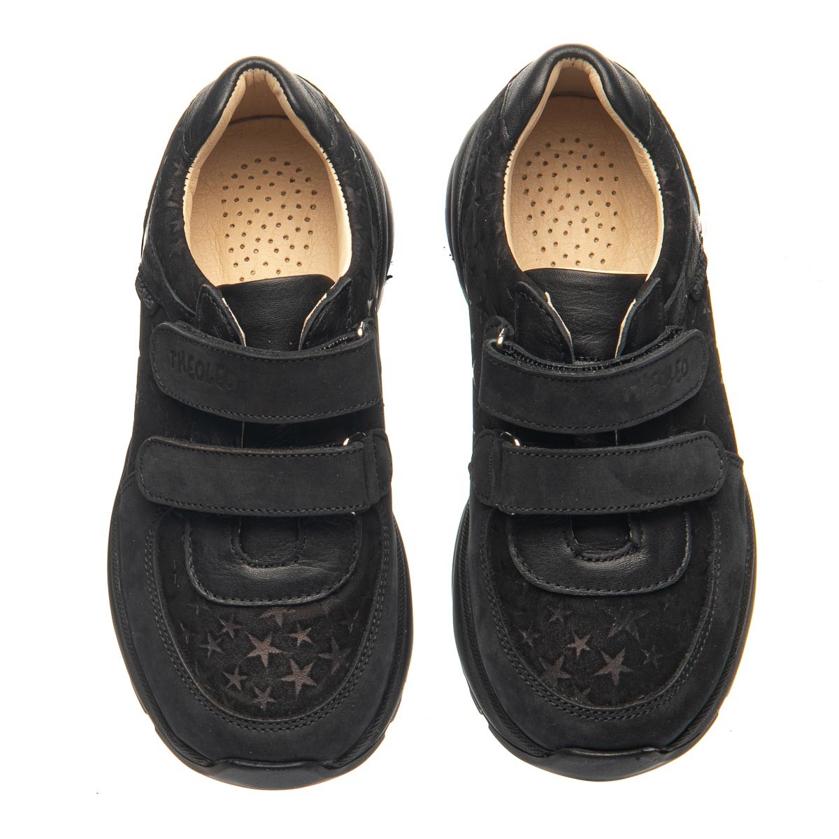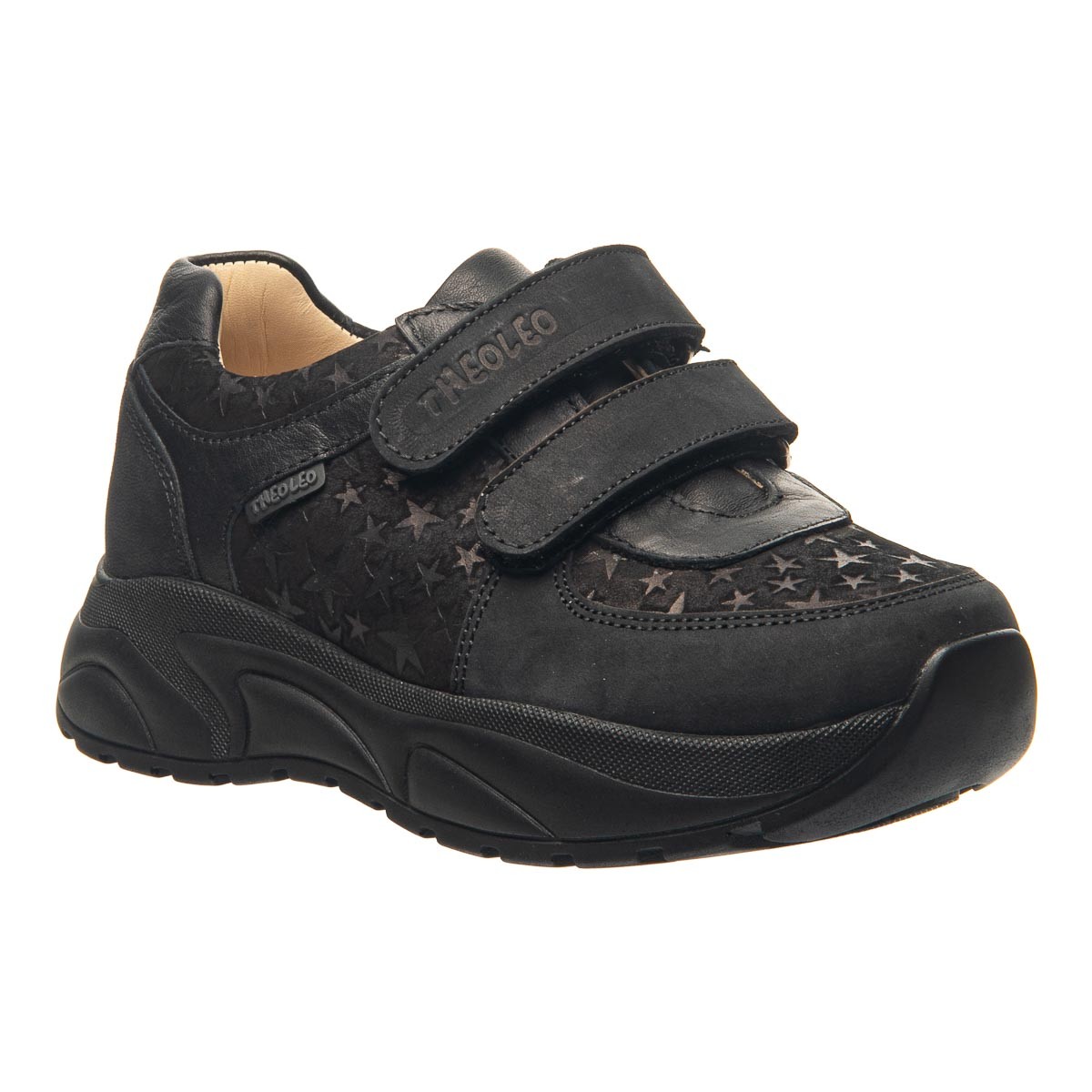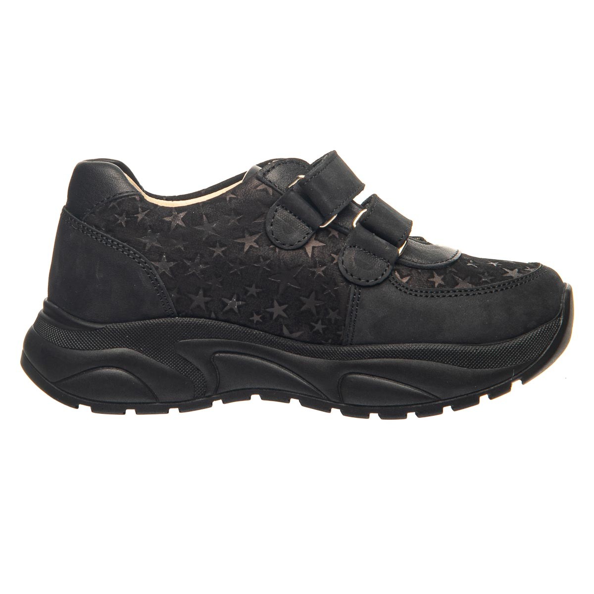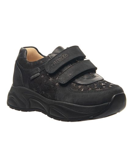 Эти кроссовки для девочек созданы для комфорта и стиля. Изготовленные из качественного нубука в черном цвете, они украшены тиснением в виде звездочек. Удобство использования гарантировано благодаря двум липучкам, которые позволяют легко и быстро застегнуть обувь. Оснащены анатомическим супинатором для правильного формирования стопы и комфорта при ходьбе. Подошва из термопластичной резины. Эти кроссовки станут ярким акцентом в гардеробе вашей маленькой модницы, сочетая дизайн и практичность.