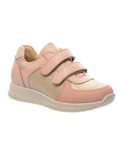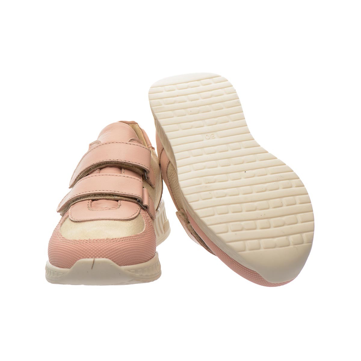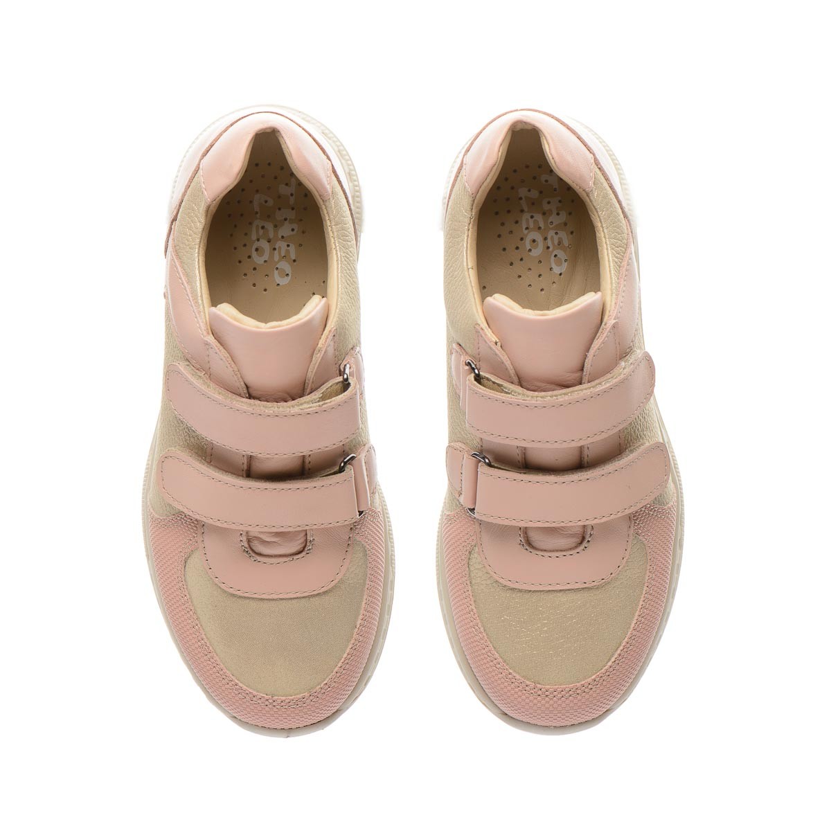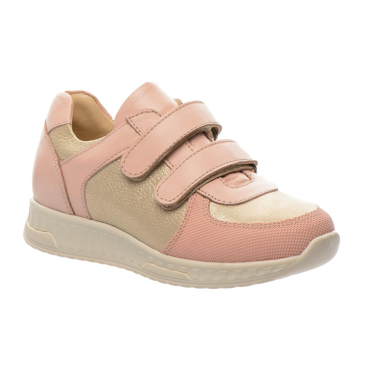 Кроссовки для девочки поражают своим роскошным и модным дизайном. Они выполнены из натуральной кожи в изысканном цвете пудры и дополнены вставками в золотом оттенке. Имеют дополнительную защиту от царапин. Две липучки-застежки позволяют легко надевать и снимать обувь. Ортопедическая стелька с анатомическим супинатором поддерживает правильное положение стопы, уменьшая нагрузку на суставы и мышцы. А жесткий задник оказывает дополнительную поддержку. Подошва из термопластичной резины. Кроссовки будут выглядеть прекрасно как на прогулке в парке, так и во время торжественного мероприятия.