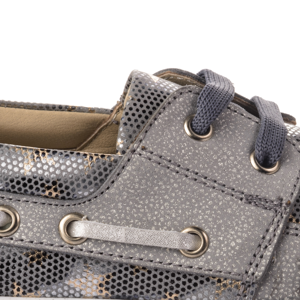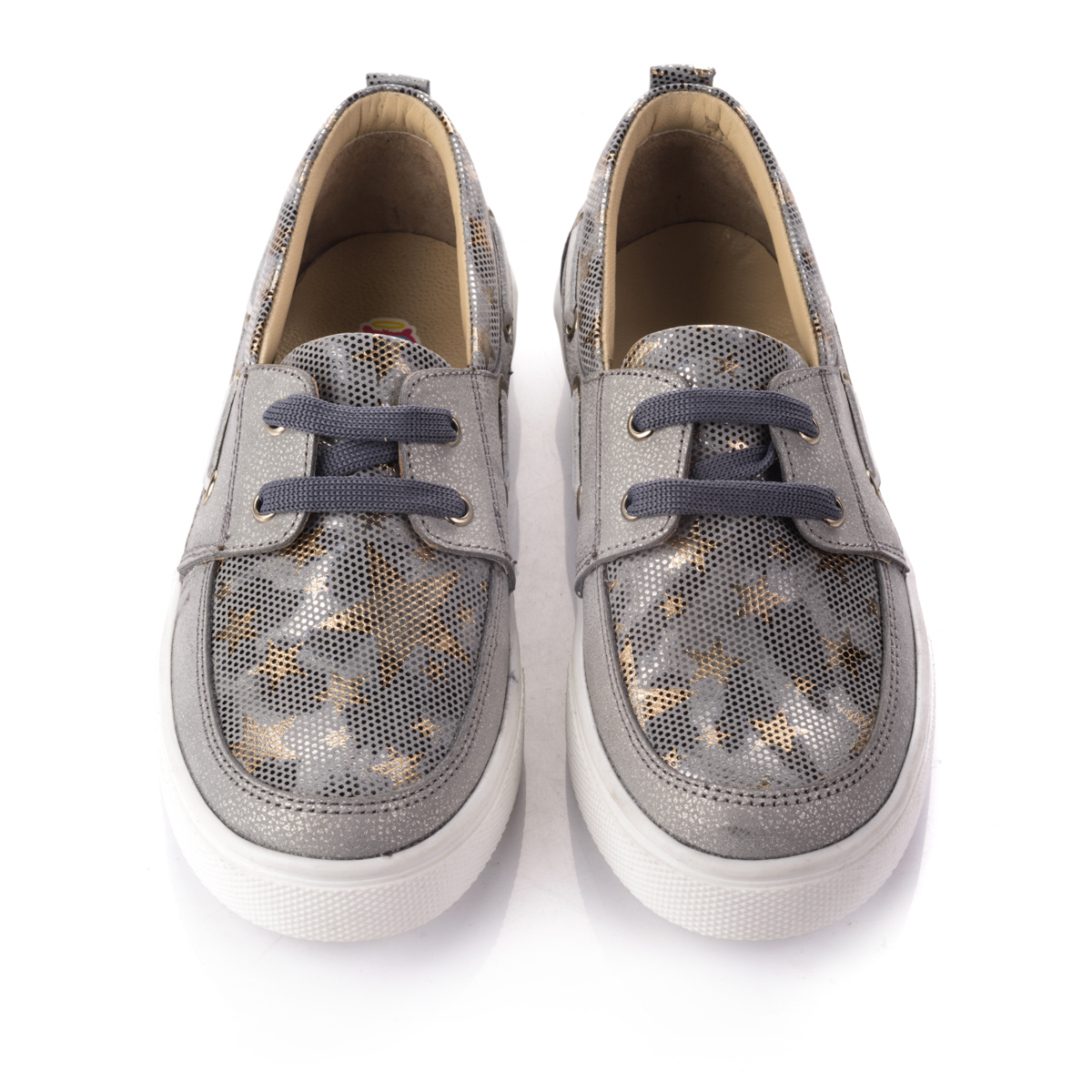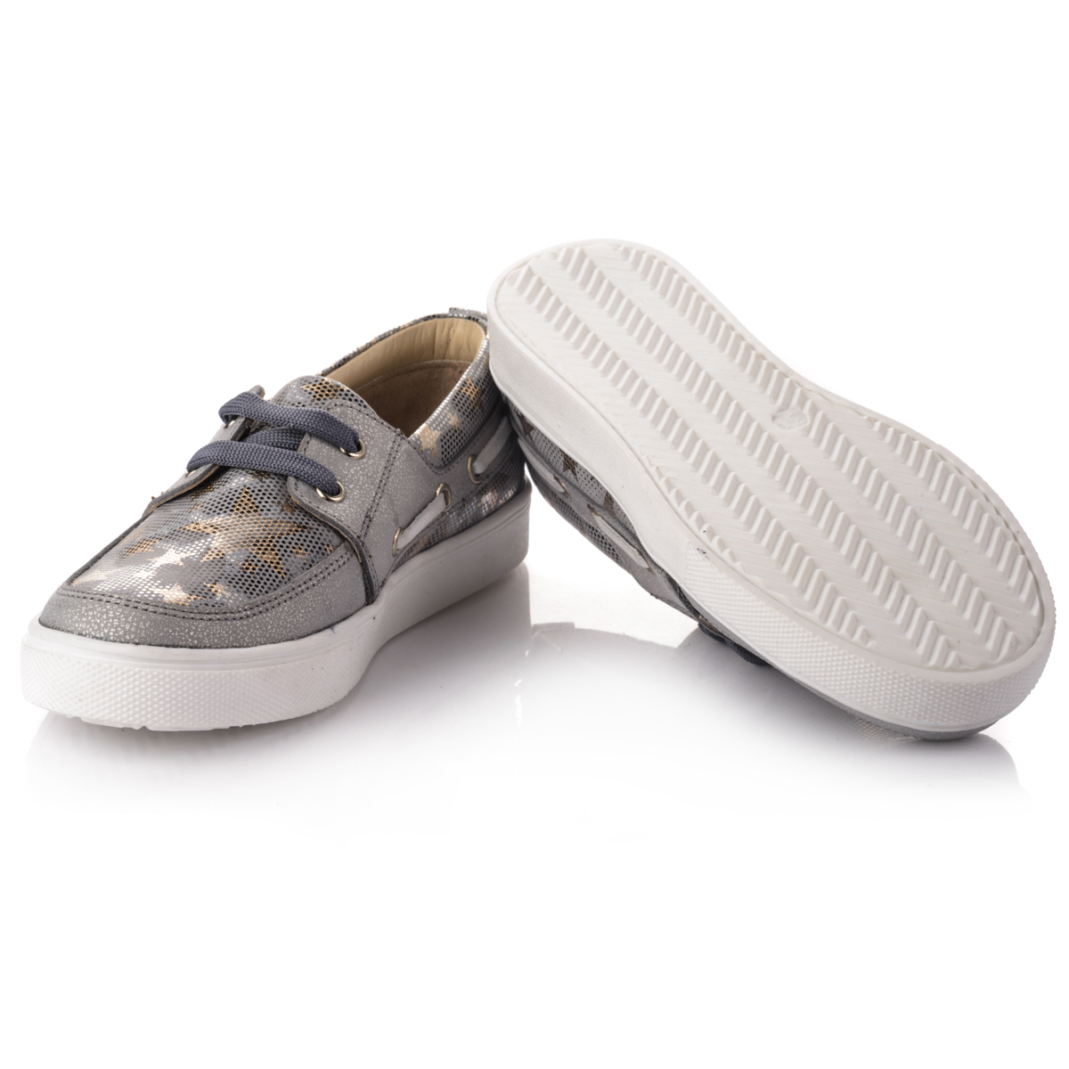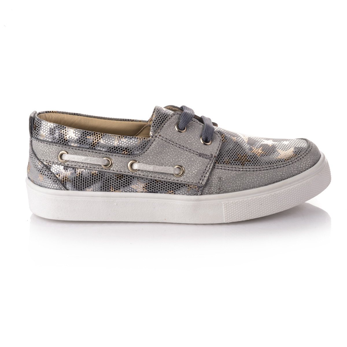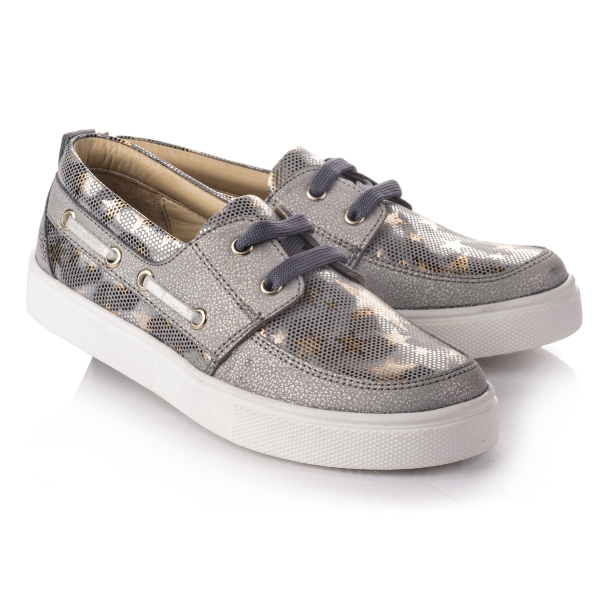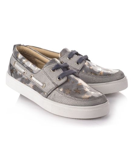 В эти ультрамодные блестящие кроссовки невозможно не влюбиться с первого взгляда. Сочетание удобства и стиля, они не оставят вас равнодушными. Выполнены из натуральной кожи серебристого цвета в сочетании с вставками под змеиную кожу. Практичные и модные одновременно. Декорированы серыми шнурками по бокам и сверху. Внутри стелька с удобным анатомическим супинатором из натуральной кожи. Внутренняя подкладка также кожаная. Подошва - удобная, нескользящая, из термопластичной резины. В этих кроссовках Ваша дочурка будет выглядеть несравненно!