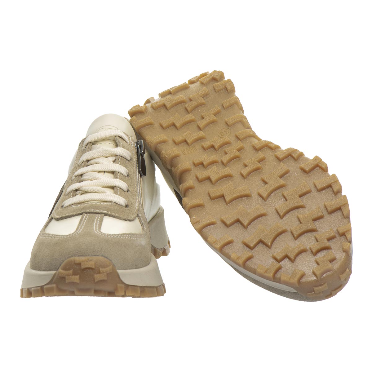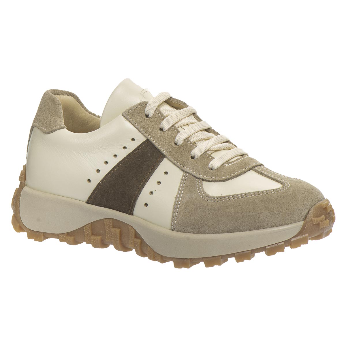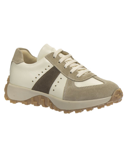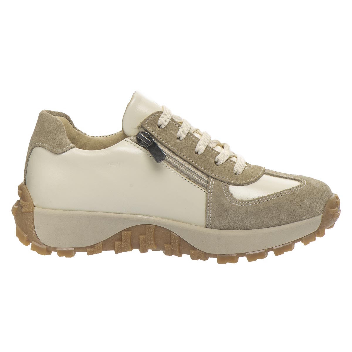 Сдержанный и стильный дизайн этой модели делает ее идеальным дополнением к любому гардеробу. Кроссовки изготовлены из натуральной кожи и из замши в бежевых тонах. Внутренняя часть обуви имеет кожаную подкладку и стельку. Ребристая подошва обеспечивает удобство и стабильность во время ходьбы. А сочетание шнуровки и боковой молнии обеспечивает легкое обувание и надежную фиксацию ножки. Стелька с анатомическим супинатором для правильного формирования детской стопы, а жесткий задник обеспечивает дополнительную поддержку.
