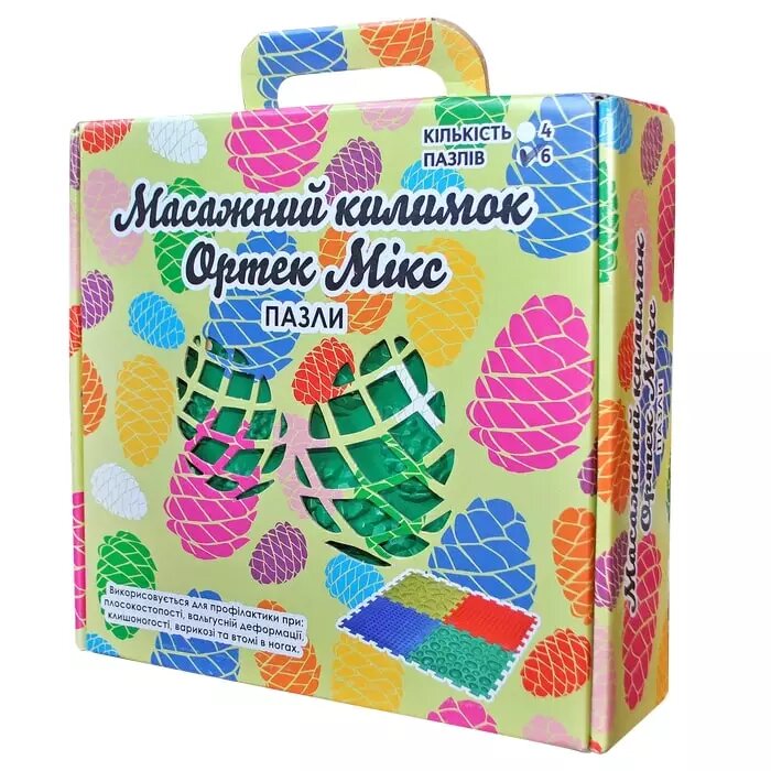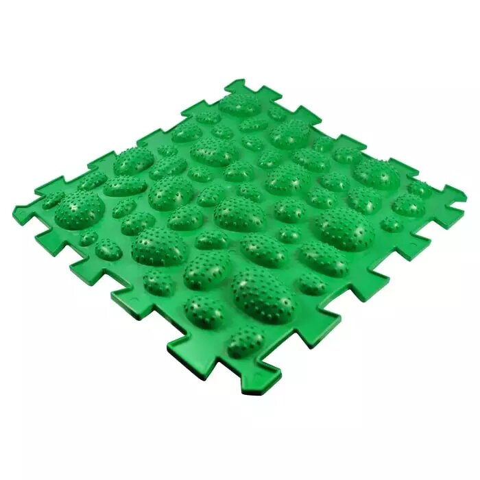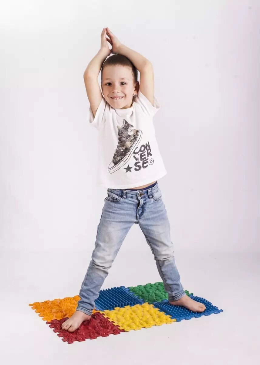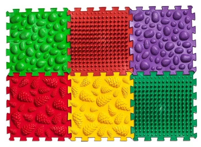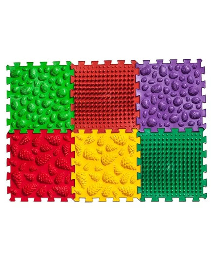 Модульный массажный коврик (6 элементов). Массажные элементы различной формы оптимально подобраны для эффективной тренировки мышц стопы. Коврик изготовлен из экологически чистого, гипоаллергенного материала на основе ПВХ, который надежно амортизирует ударную нагрузку.