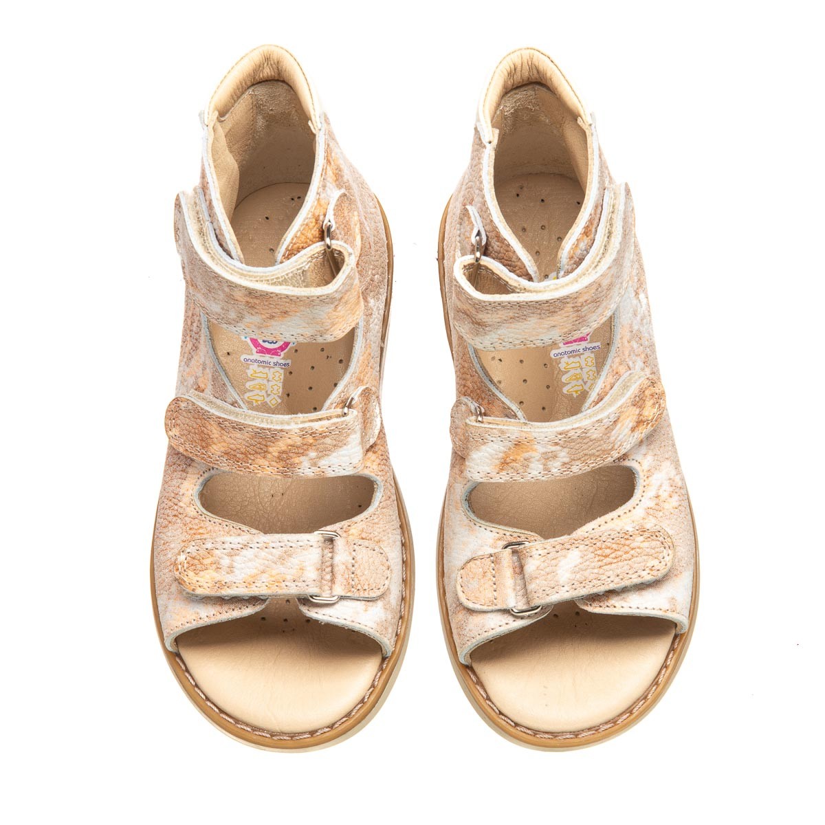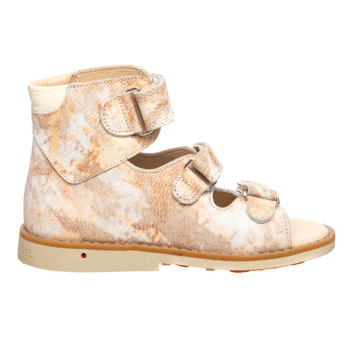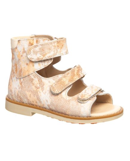 Ортопедические босоножки для девочек имеют мраморную расцветку, выполнены из натуральной кожи. Три удобные липучки позволяют легко отрегулировать посадку. При создании босоножек соблюдены все необходимые требования к ортопедической обуви: