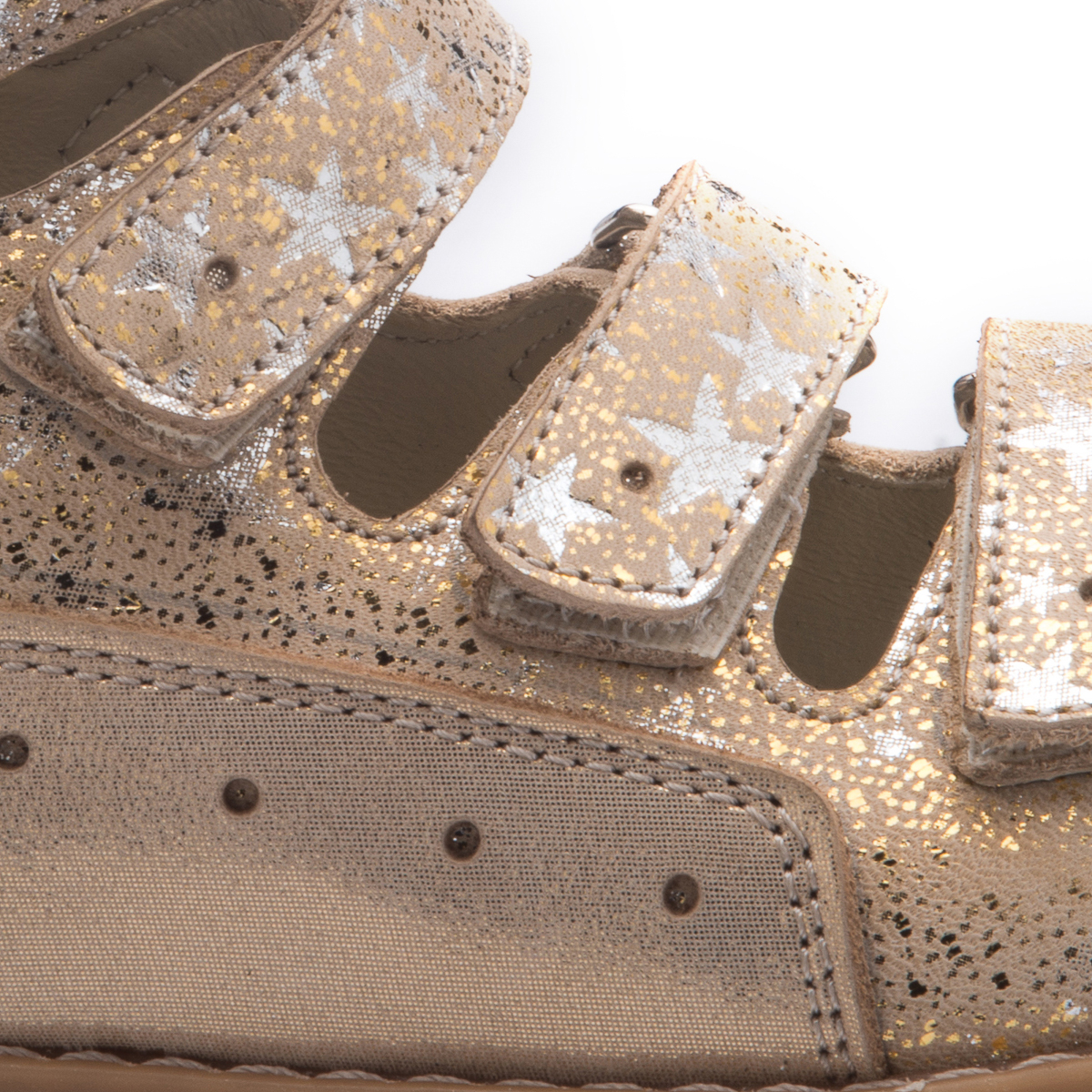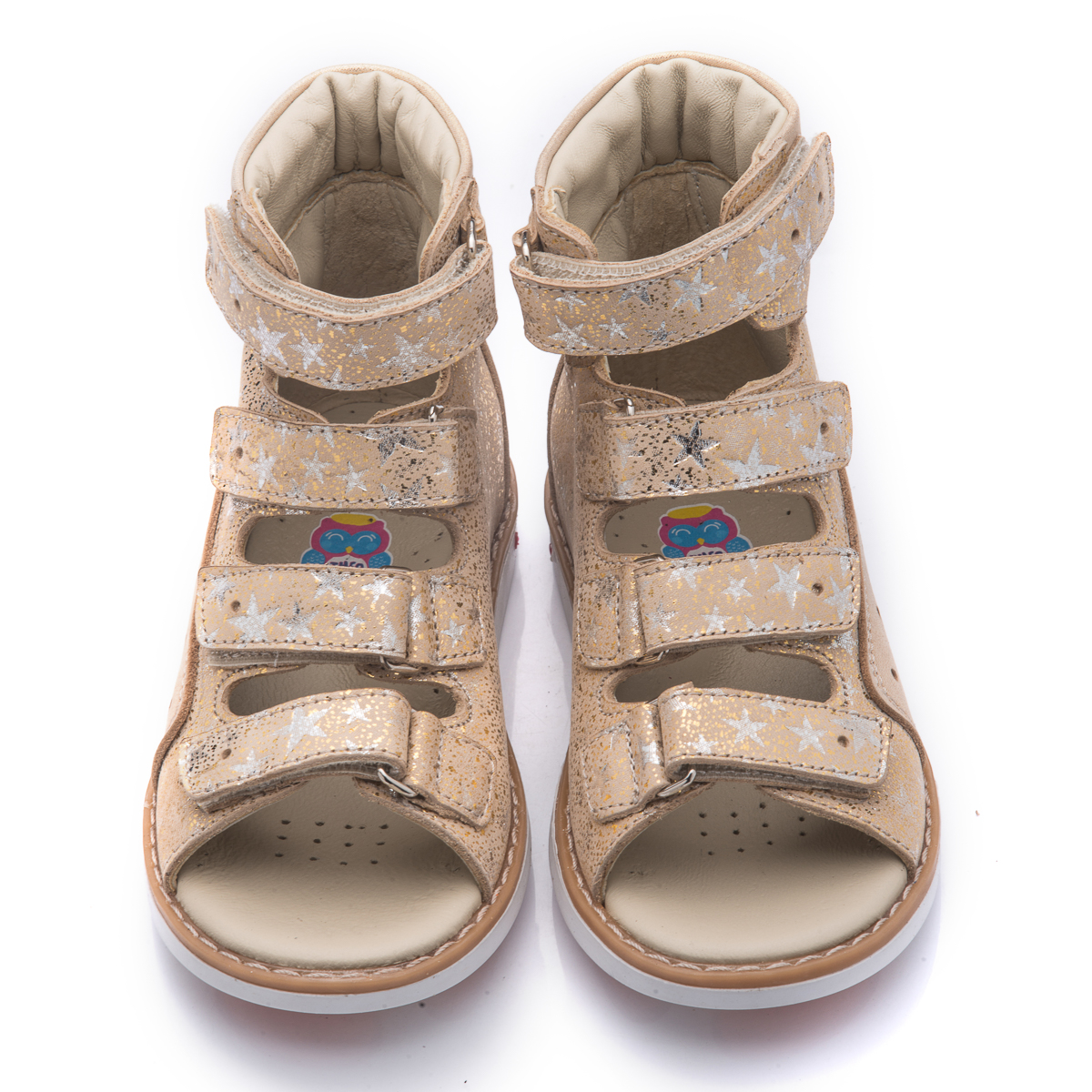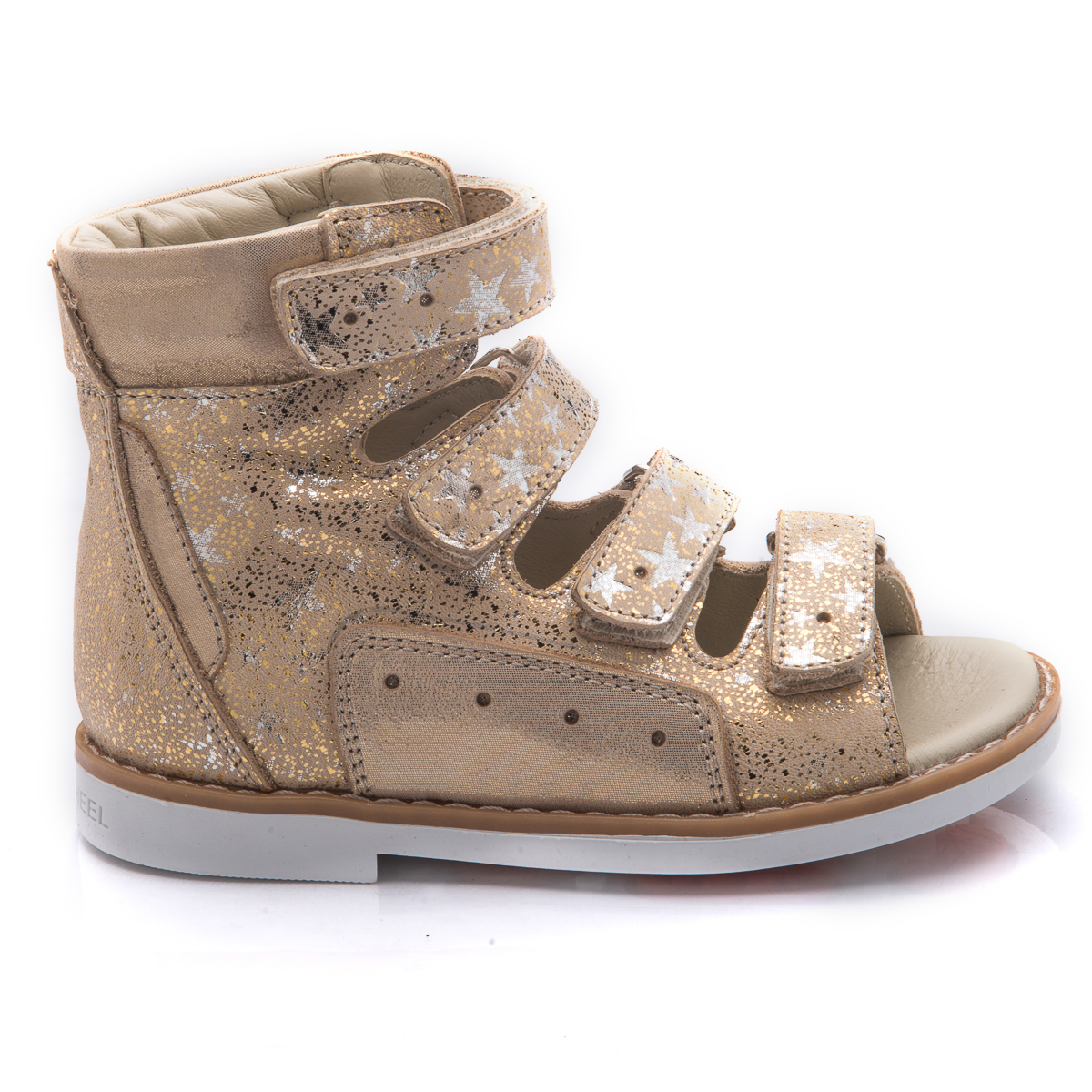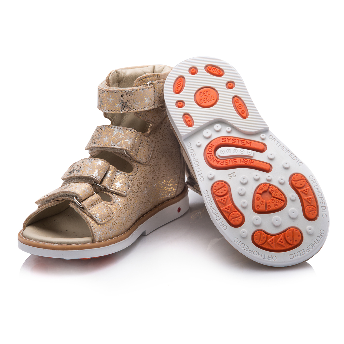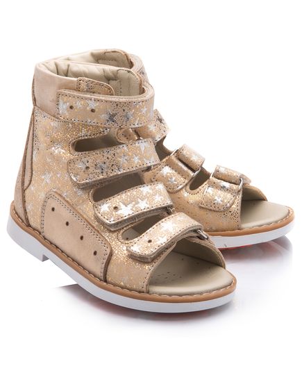 Ортопедические босоножки для девочки выполнены из натуральной кожи золотистого цвета с узором в виде серебристых звездочек. Декорированы вставкой из однотонной золотистой кожи. Застегиваются и фиксируются на ноге с помощью 4 липучек. Подкладка и стелька с анатомическим супинатором – натуральная кожа. Подошва – нескользящая, с каблуком Томаса, хорошо амортизирующая, устойчивая к температурам. Очень милые и замечательные босоножки. На ножке принцессы будут смотреться очень элегантно.