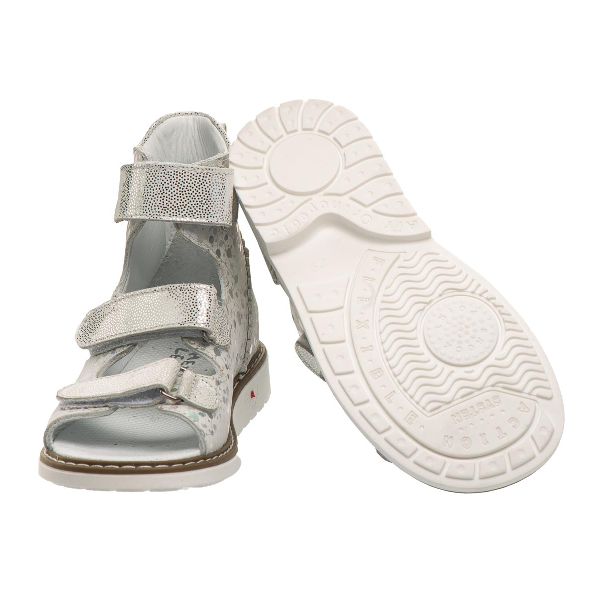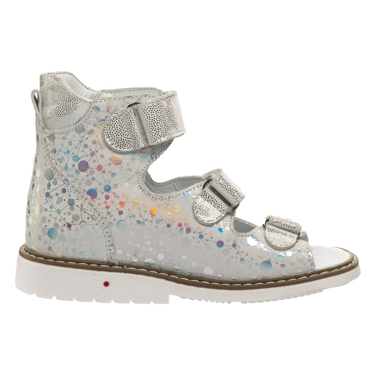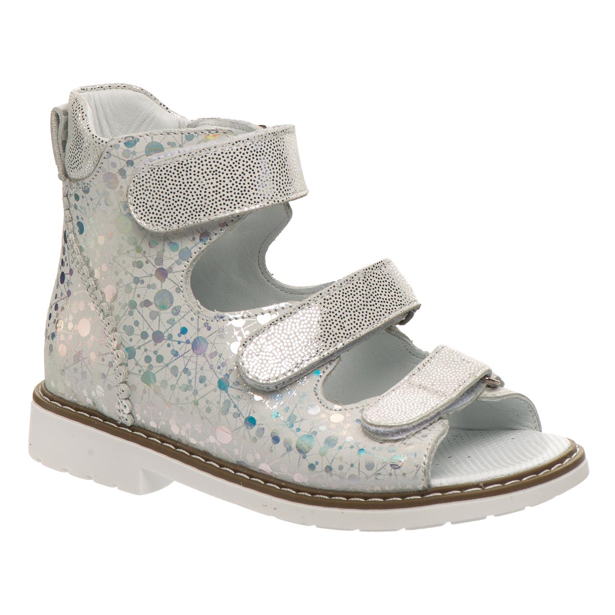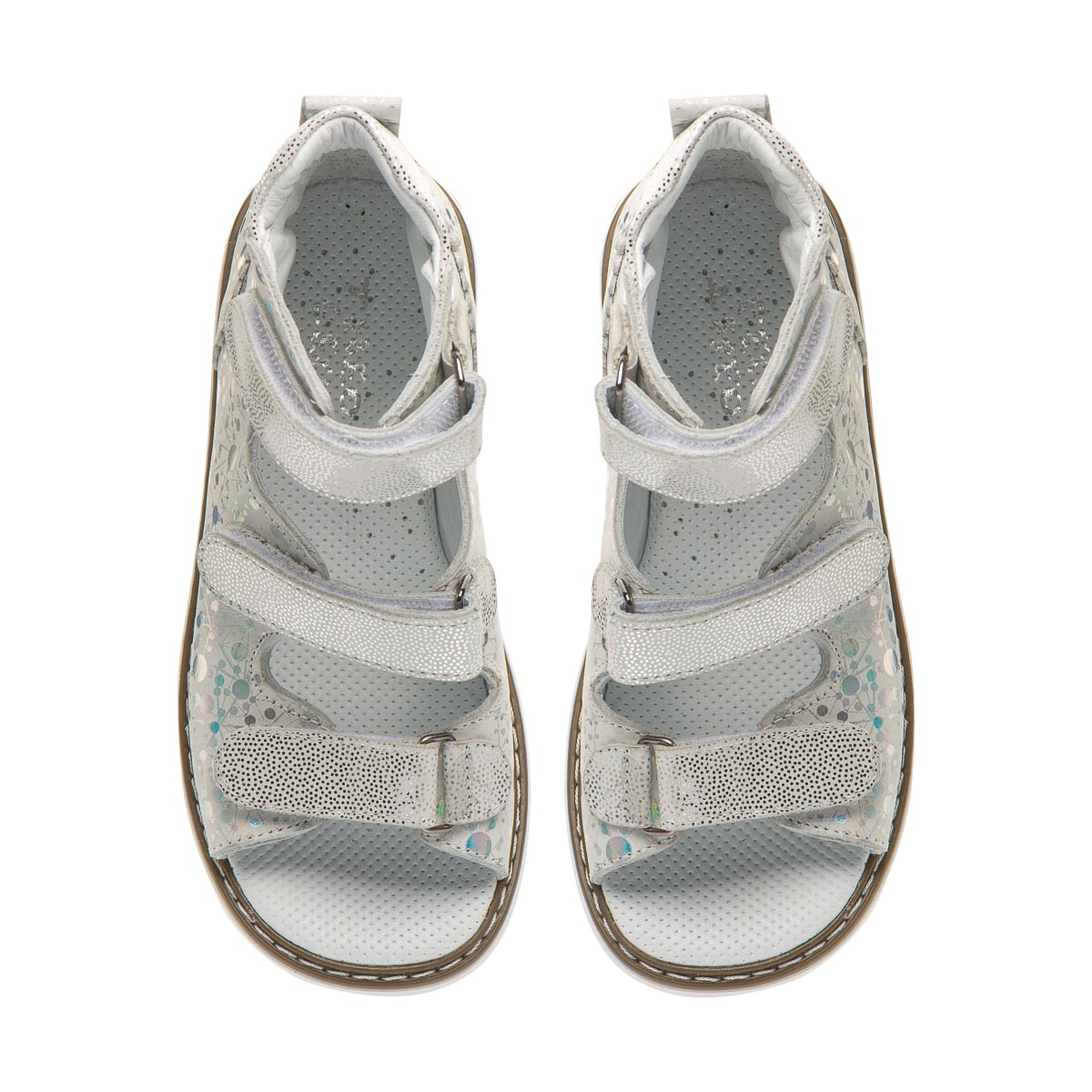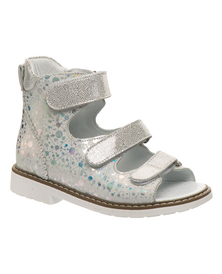 Ортопедические босоножки для девочки, изготовленные из натуральной кожи серебристого цвета. Мягкая кожаная подкладка обеспечивает комфорт во время ежедневного ношения. Благодаря трем удобным липучкам модель легко регулируется в соответствии с особенностями детской стопы, гарантируя надежную фиксацию.