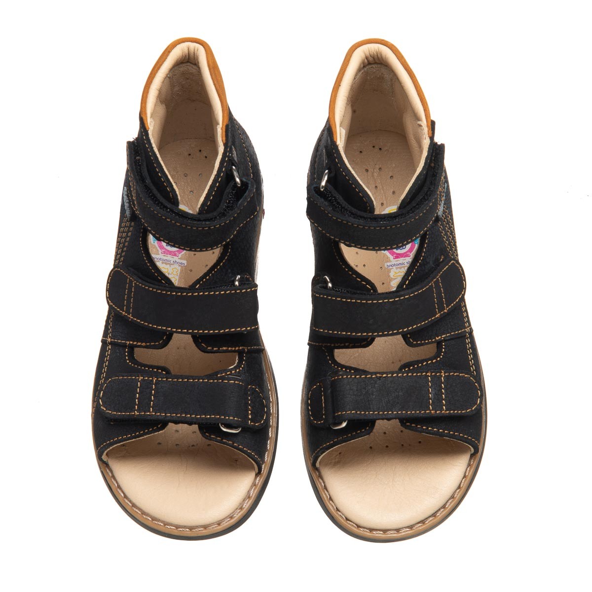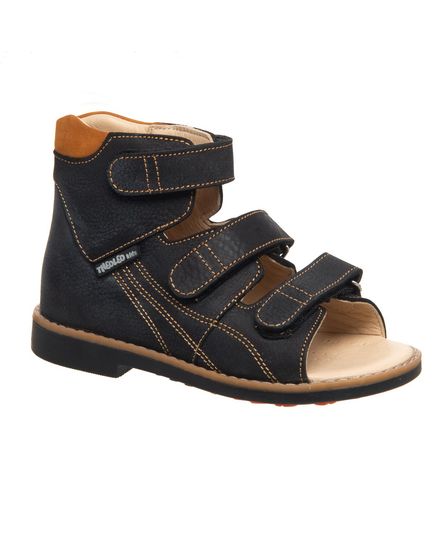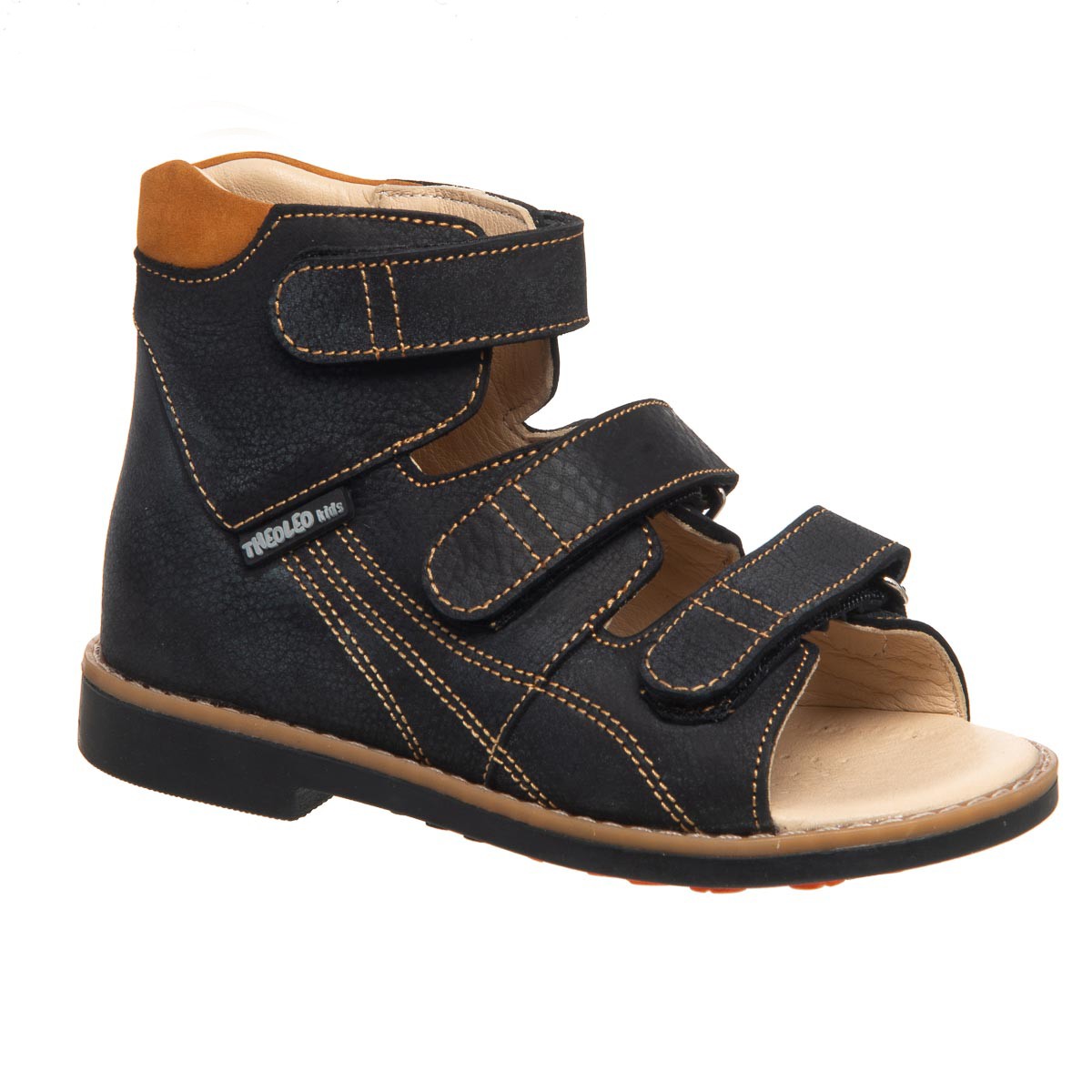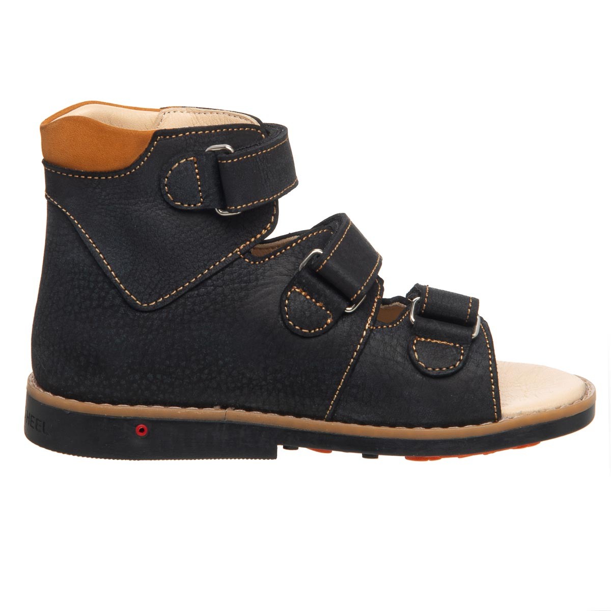 Стильные ортопедические босоножки из натуральной кожи черного цвета, станут отличным выбором для вашего мальчика. Изысканный дизайн - дополнен контрастными швами. Высокая часть берцев обеспечивает дополнительную поддержку. Три липучки позволяют легко одевать и снимать обувь, обеспечивая надежную фиксацию на ноге. При создании босоножек соблюдены все необходимые требования к ортопедической обуви: