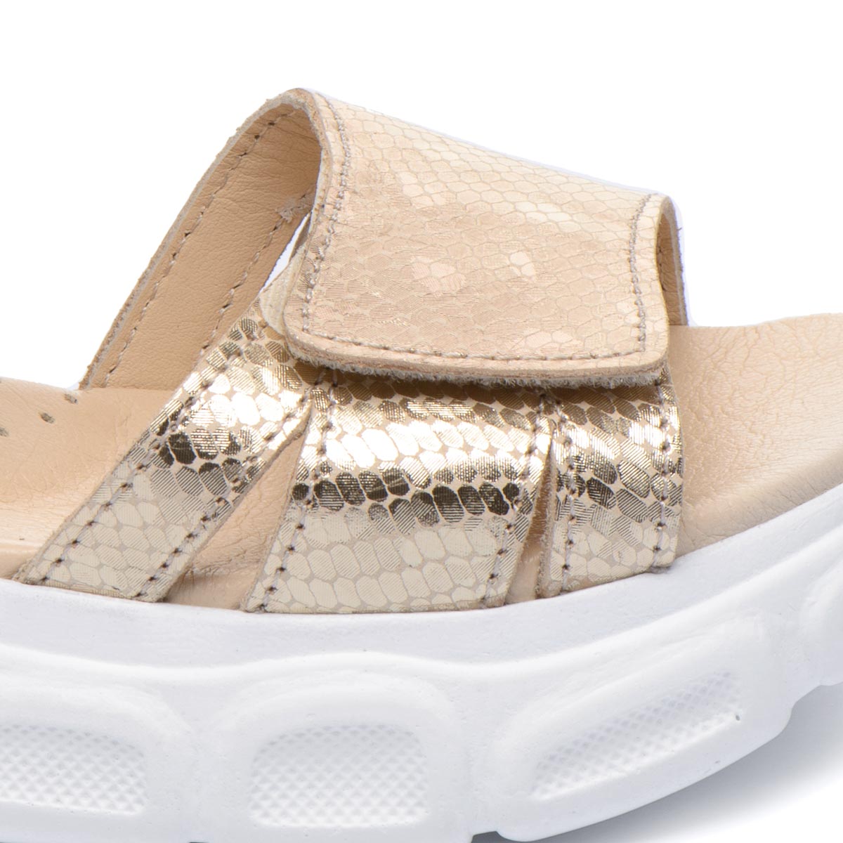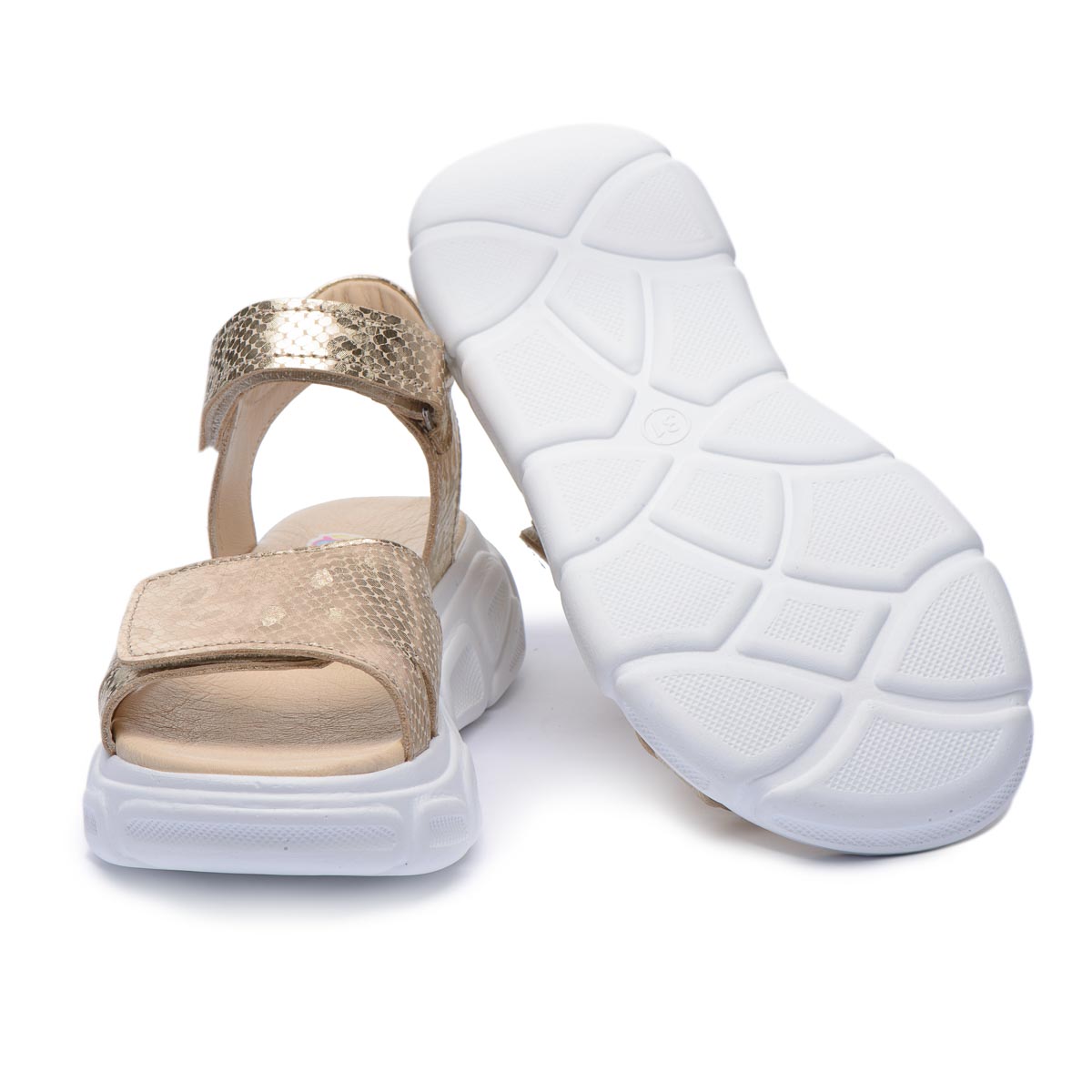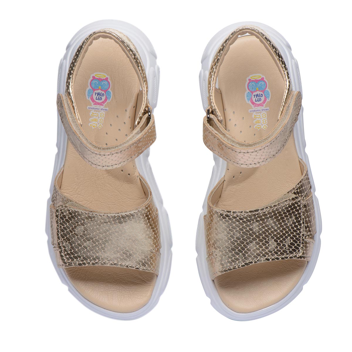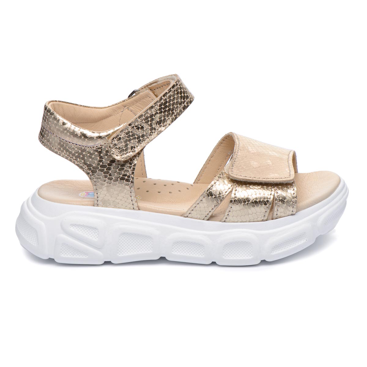 Эти кожаные сандалии поражают своим безупречным качеством и непревзойденной элегантностью, цвет обуви – золотой. Двойные регулируемые ремешки с липучками помогут идеально подогнать обувь по ножке: узкие липучки позволяют легко снимать и надевать обувь, а широкие липучки - легко регулировать их посадку на ноге. Встроенный супинатор обеспечит правильное положение стопы и поддержку дуги во время ходьбы. Эти золотые сандалии станут любимой парой обуви для вашей дочки, подчеркнут ее уникальный стиль и придадут уверенность в каждом шаге.
