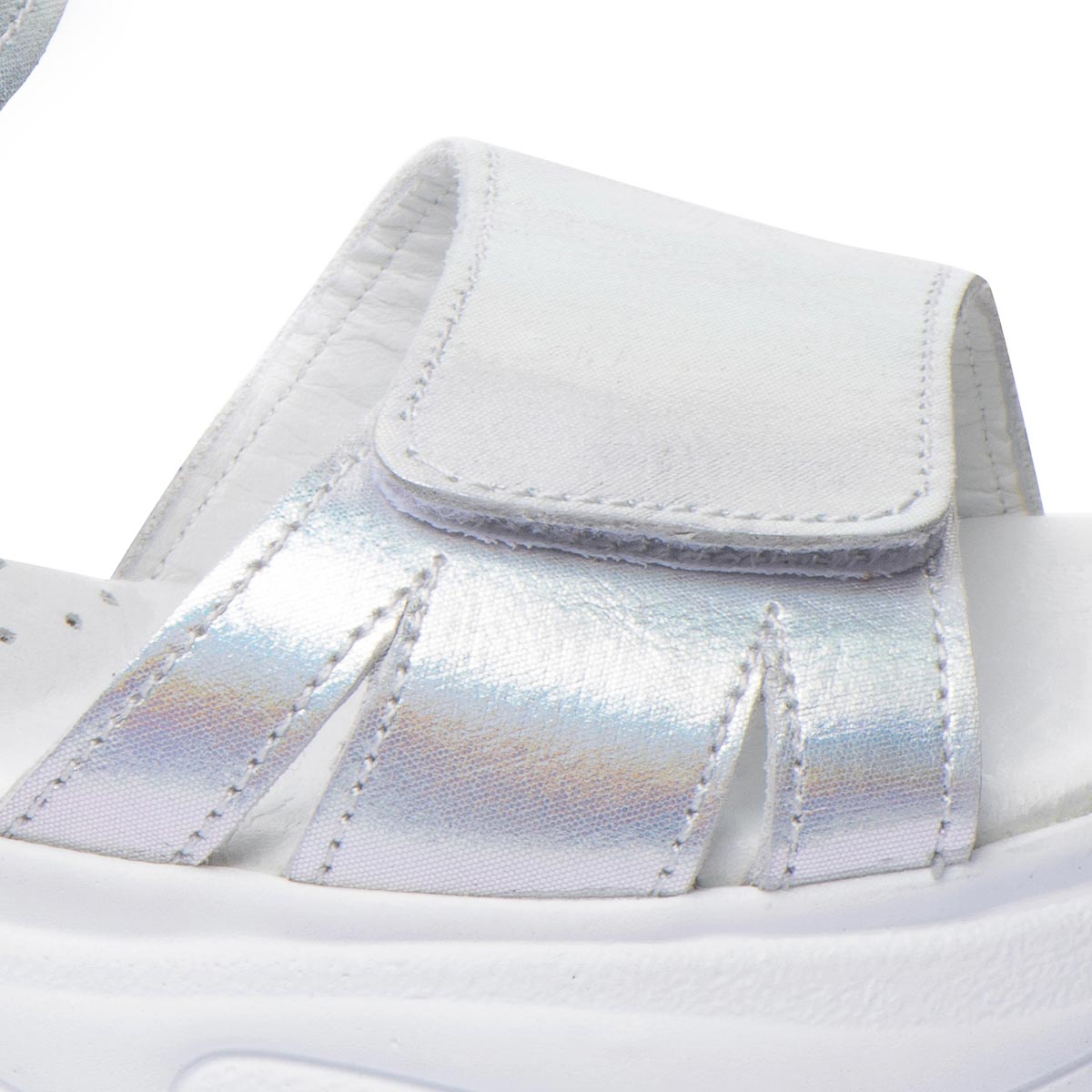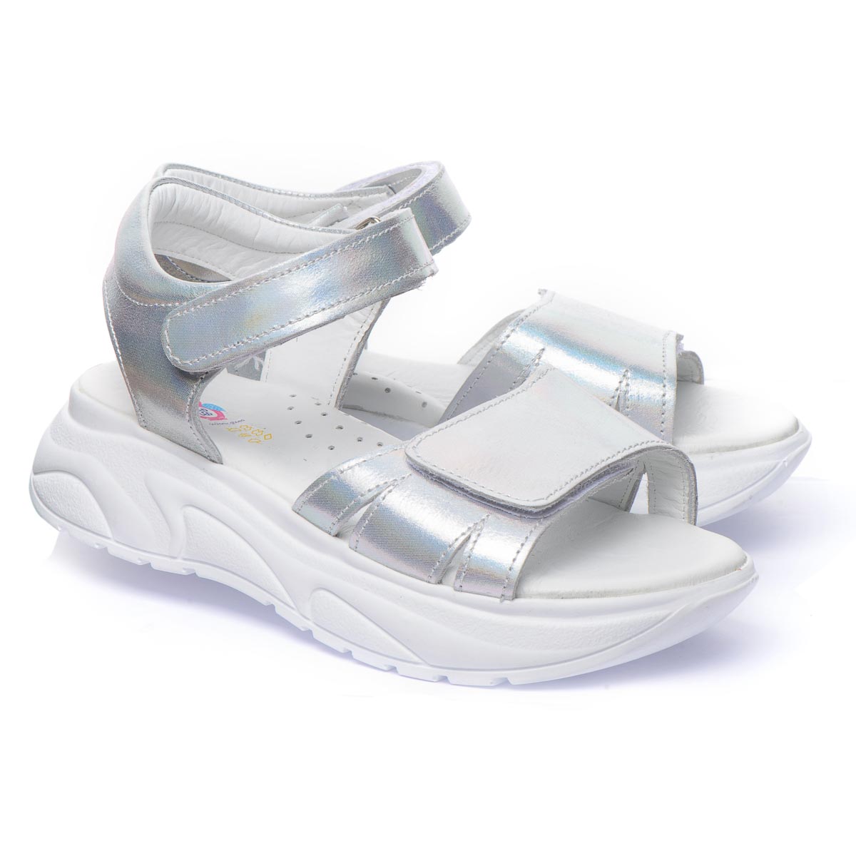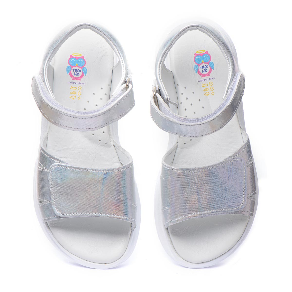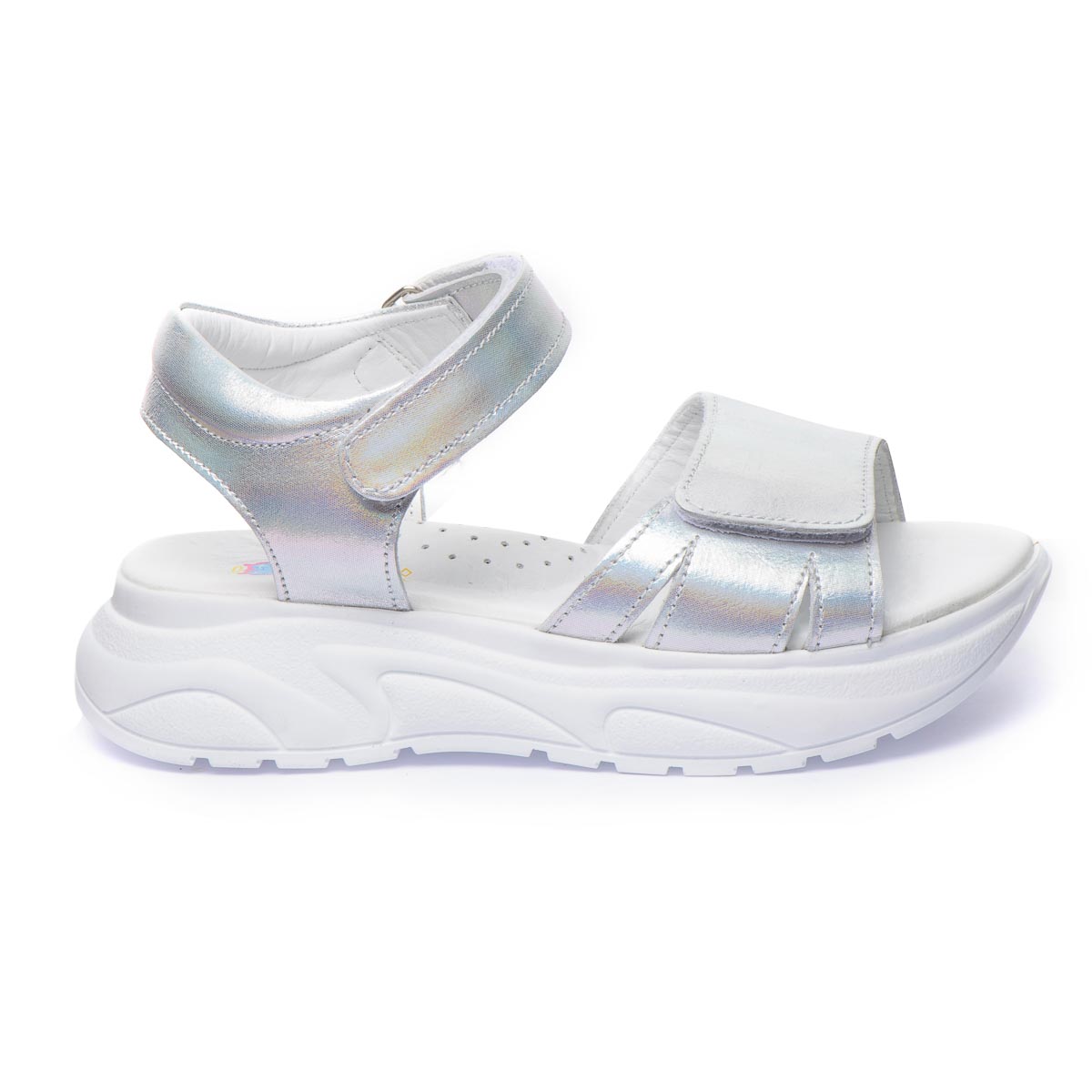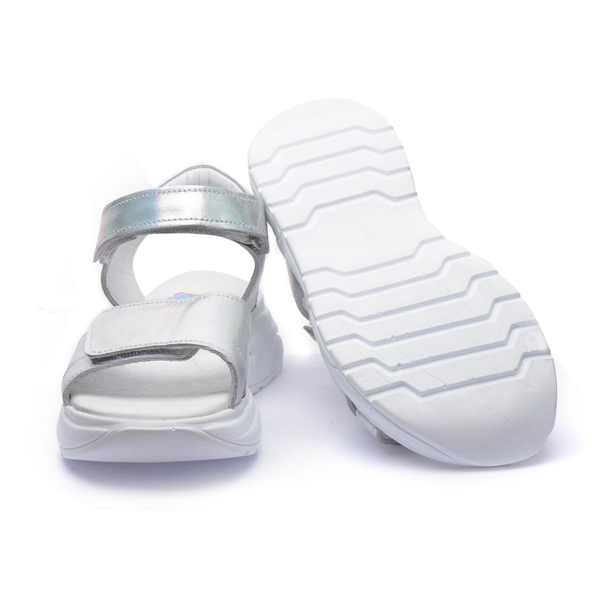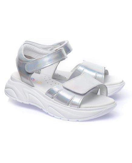 Открытые кожаные летние сандалии для девочек. Очень красивого металлического оттенка с серебристым блеском. Двойные регулируемые ремешки с липучками помогут идеально подогнать сандалии к ножке: узкие липучки позволяют легко снимать и надевать обувь, а широкие липучки - легко регулировать их посадку на ноге. Встроенный супинатор обеспечит правильное положение стопы и поддержку дуги во время ходьбы. Оснащены подошвой из термопластической резины. Серебряный цвет обуви, может быть модным экспериментом в повседневном образе, или для праздничных мероприятий.