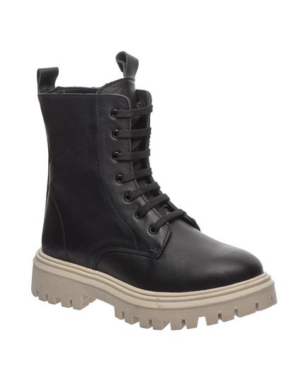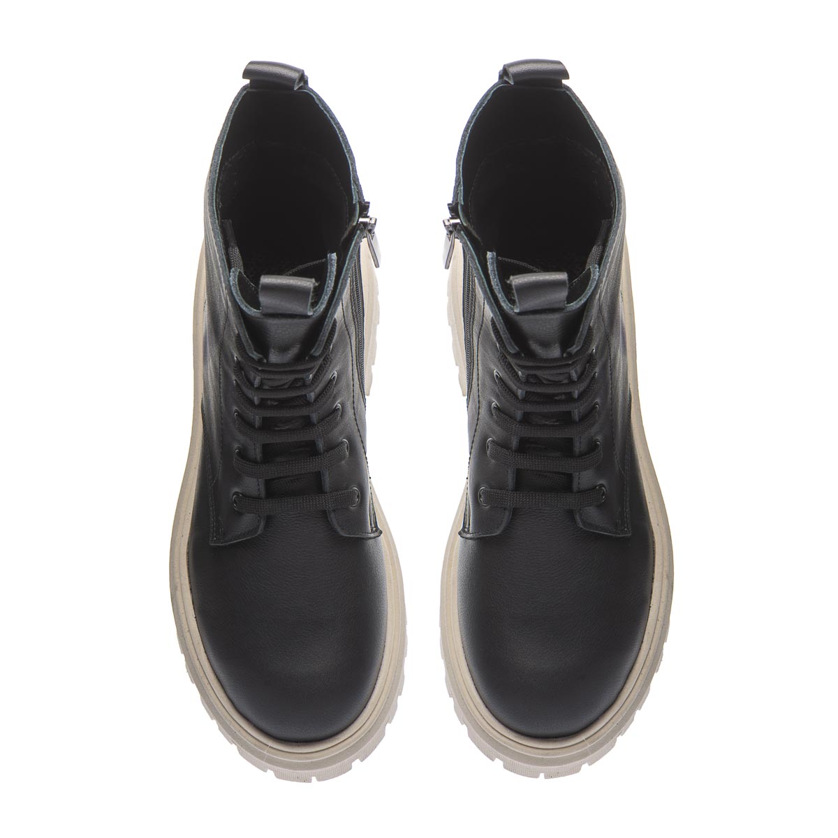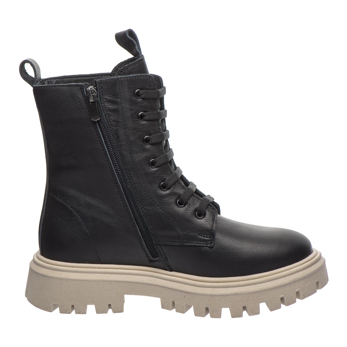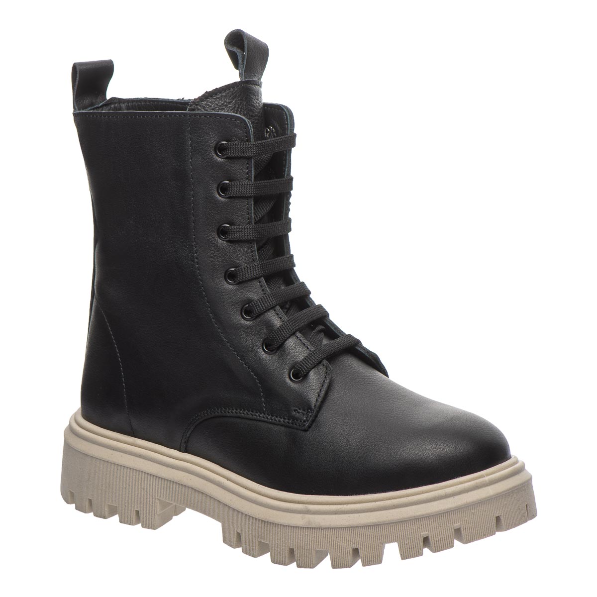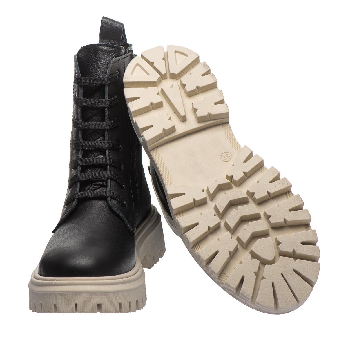 Стильные черные кожаные сапоги на массивной подошве, выполненные в современном дизайне, из качественной натуральной кожи. Особенностью этих сапог является бежевый цвет подошвы, которая выделяется на фоне классического черного цвета обуви. Имеют шнурки и молнию с боку, что делает их удобными в использовании. Обувь на флисовом подкладе. Стелька кожаная с анатомическим супинатором. Подошва удобная, рельефная из термопластичной резины. Такой дизайн обуви дает возможность выделяться и подчеркивать индивидуальный стиль своего владельца.