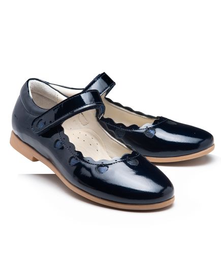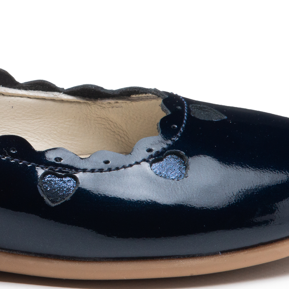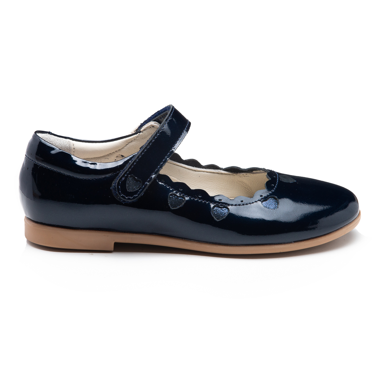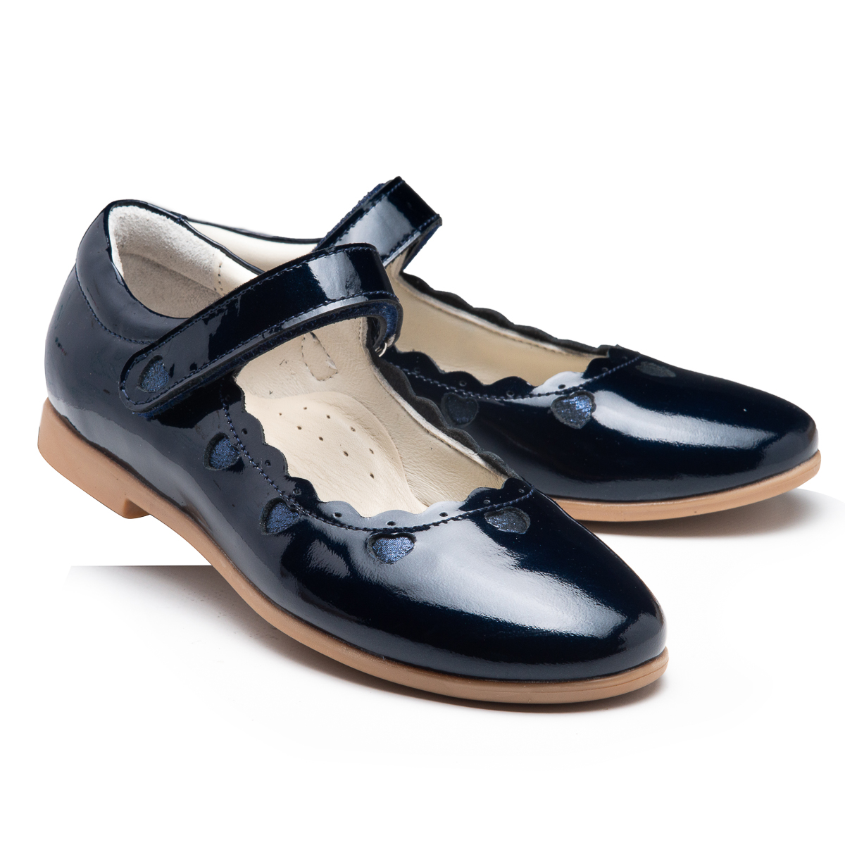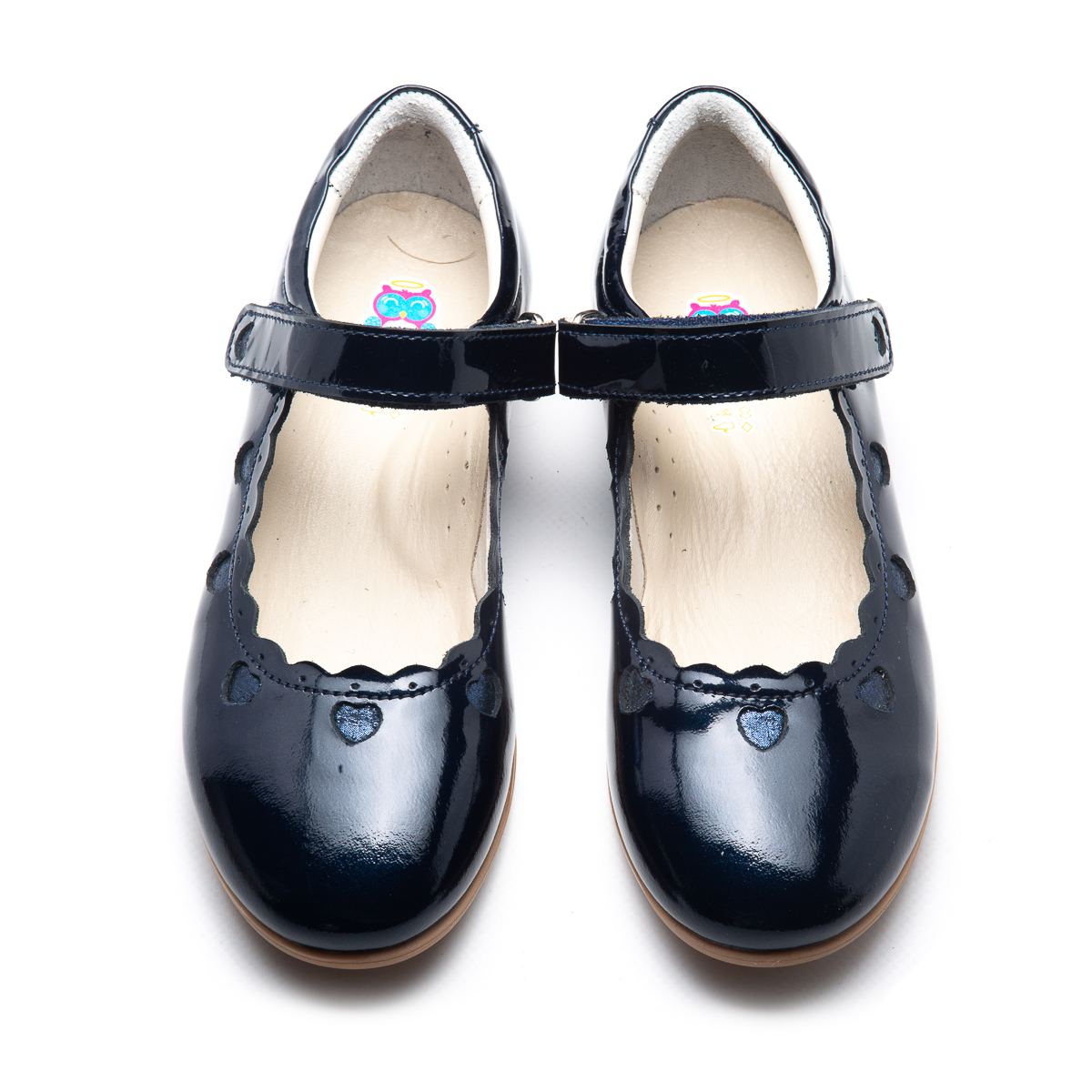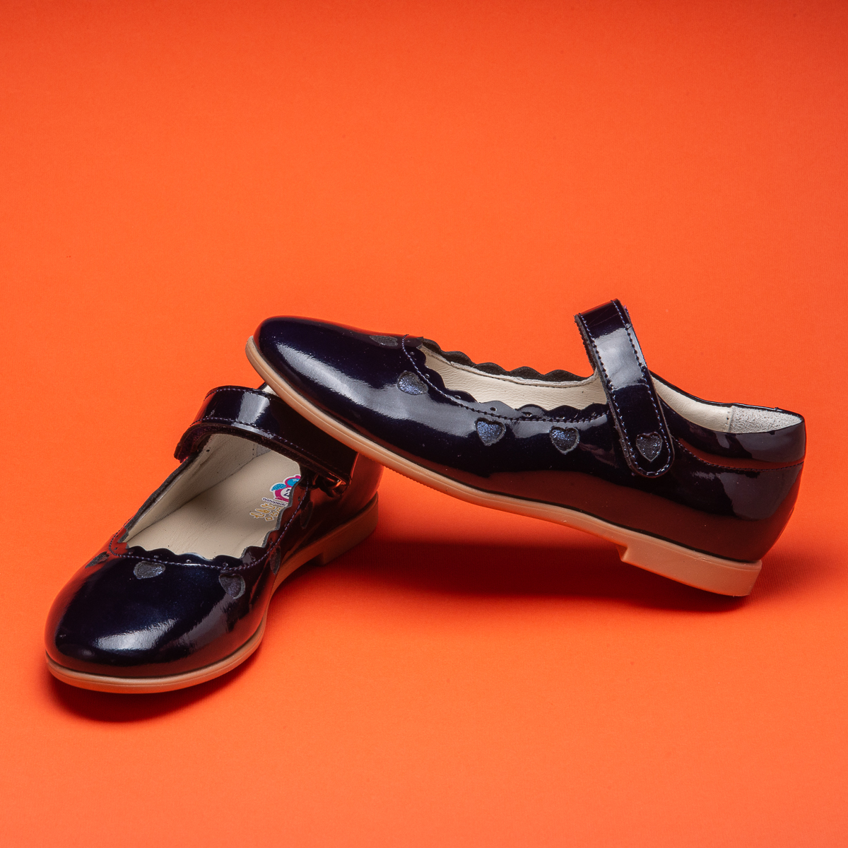 Туфли для девочки с блестящей лакированной поверхностью - темно-синего цвета, выполнены из натуральной кожи. Имеют перфорацию в форме сердца, украшенную глиттером. Застежка на одной липучке. Легкая и гибкая подошва из термопластичной резины. Кожаная стелька, имеет супинатор - создан с учетом анатомических особенностей детской стопы. Эти туфли станут прекрасным дополнением к праздничному наряду вашей девочки.