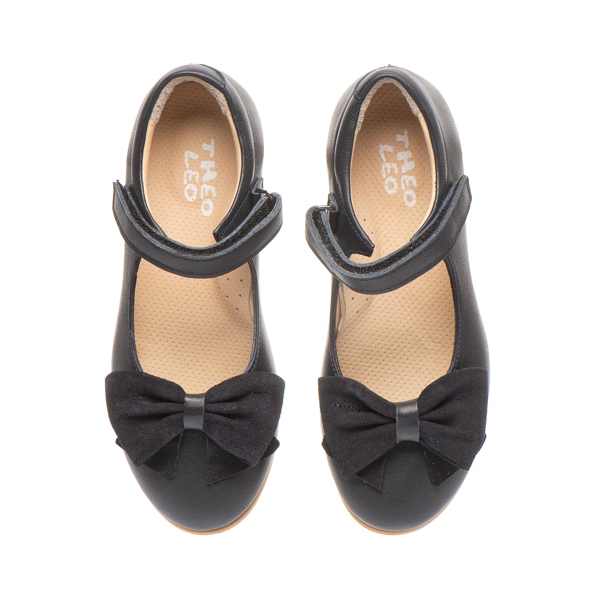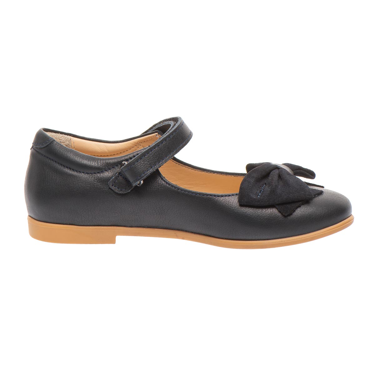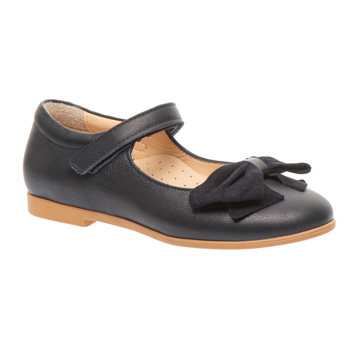 Школьные туфли для девочки, матового темно-синего цвета, с элегантным бантом на передней части. Изготовлены из натуральной кожи. Застежка на одной липучке. Легкая и гибкая подошва из термопластичной резины. Кожаная стелька, имеет супинатор - созданный с учетом анатомических особенностей детской стопы. Классический дизайн соответствует требованиям большинства школьных дресс-кодов, делает эти туфли идеальным выбором на протяжении всего учебного года.