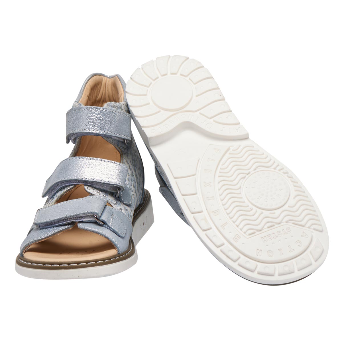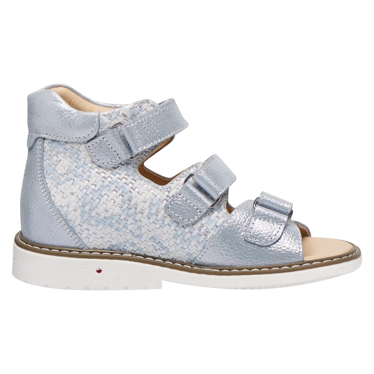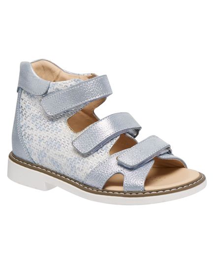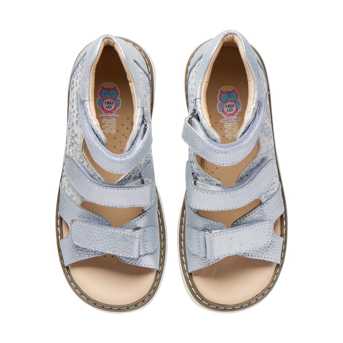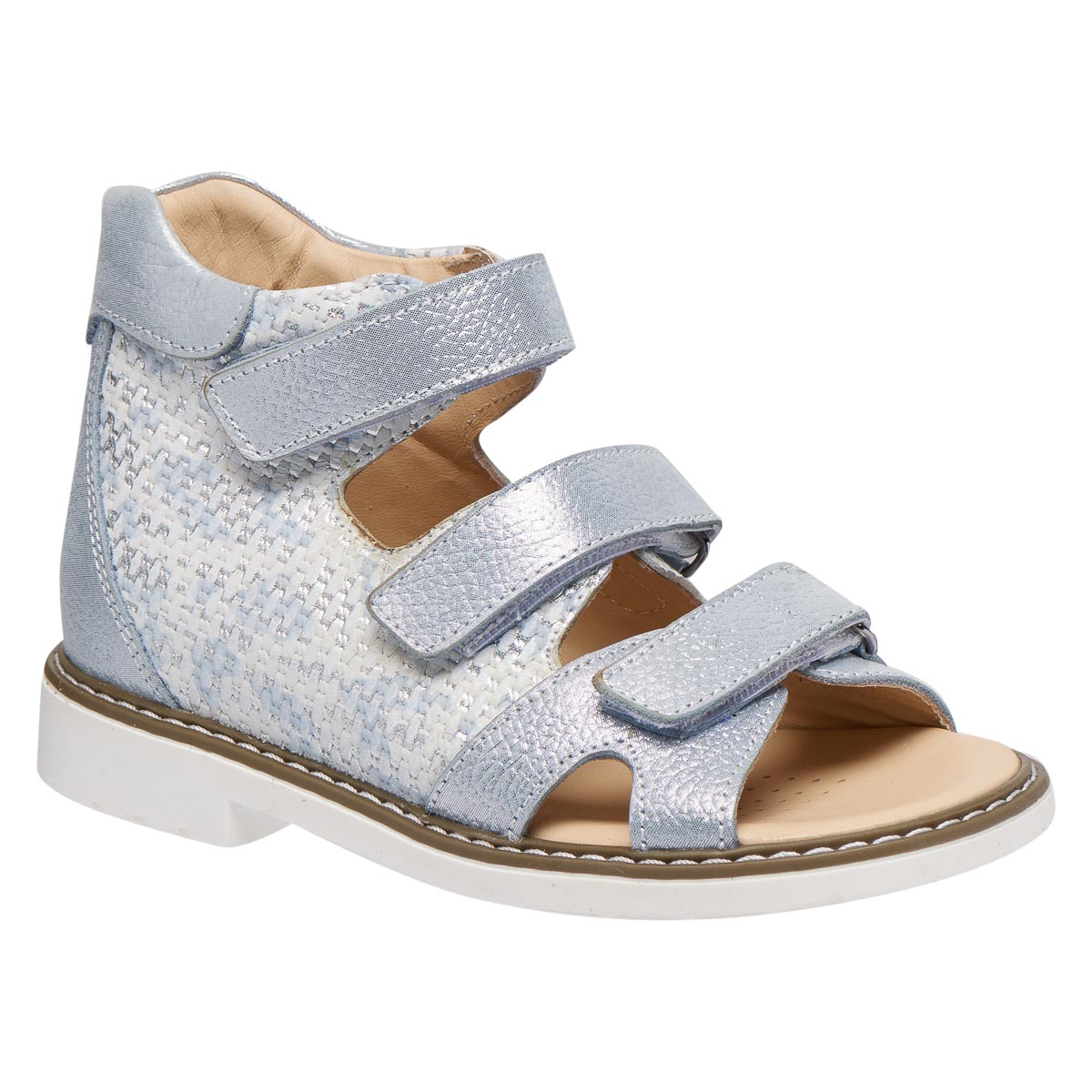 Кольорова палітра взуття сріблясто-блакитний з металевим відтінком. Такий кольоровий вибір додає взуттю елегантності та легкості.  Матеріал виконання - натуральна шкіра. Мають три липучки-застібки, які добре фіксують ніжку.