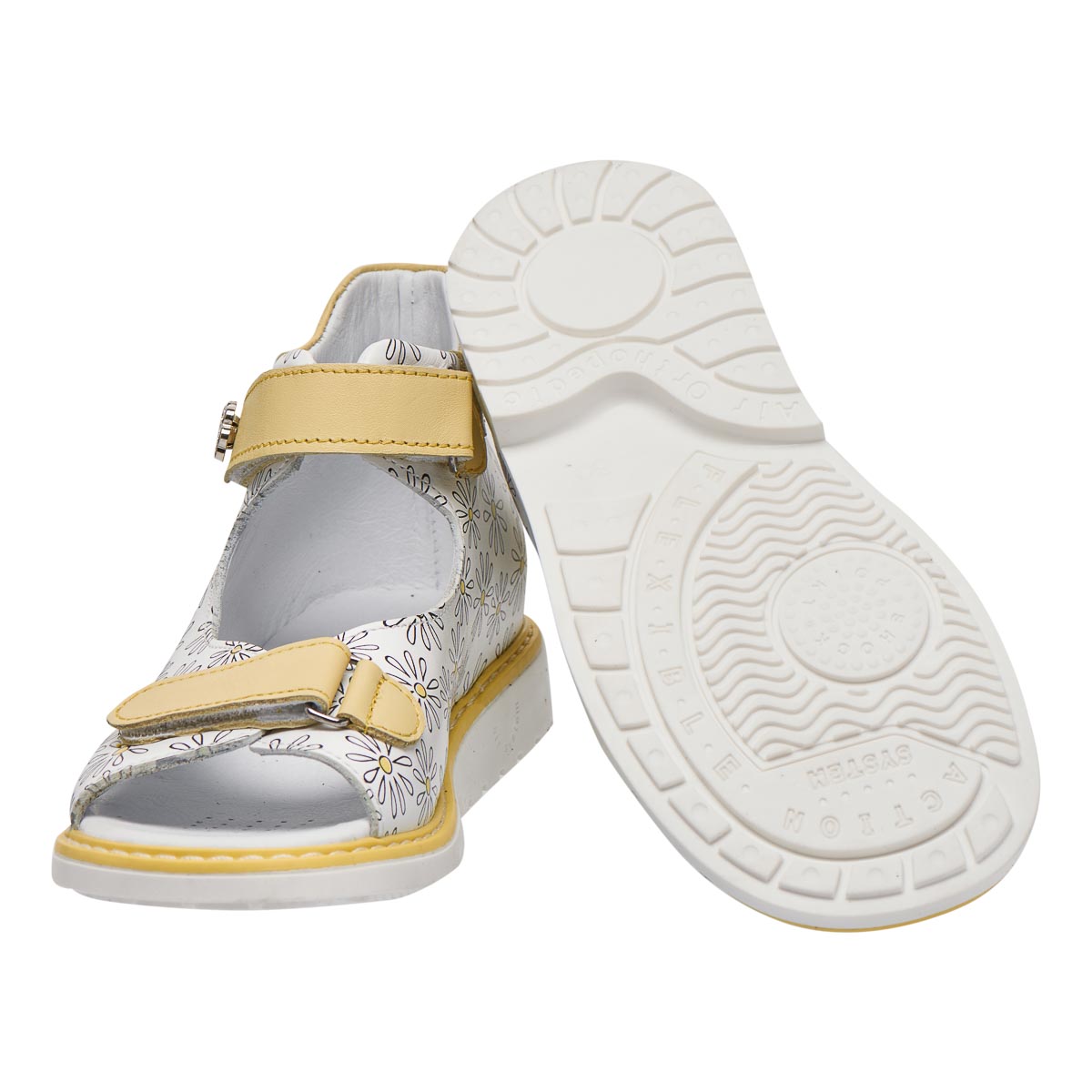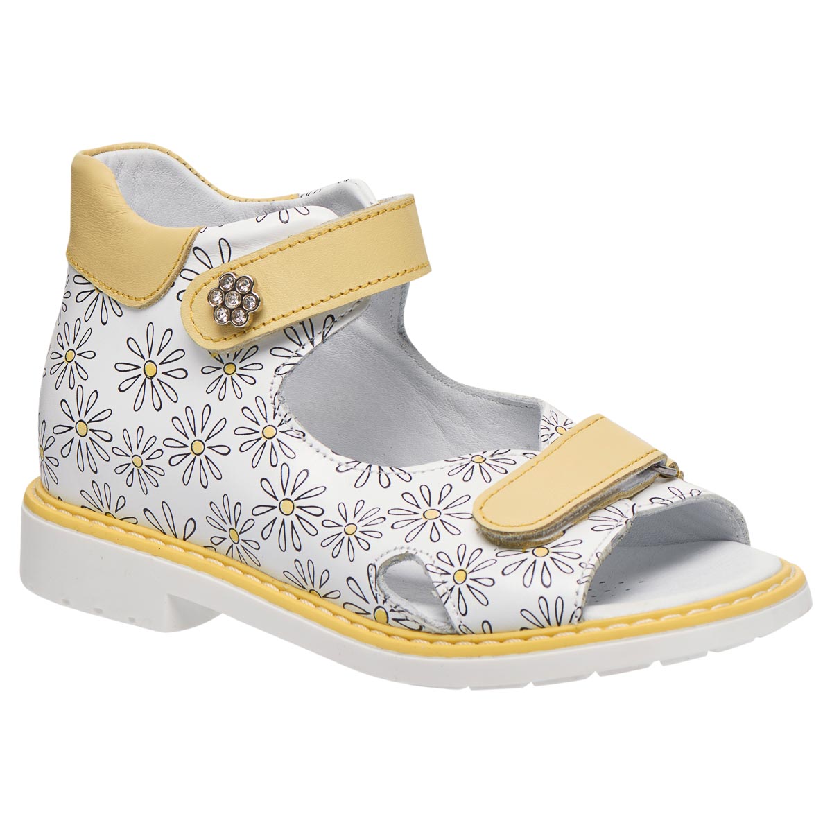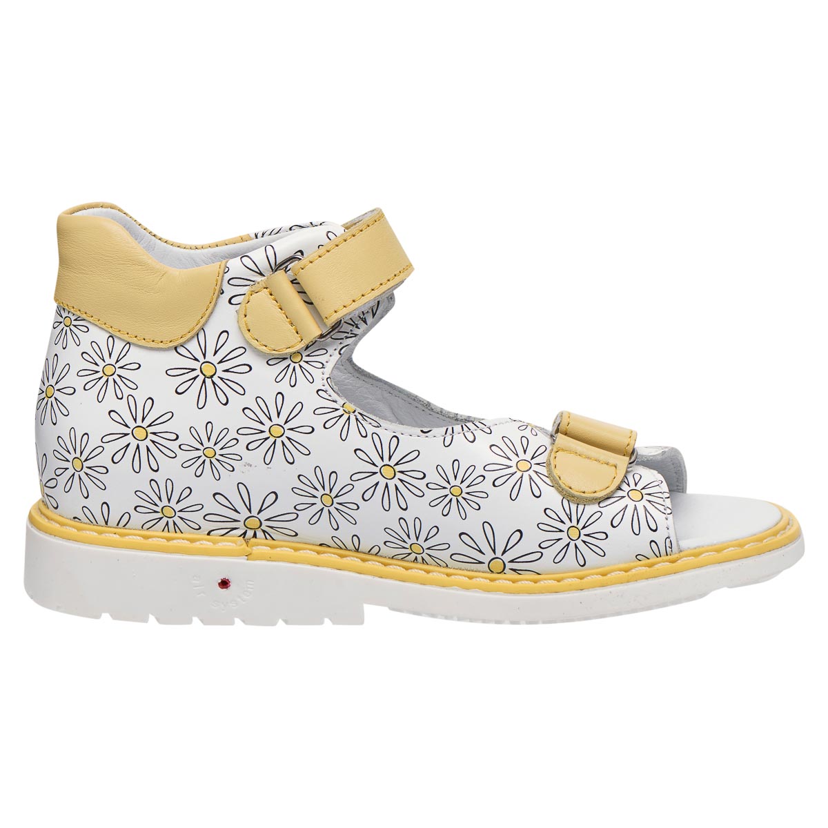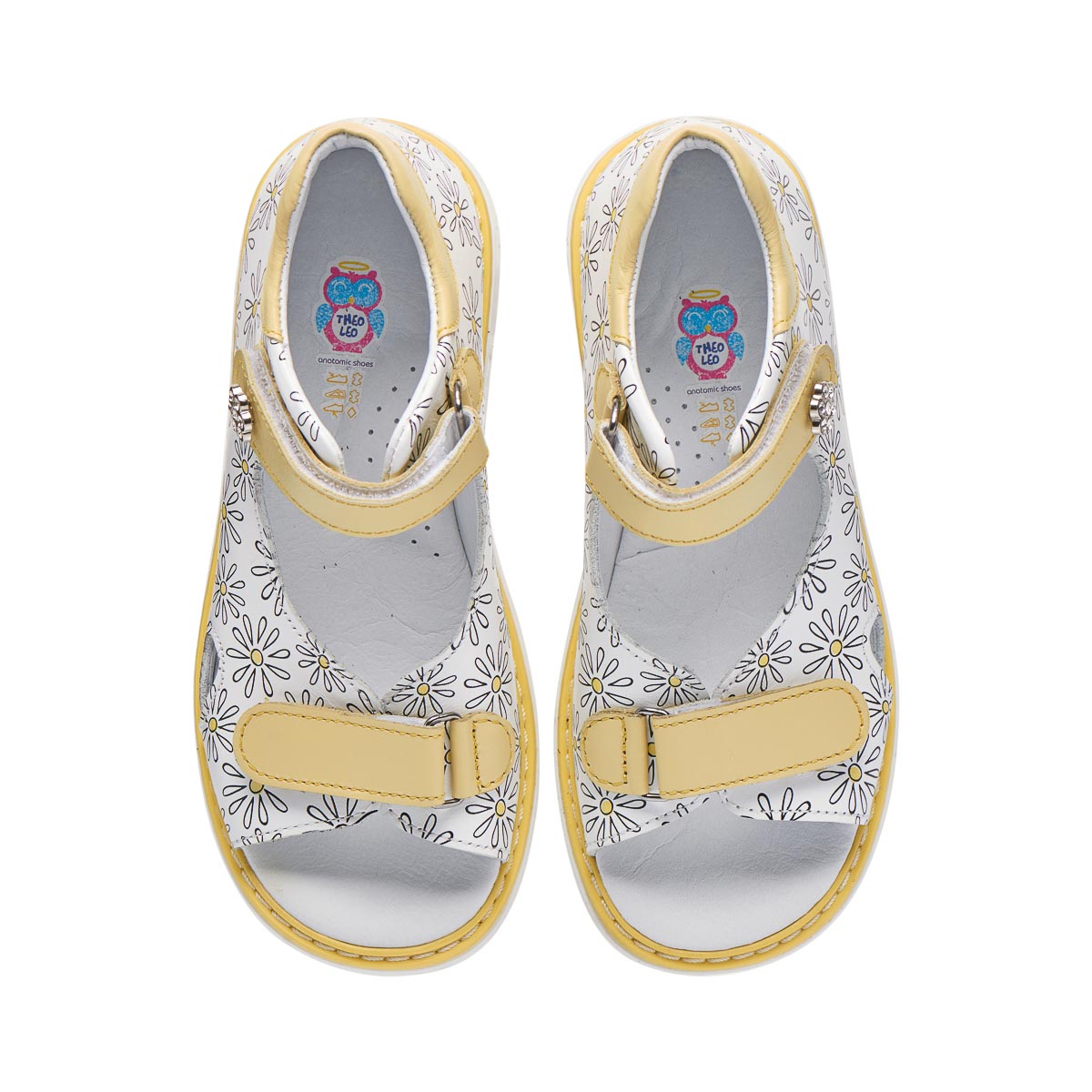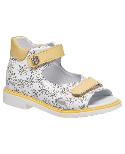 Босоніжки з натуральної шкіри, заворожують своїм ніжним квітковим візерунком, а сонячно-жовті акценти на застібках надають взуттю життєрадісного та свіжого вигляду. Застібки-липучки дозволяють легко регулювати ширину та надійно зафіксувати взутті.