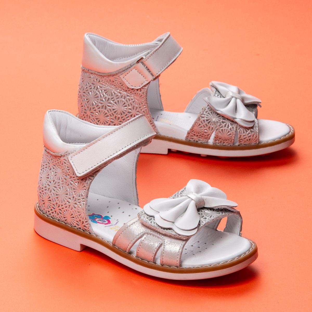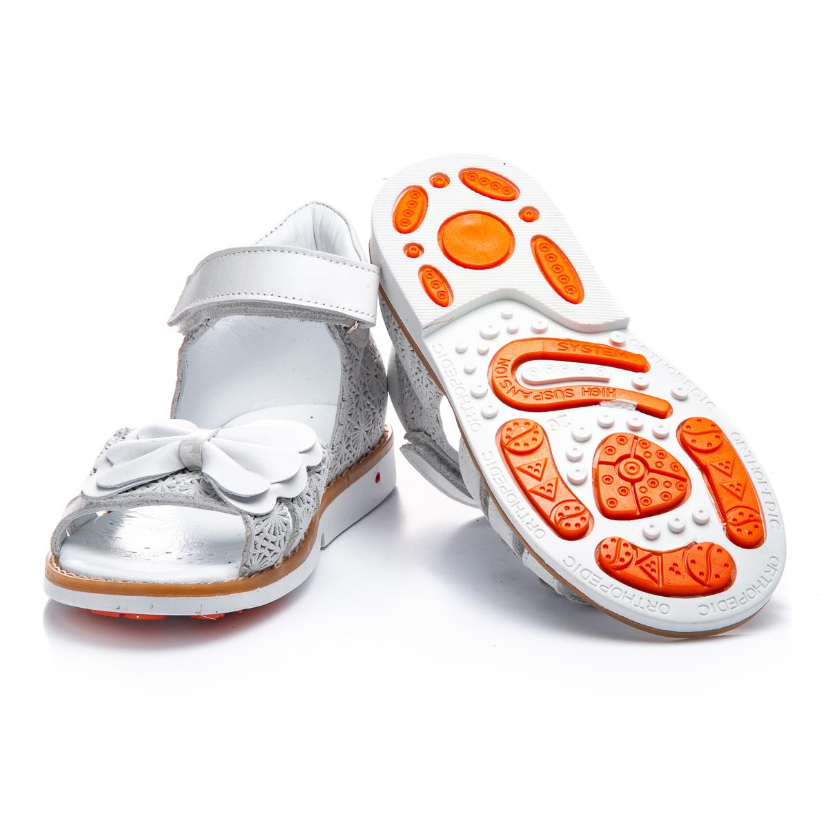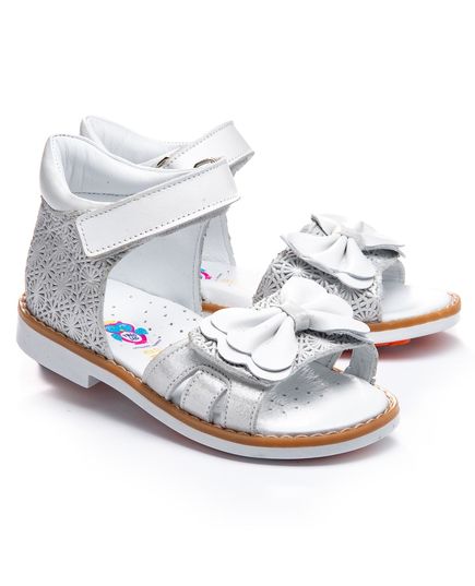 Витончені босоніжки для дівчинки, виконані з високоякісної натуральної шкіри білого кольору. Ажурна перфорація надає взуттю ніжного та тендітного вигляду, а ефектний бант – чарівності, та привертає увагу. Дві липучки забезпечують надійну фіксацію на нозі та дозволяють легко регулювати посадку. Устілка шкіряна з анатомічним супінатором. Підошва з каблуком Томаса - з термопластичної гуми. Ці босоніжки - ідеальний вибір для літніх свят та повсякденного носіння.