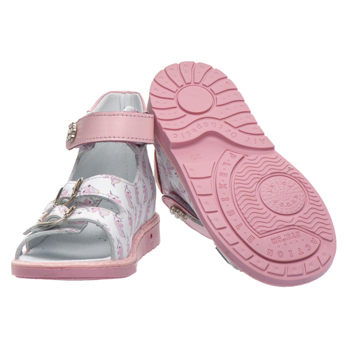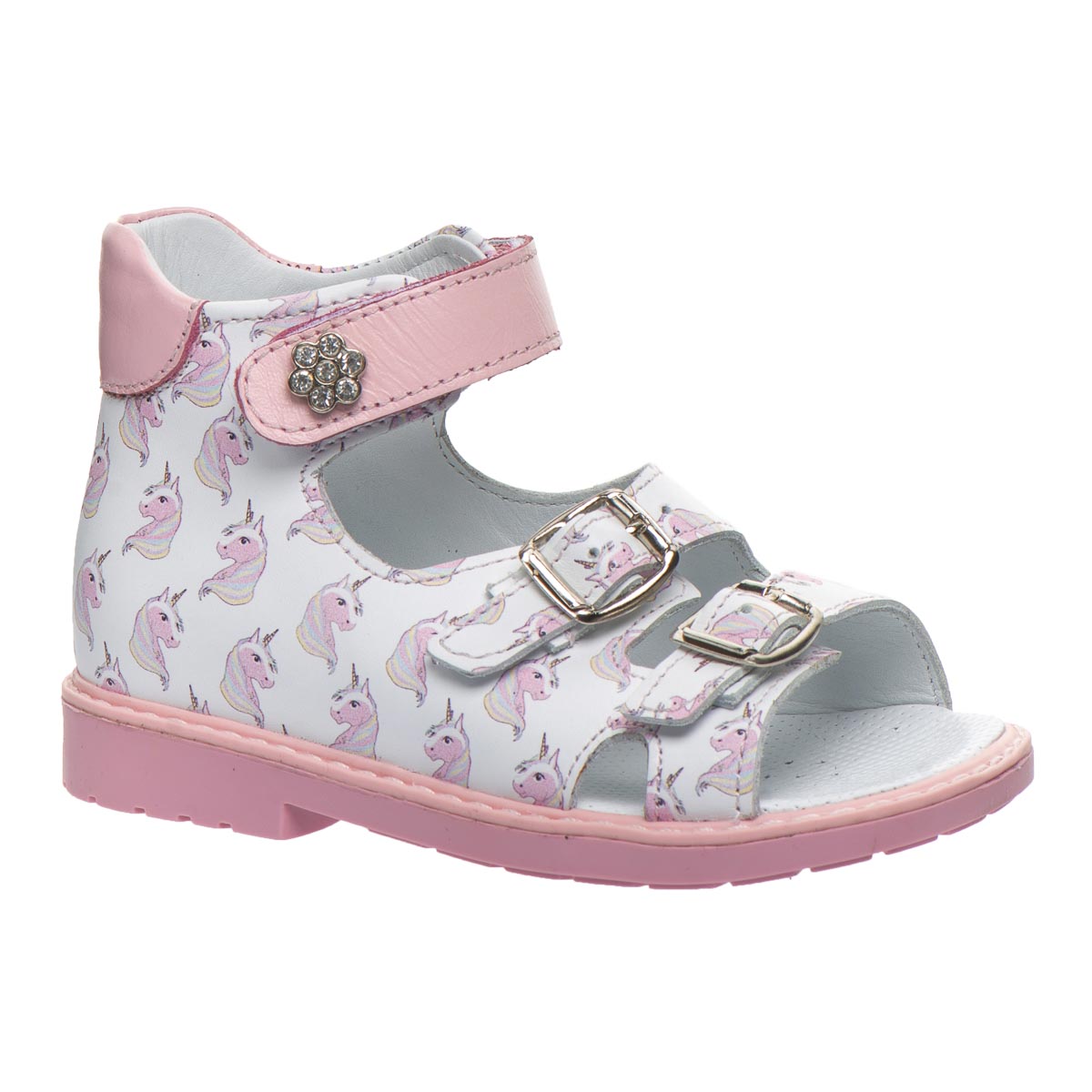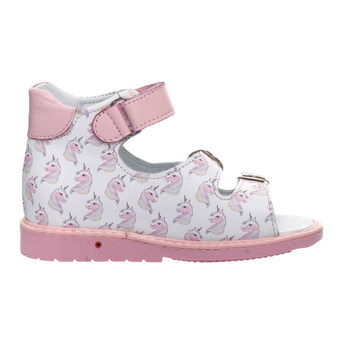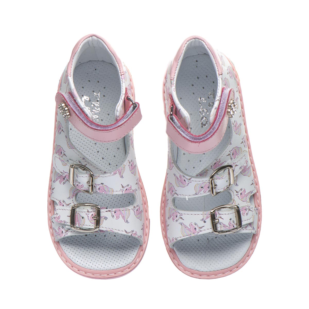 Милі біло-рожеві босоніжки для дівчинки, виготовлені з м’якої натуральної шкіри та прикрашені принтом  казкового єдинорога. Ідеальний вибір для найменших модниць! Два регульовані ремінці і липучка гарантують  зручну посадку та легке взування.