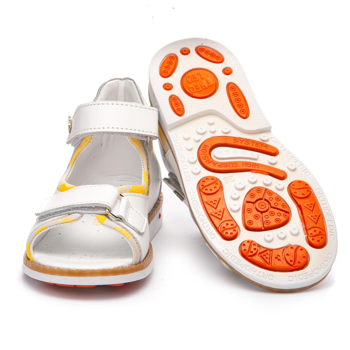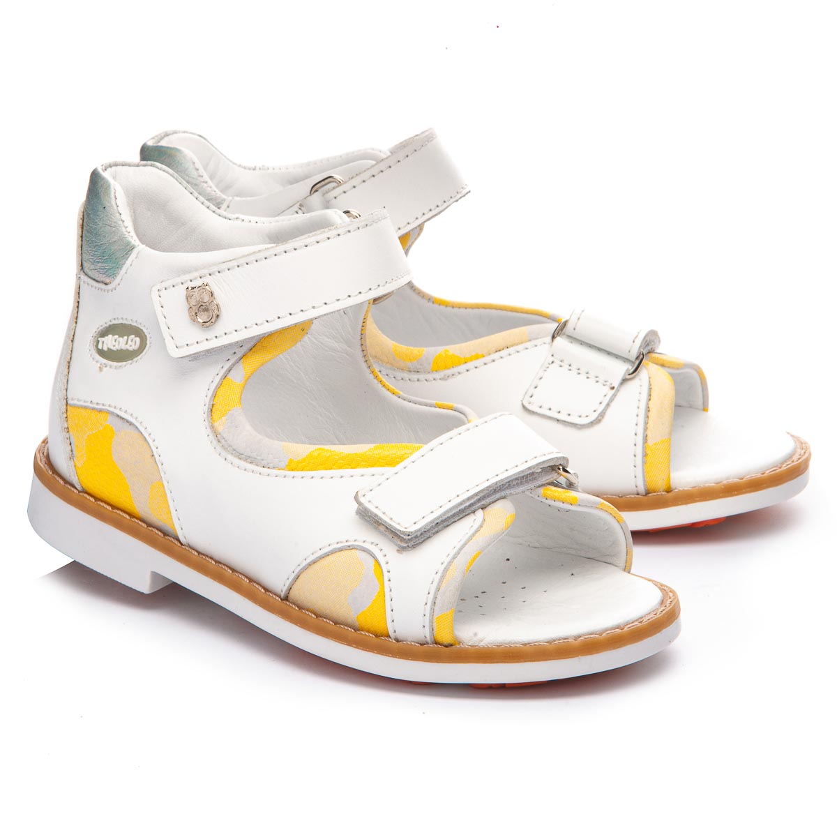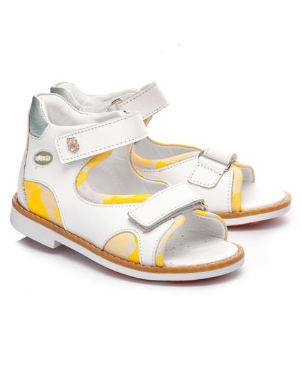 Красиві й акуратні босоніжки білого кольору з жовтенькими вставками, виконані повністю з натуральної шкіри, як усередині, так і зовні. Мають дві зручні застібки - липучки для легкості фіксації. Для забезпечення правильного розвитку стопи, здоров'я ніг та максимального комфорту, взуття має: