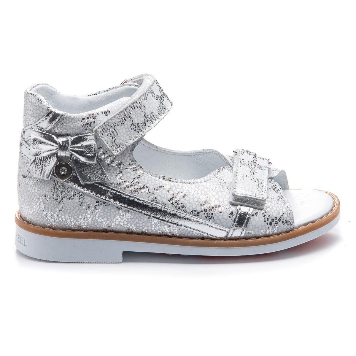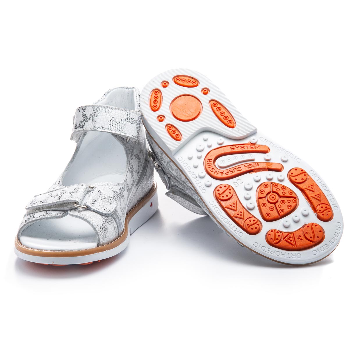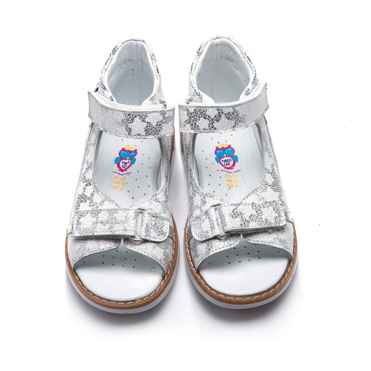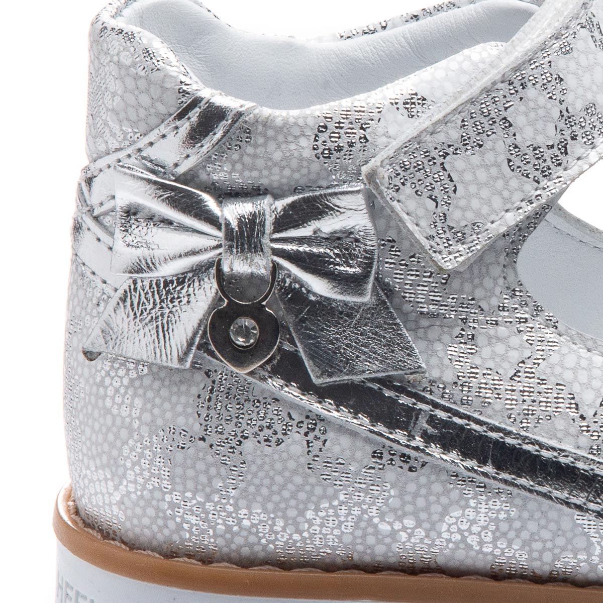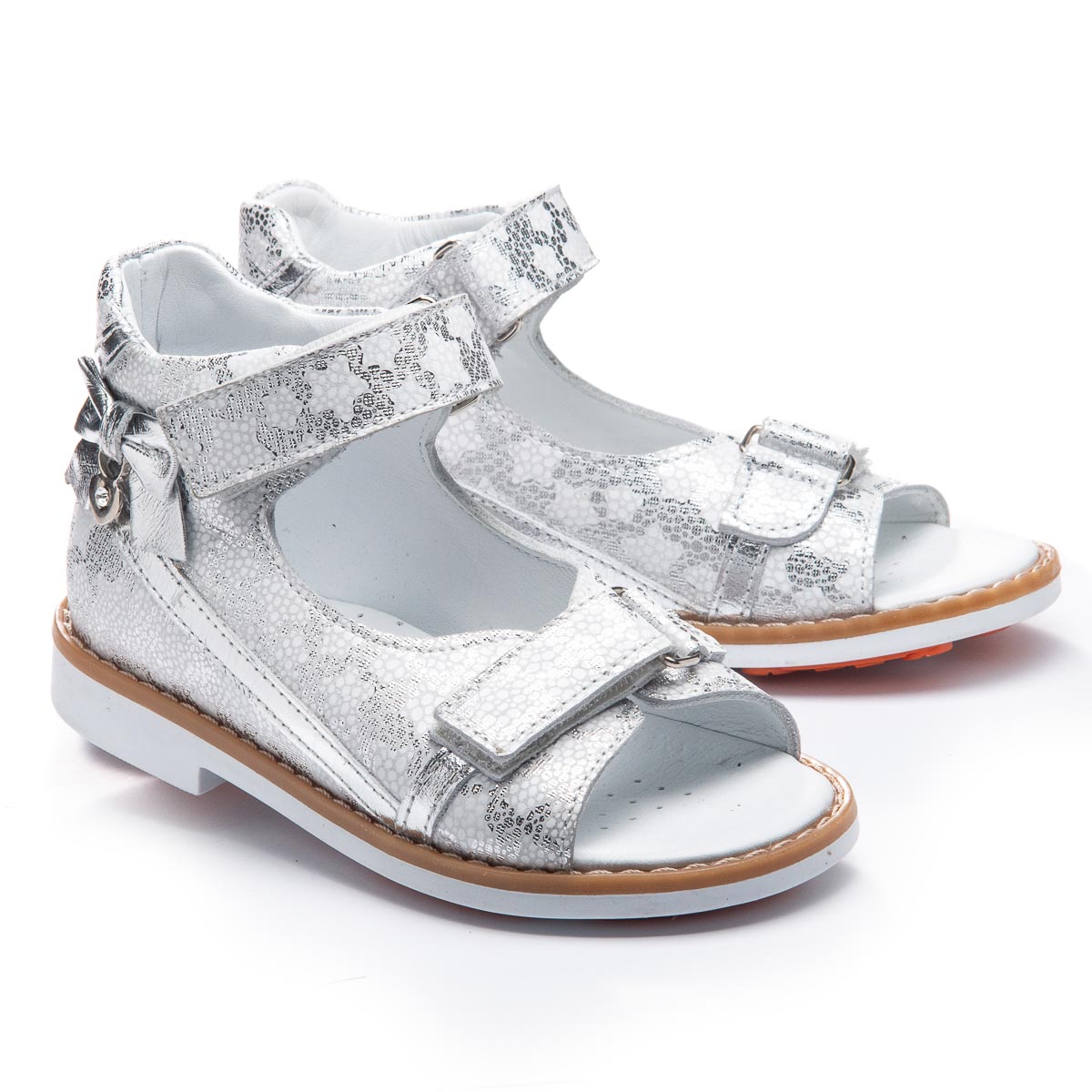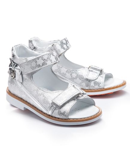 Босоніжки для дівчаток, виконані з натуральної шкіри білого та срібного кольорів, прикрашені витонченим принтом "зірки". Особливістю цієї моделі є декоративний бантик, який надає взуттю елегантності. Босоніжки мають зручні застібки - липучки, які сприяють легкому взуванню та комфортній фіксації на нозі дитини. Для забезпечення правильного розвитку стопи, здоров'я ніг та максимального комфорту, взуття має: