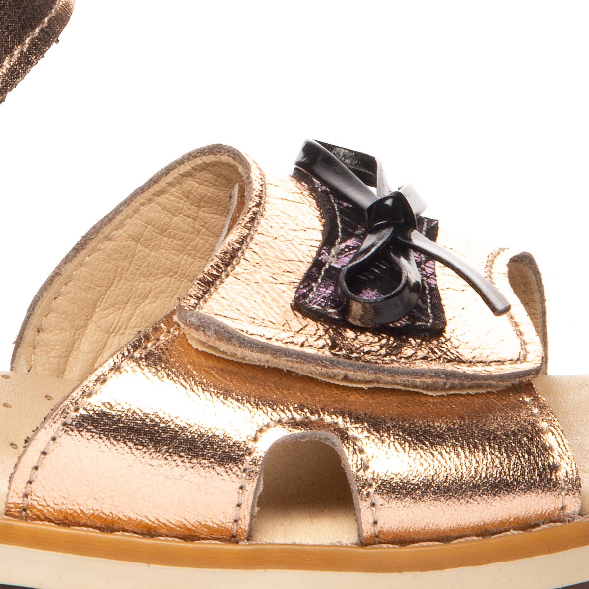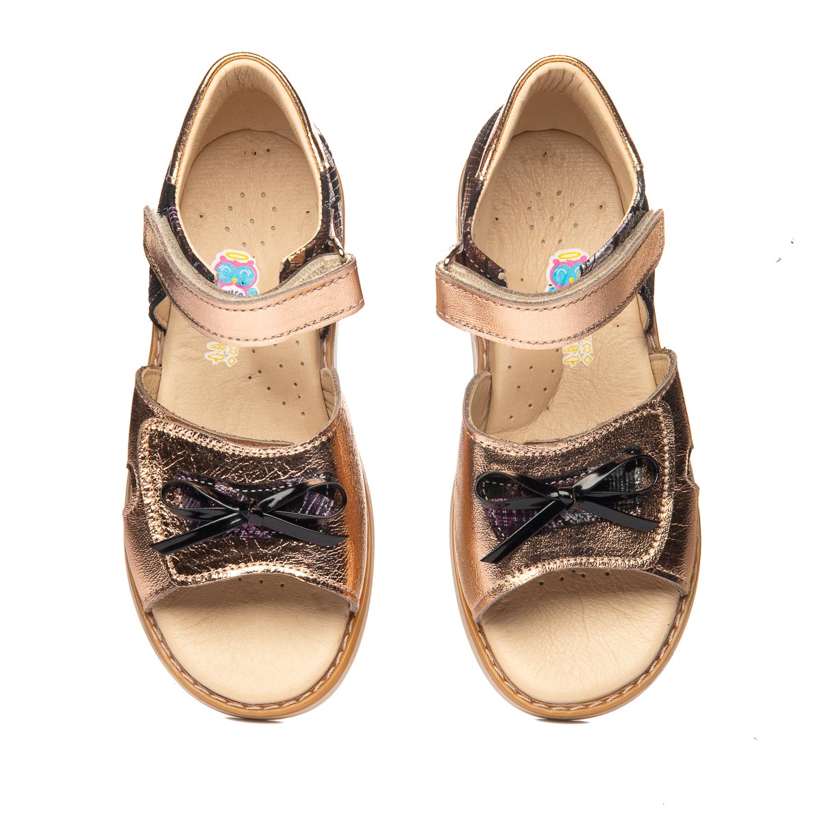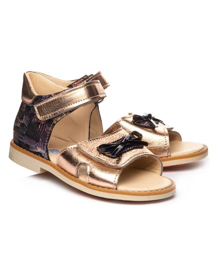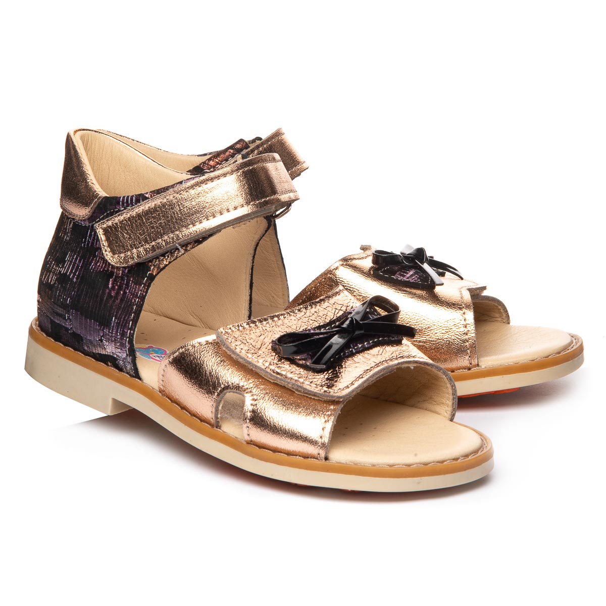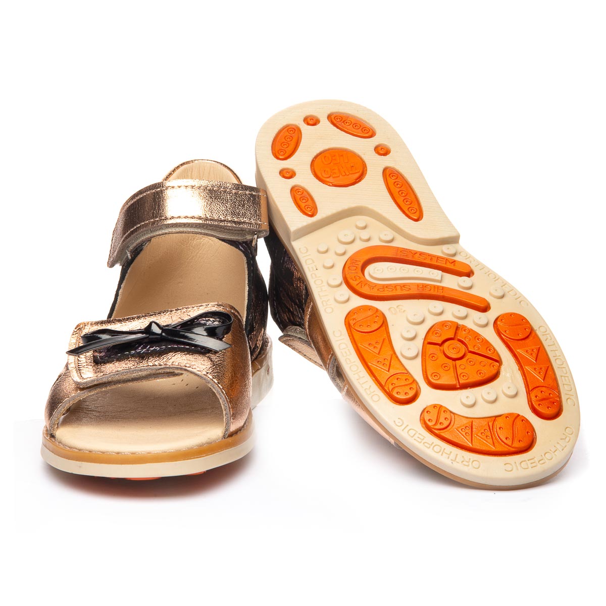 Елегантні дитячі босоніжки золотого кольору, виготовлені з натуральної шкіри, стануть справжньою прикрасою ніжок вашої маленької модниці. Маленький милий бантик, розташований на передній частині, додає взуттю чарівності та вишуканості. Дві надійні застібки-липучки забезпечують ідеальну посадку: широка липучка фіксує стопу спереду, а друга підтримує щиколотку. Зручна підошва та устілка мають ортопедичні властивості, що сприяють правильному розвитку дитячих ніжок.