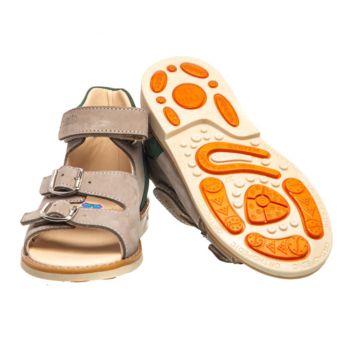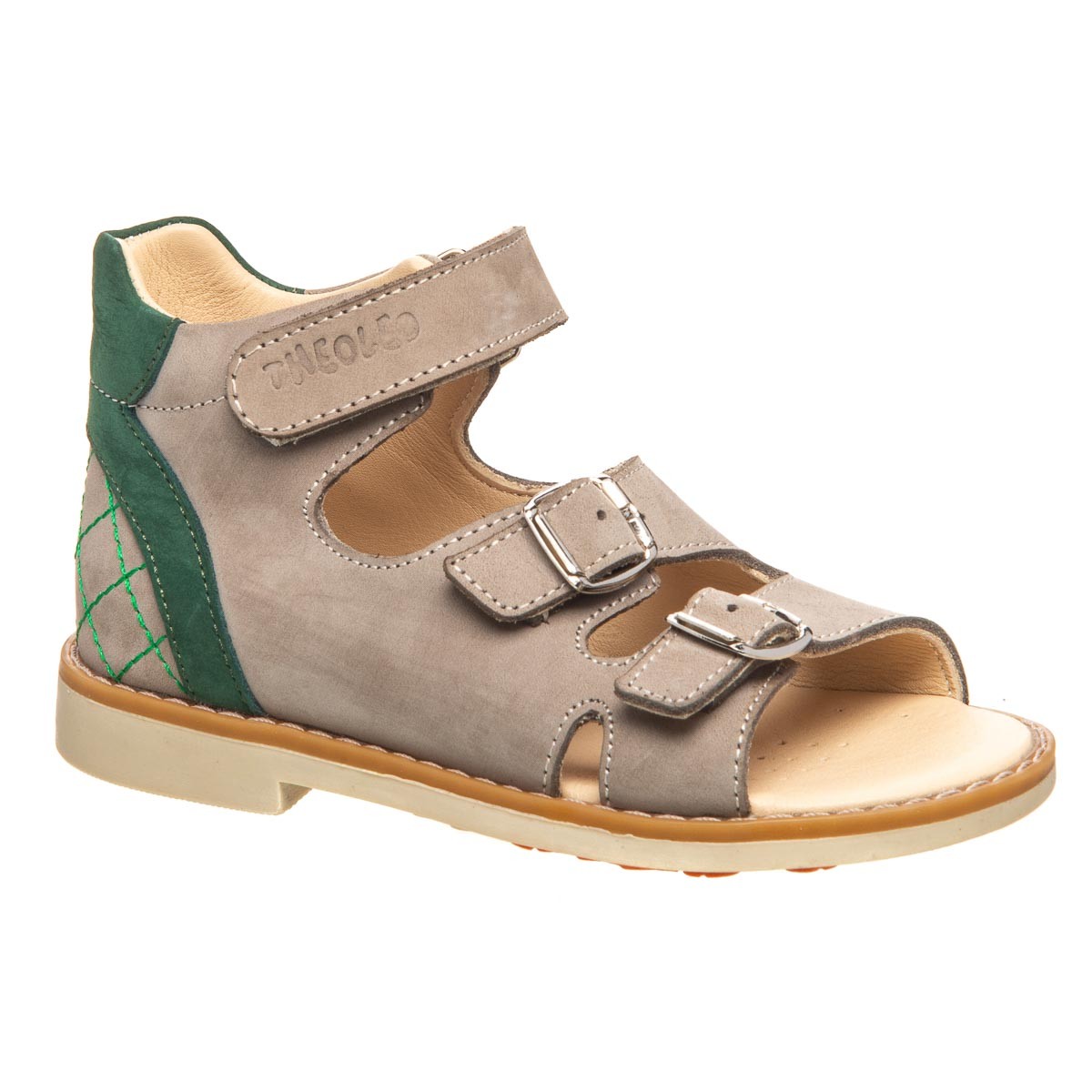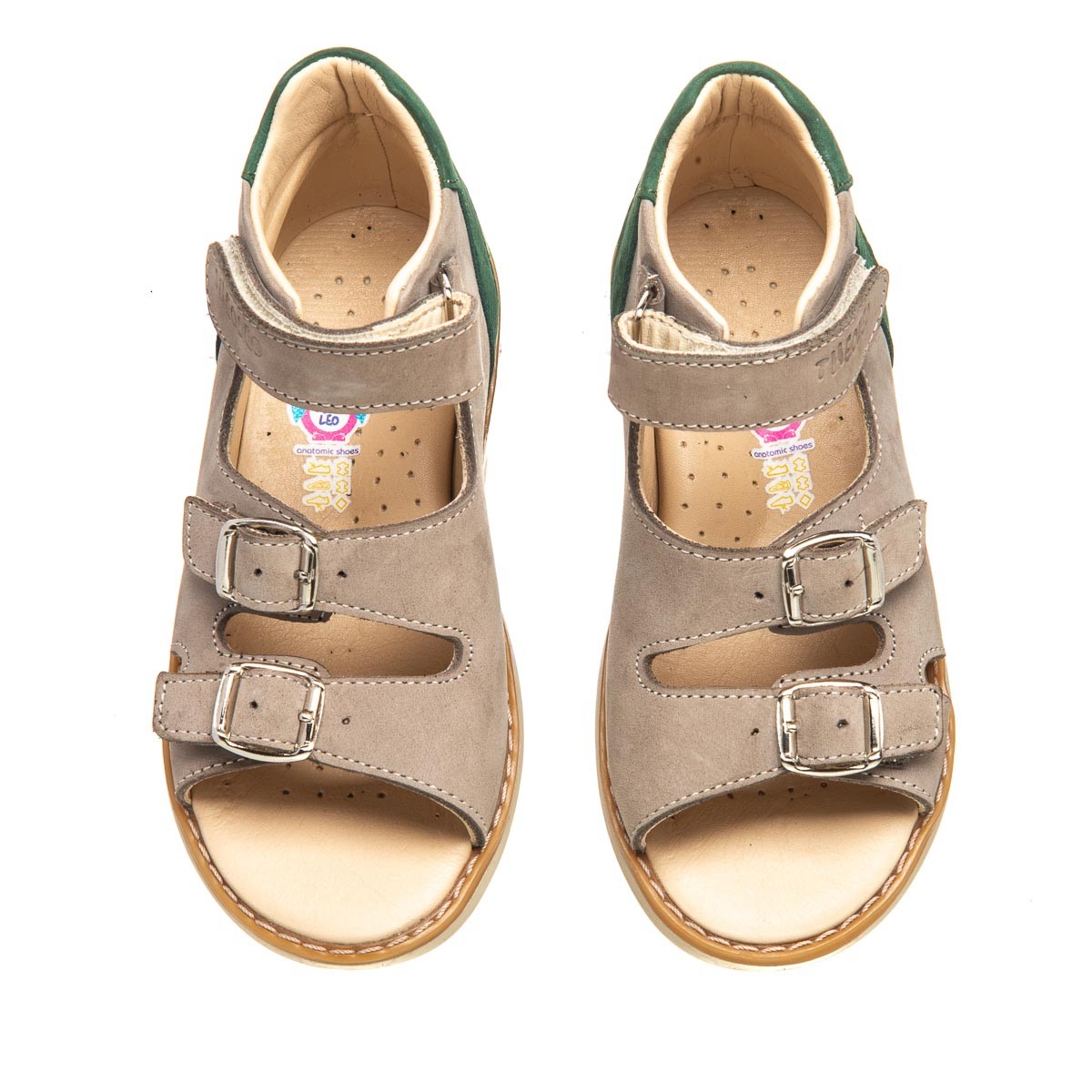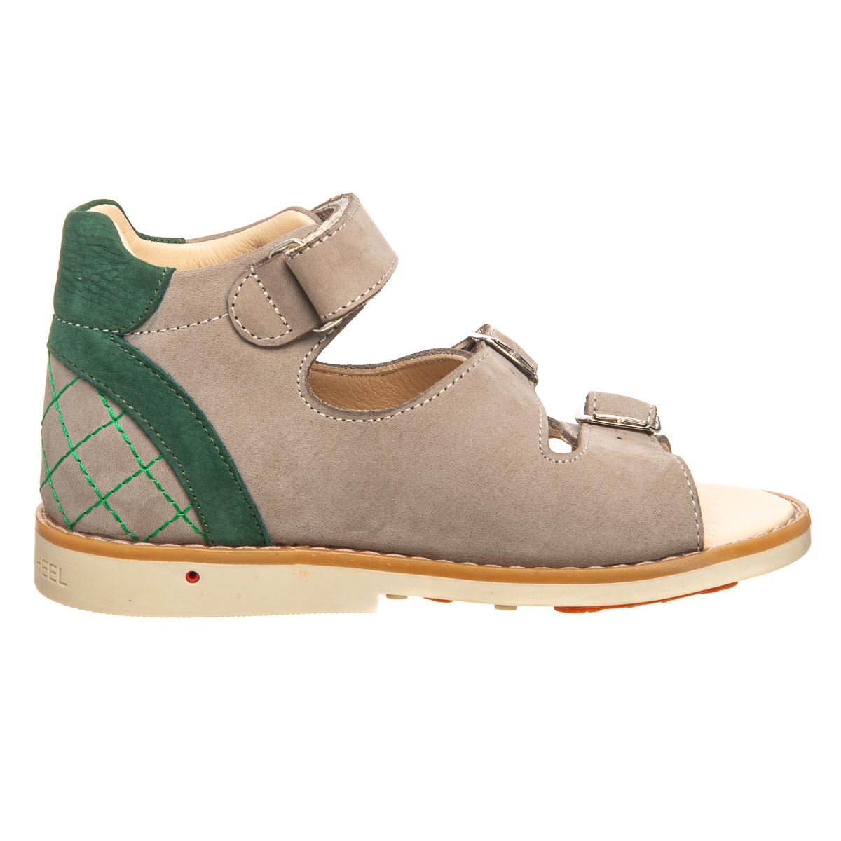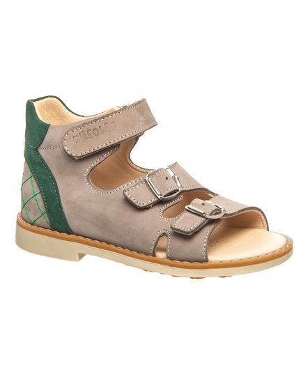 Елегантні дитячі босоніжки, виконаними з високоякісного нубуку у бежевому кольорі з привабливими зеленими акцентами. Ці босоніжки вирізняються своїм дизайном завдяки контрастним зеленим стіжкам, які додадуть образу свіжості. Оснащені зручною застібкою на липучці і парою ремінців. Для забезпечення правильного розвитку стопи, здоров'я ніг та максимального комфорту, взуття має: