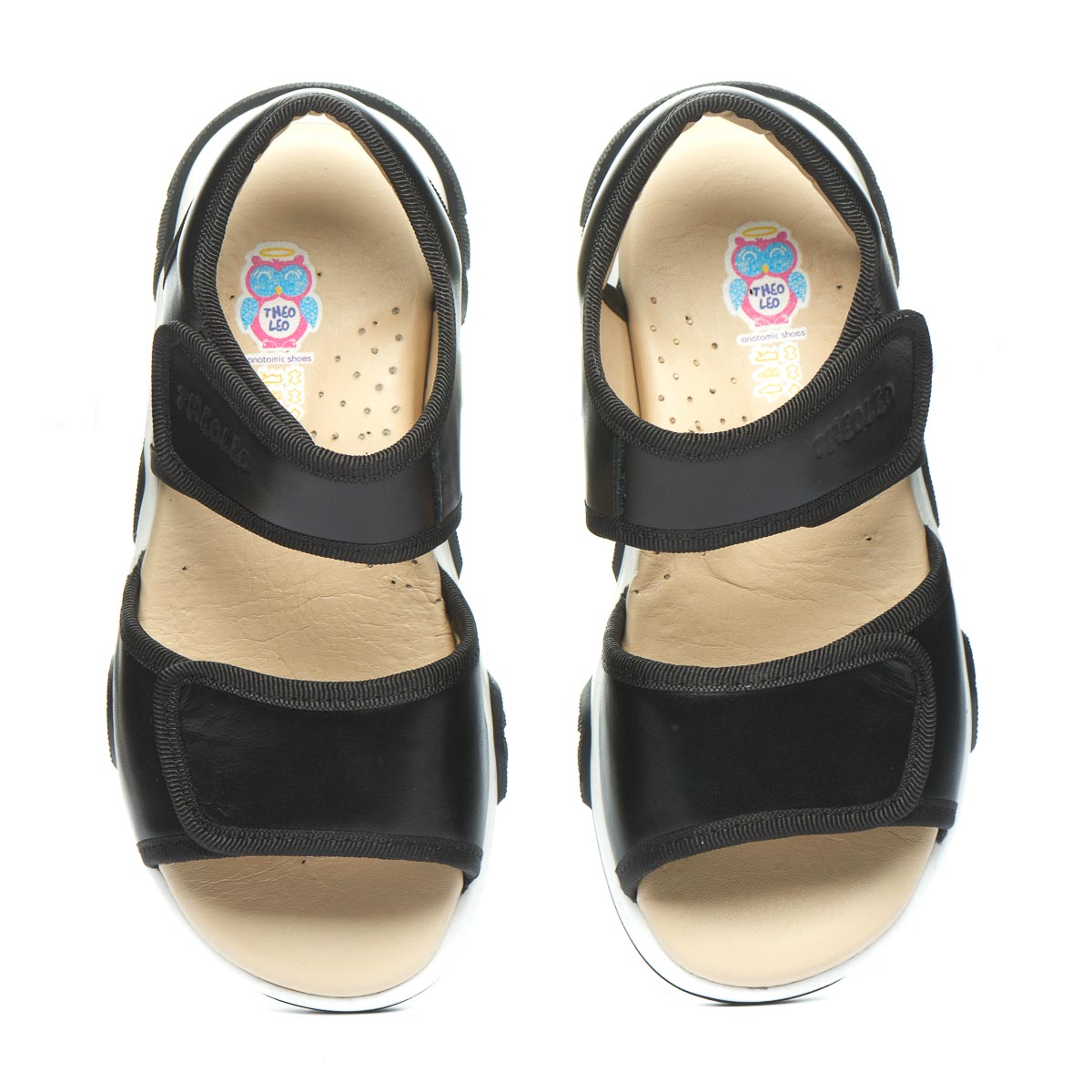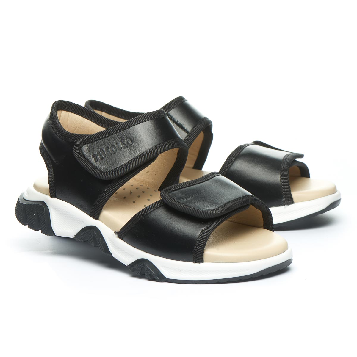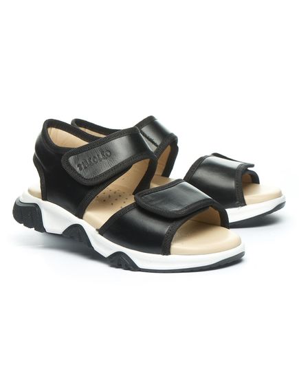 Літні, зручні босоніжки для хлопчиків. Виготовлені з натуральної чорної шкіри зовні та бежевою шкіряною підкладкою в середині. Оснащені зручною та міцною підошвою з гнучкого матеріалу – термопластичної гуми. М'яка шкіряна устілка  з анатомічним супінатором забезпечує приємні відчуття під час носіння. Босоніжки мають дві застібки на липучках, які дозволяють легко регулювати посадку та розмір взуття. Їх дизайн із відкритою п'ятою надає легкість і свіжість ніжкам, ідеально підходячи для теплих літніх днів.