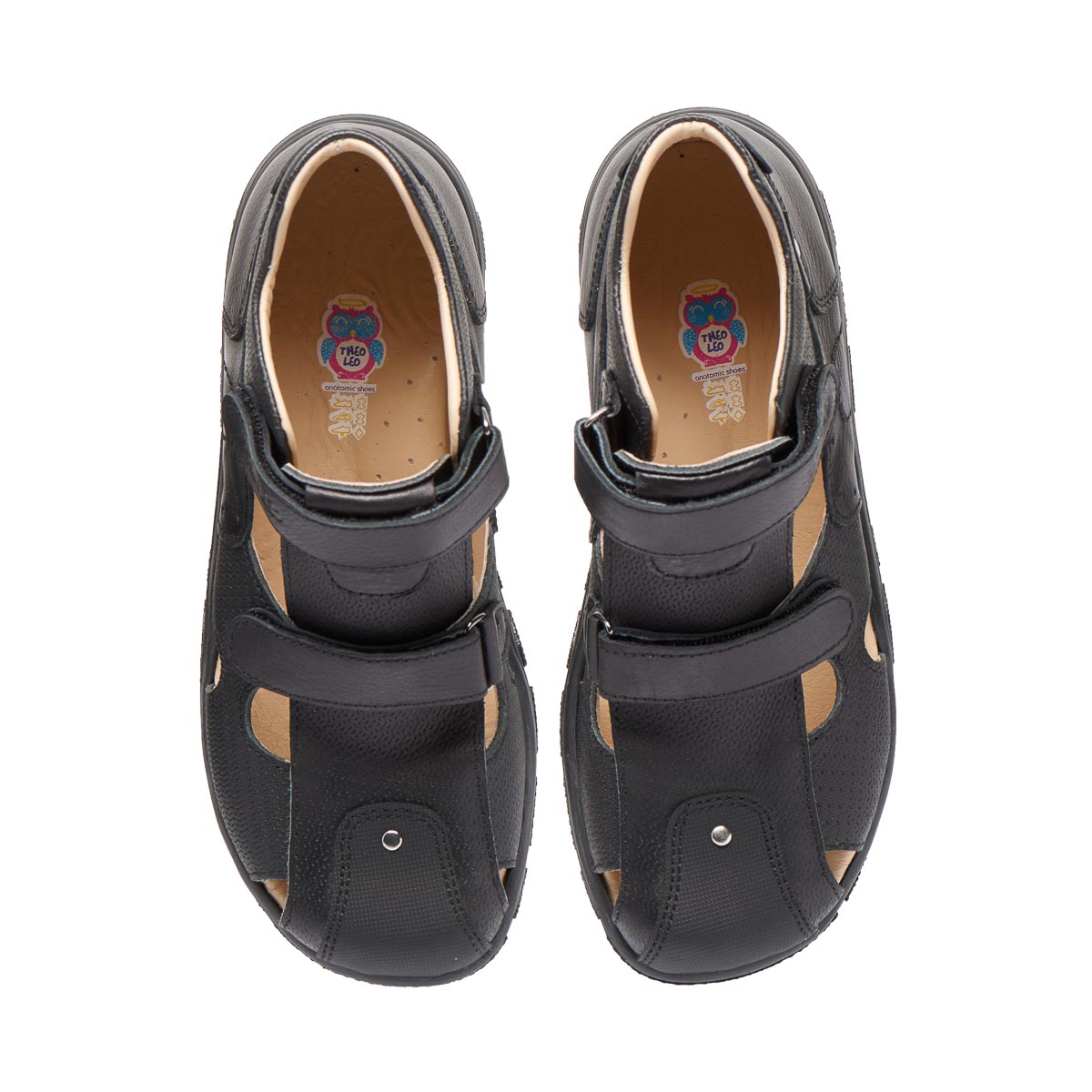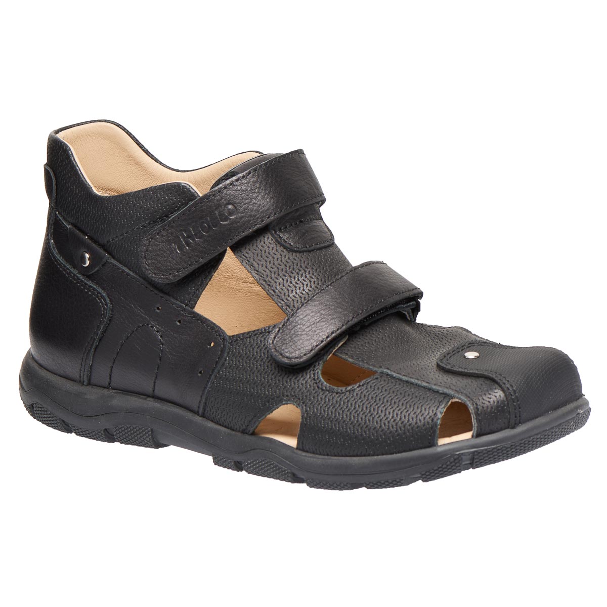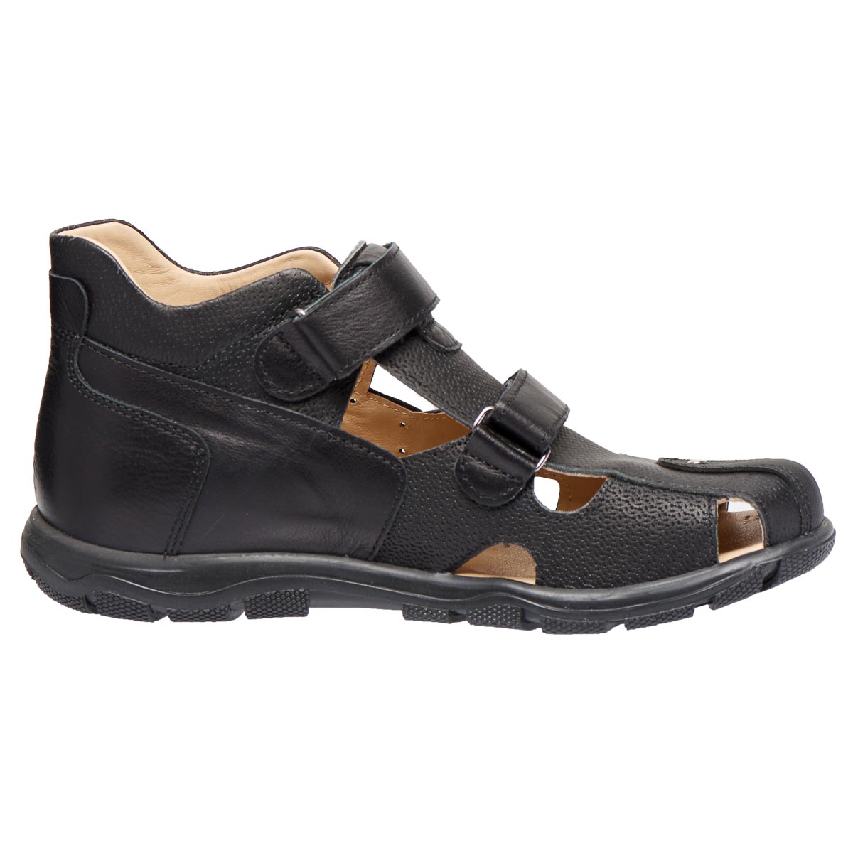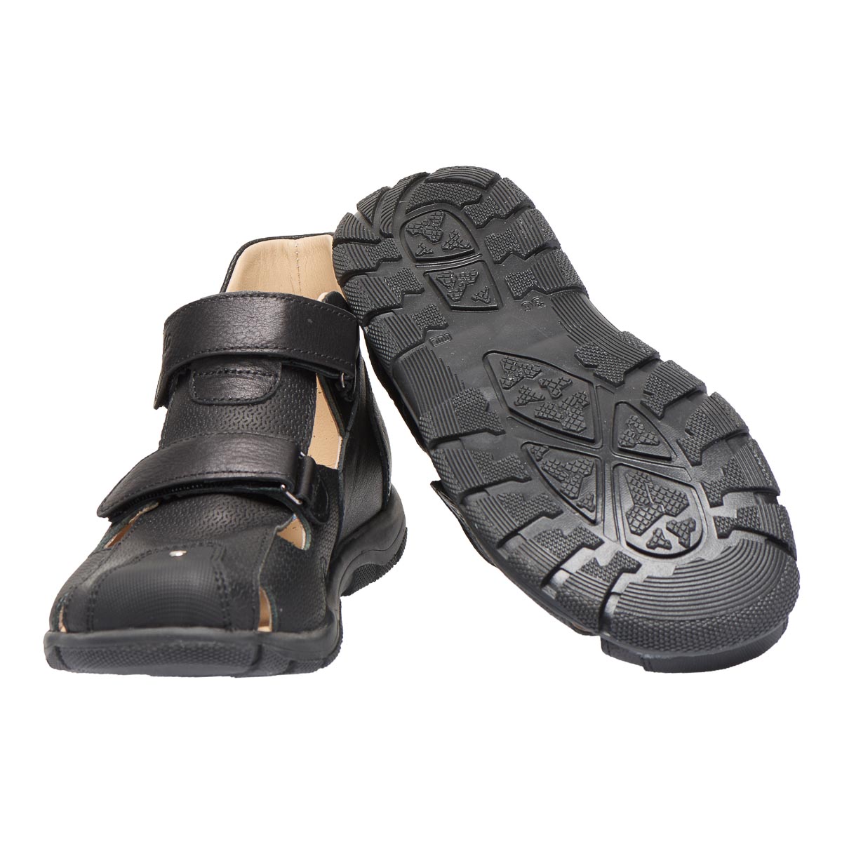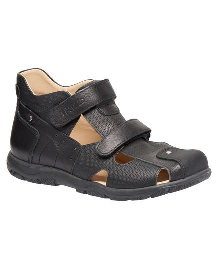 Босоніжки виготовлені з натуральної шкіри чорного кольору. Закритий носок забезпечить додатковий захист для ніг під час фізичної активності або прогулянок. Мають дві зручні липучки.