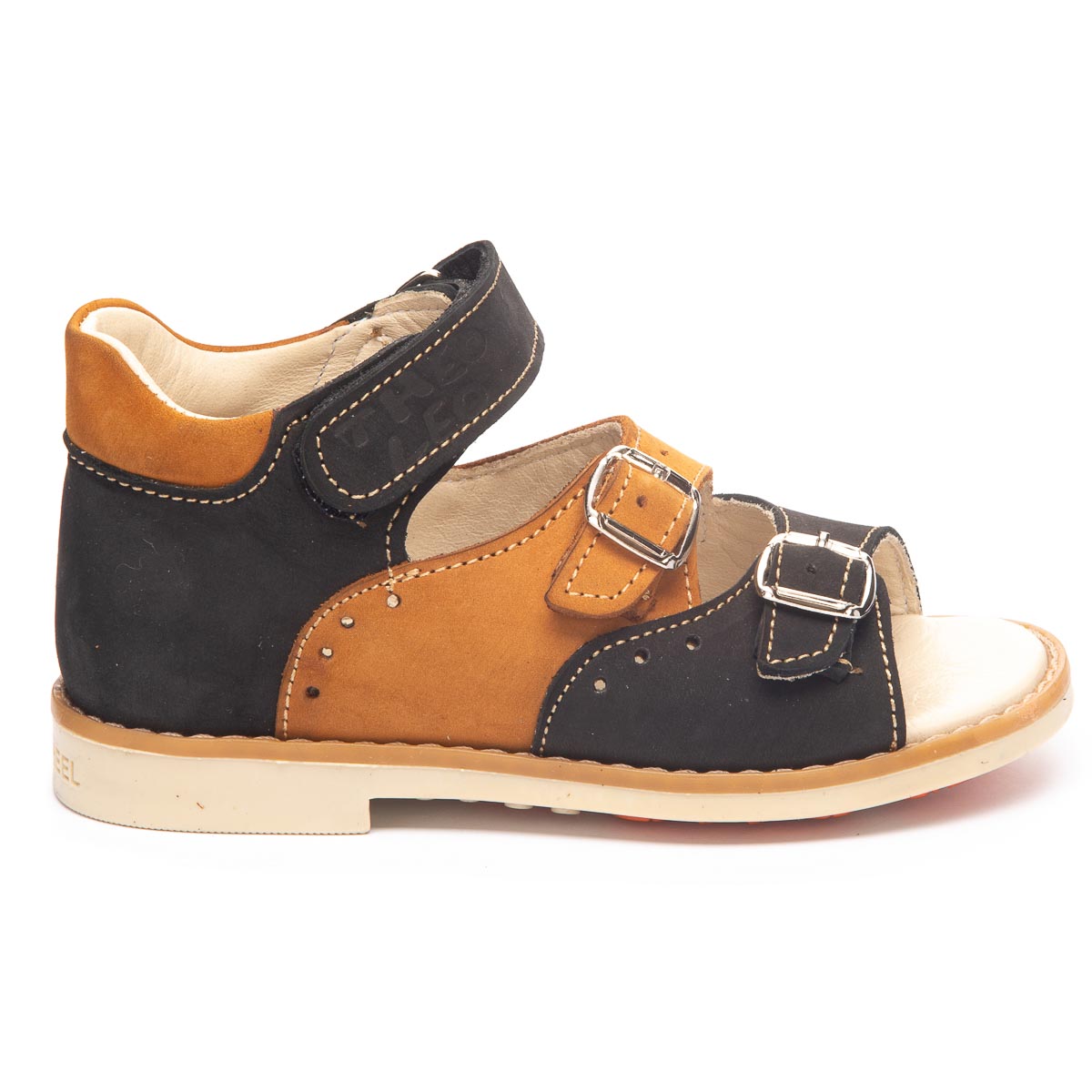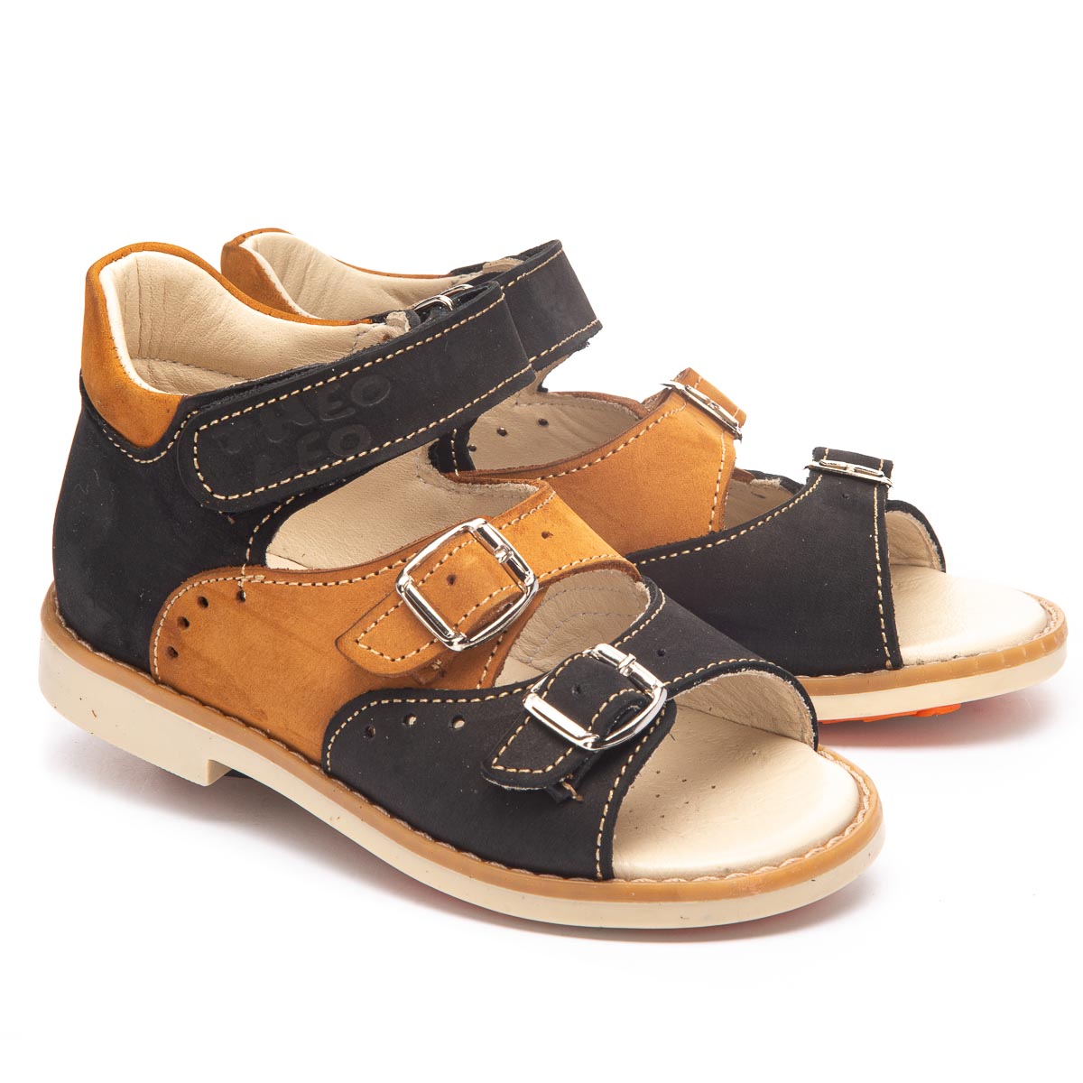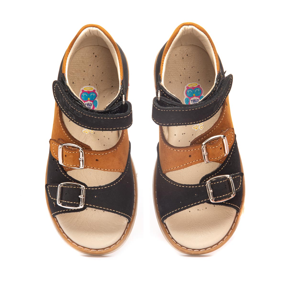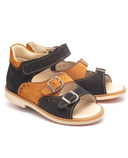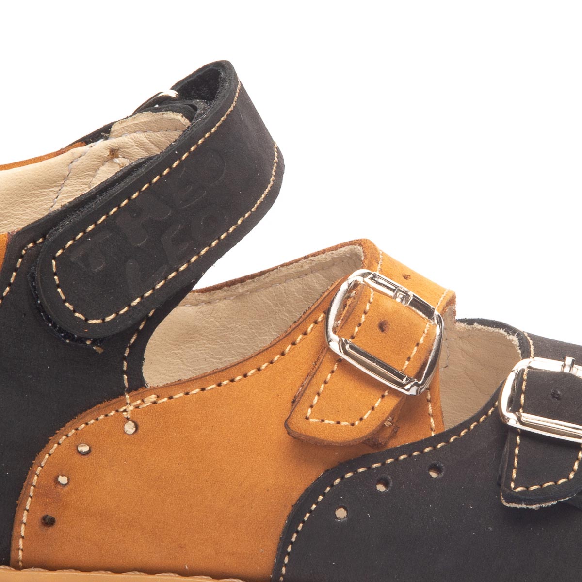 Босоніжки для хлопчика, виготовлені з високоякісного нубуку. Чорний та карамелевий кольори створюють класичний та водночас сучасний вигляд, що легко доповнить будь-який наряд. Оснащені зручною застібкою на липучці і парою ремінців. Для забезпечення правильного розвитку стопи, здоров'я ніг та максимального комфорту, взуття має: