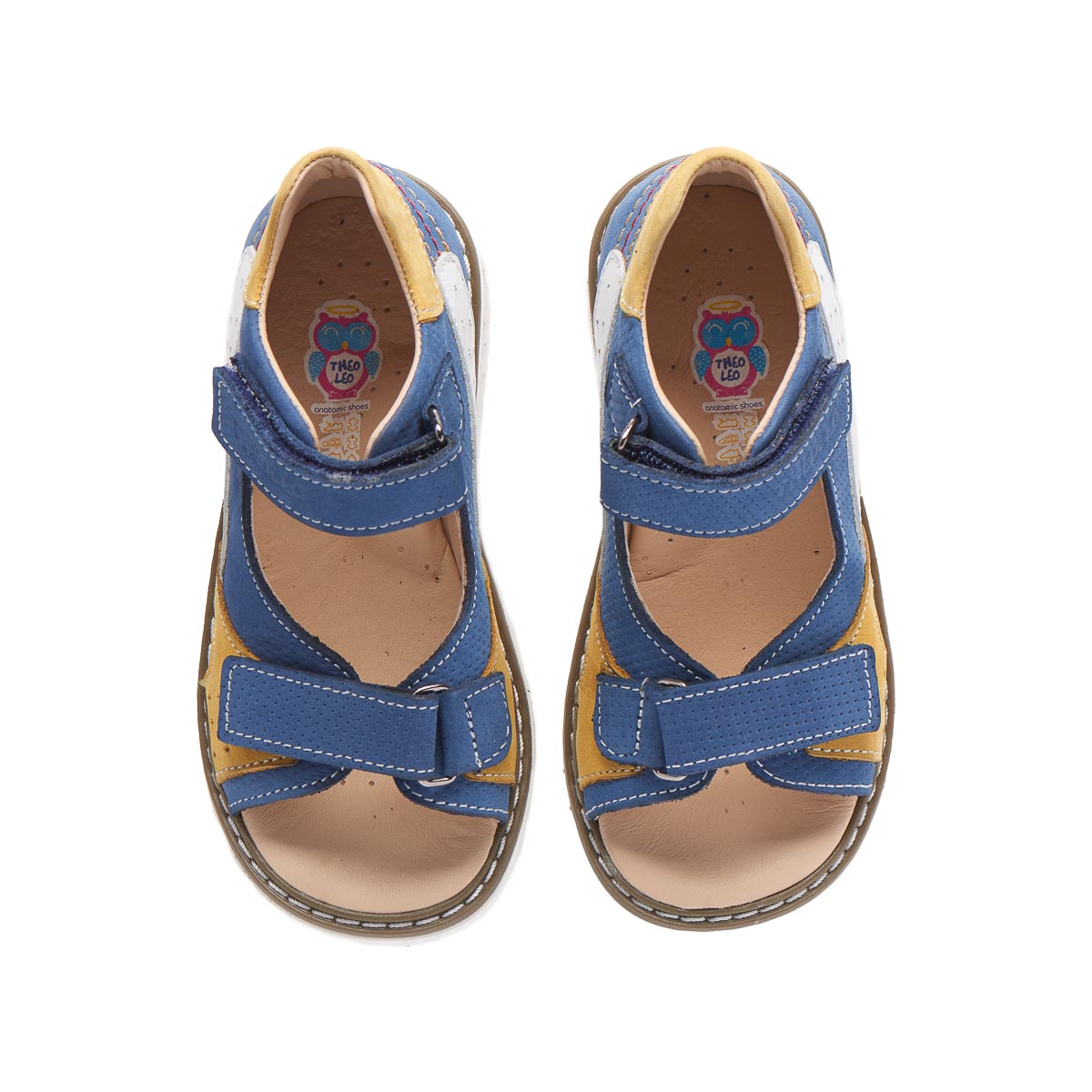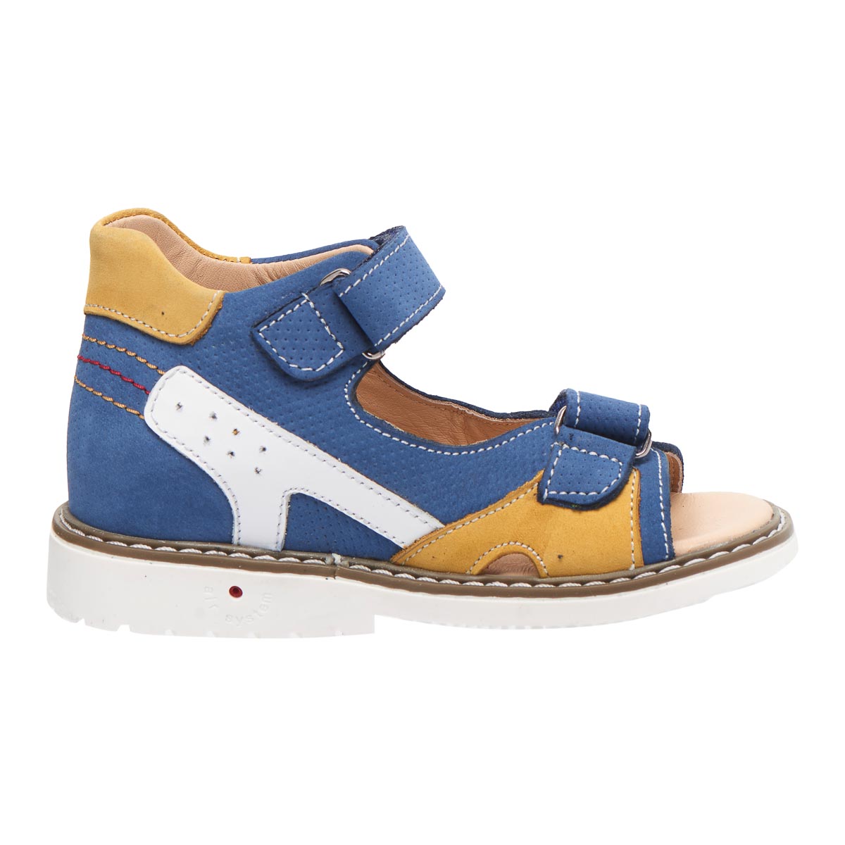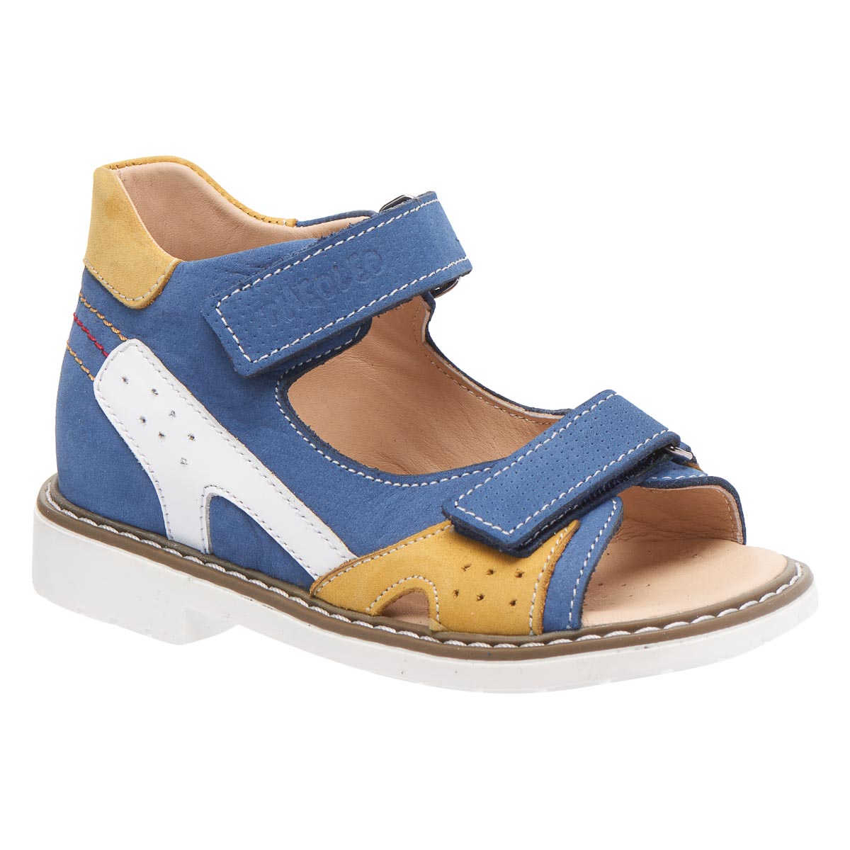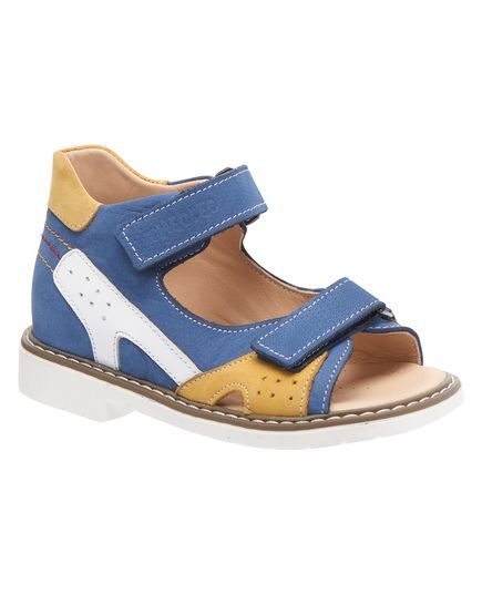 Босоніжки виконані з натурального нубуку, що робить взуття більш м'яким і комфортним при носінні. Кольорова гама взуття – синій, жовтий і білий кольори. Взуття оснащено зручними застібками на липучках.