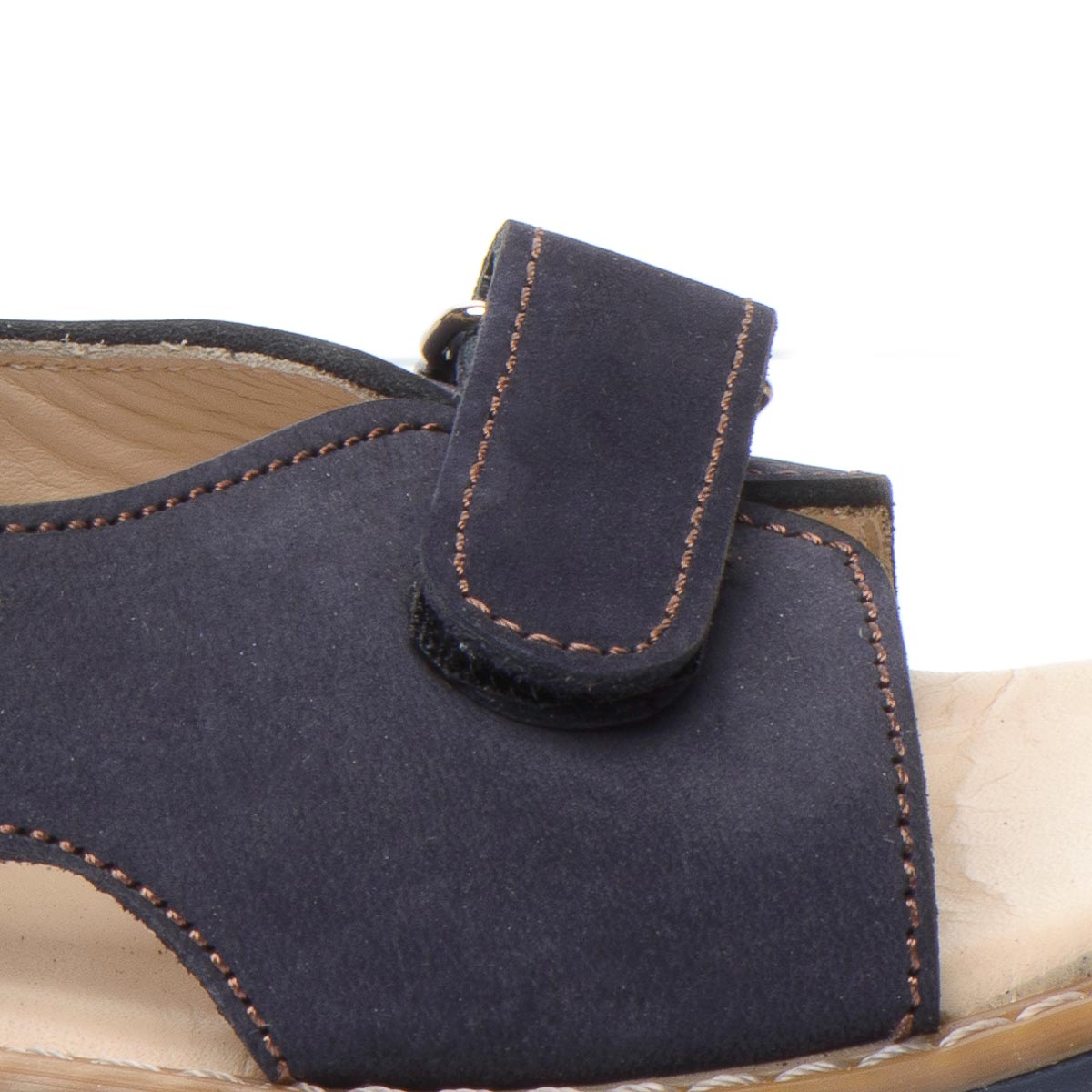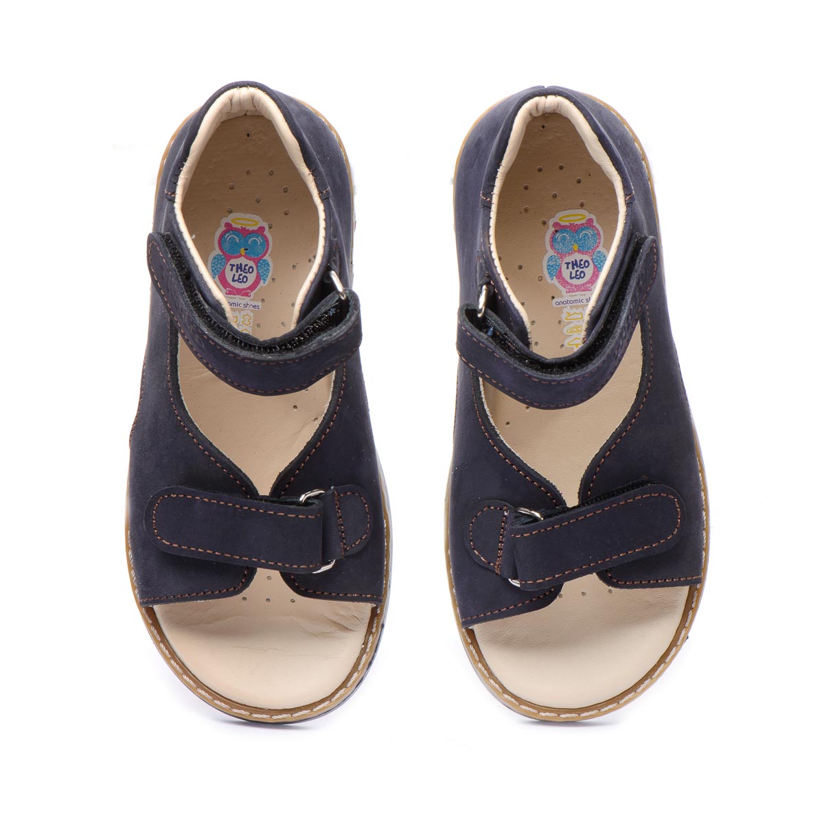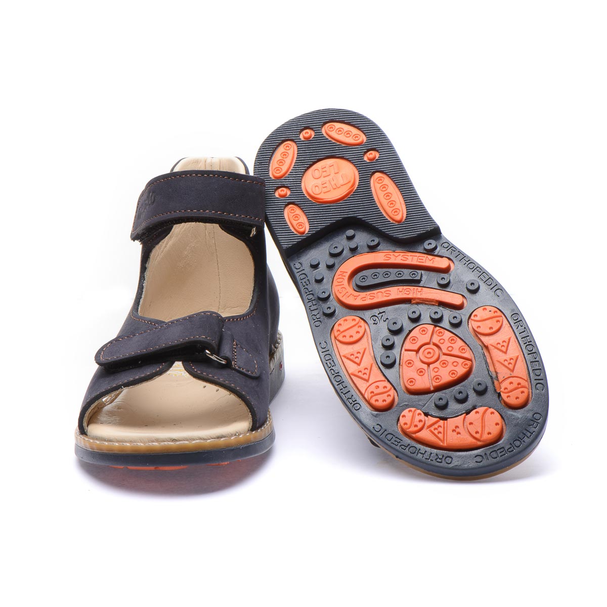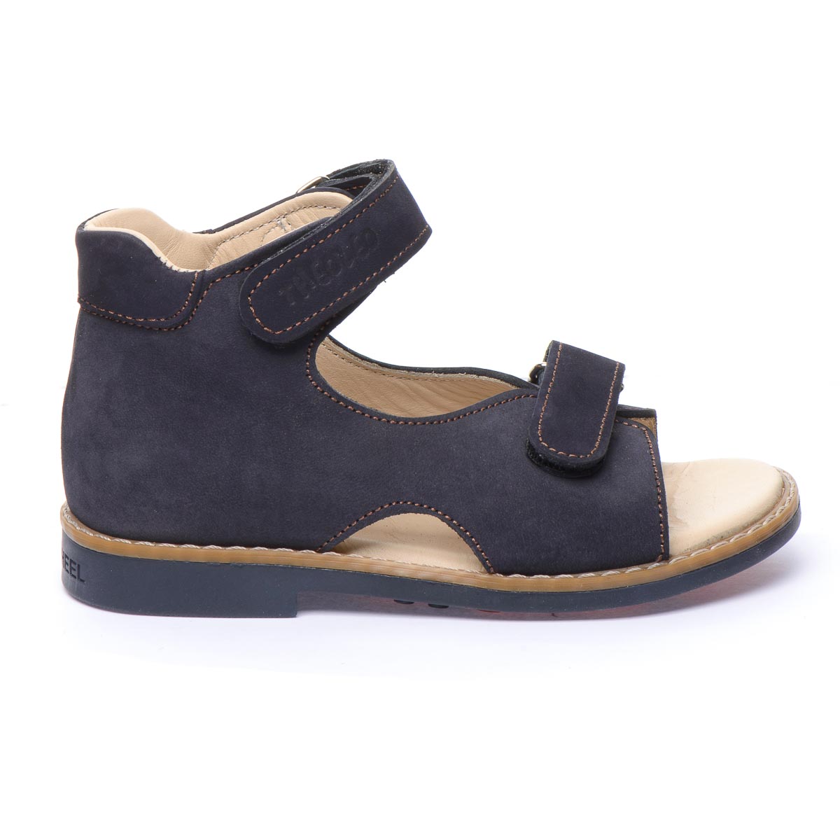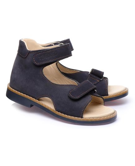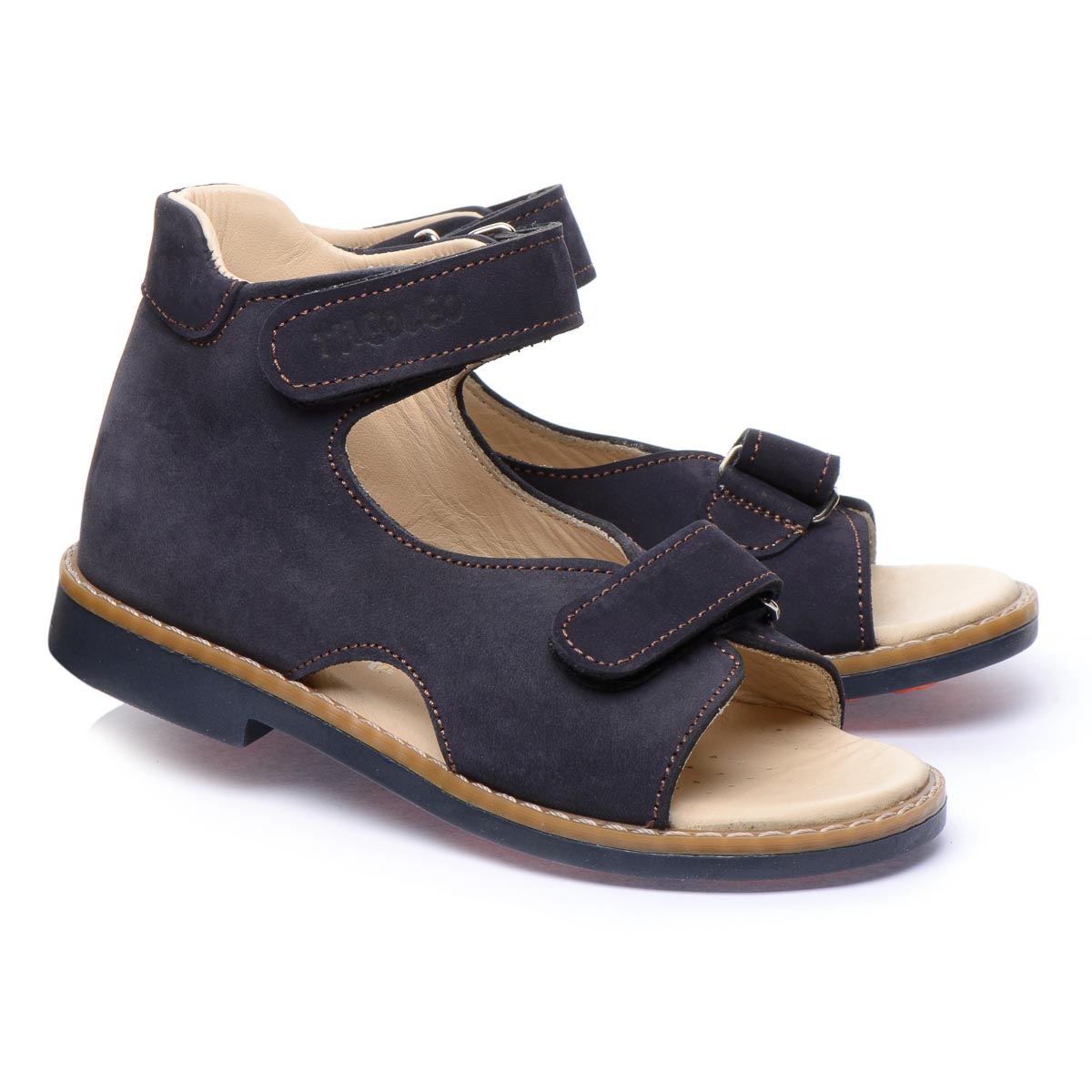 Стримані, стильні босоніжки для хлопчиків, виконані з натурального нубуку темно-синього кольору. Оснащені зручними застібками на липучках. Для забезпечення правильного розвитку стопи, здоров'я ніг та максимального комфорту, взуття має спеціальні властивості: