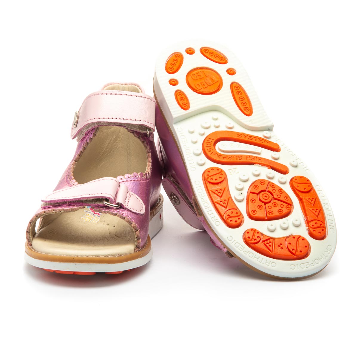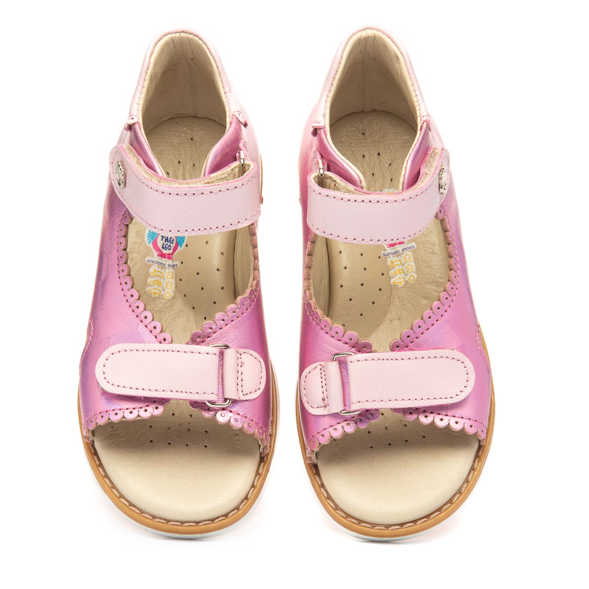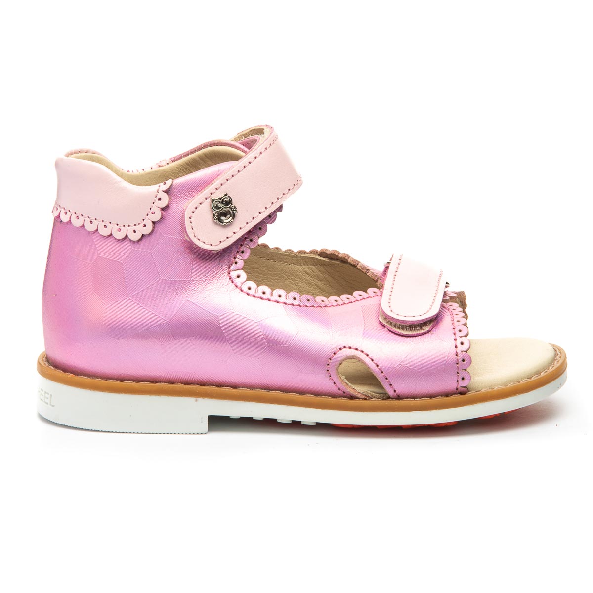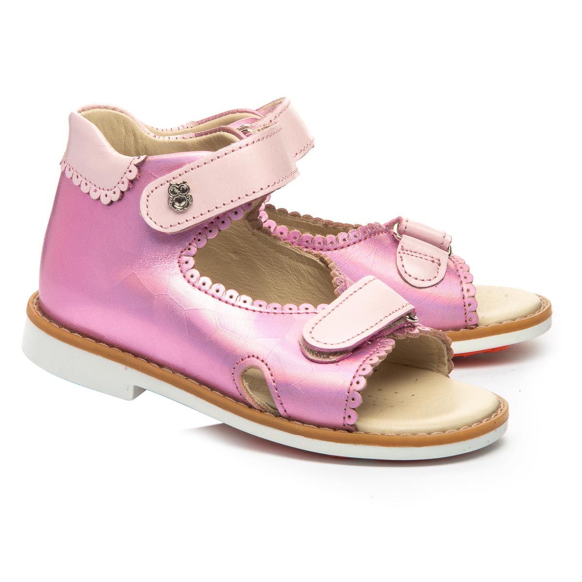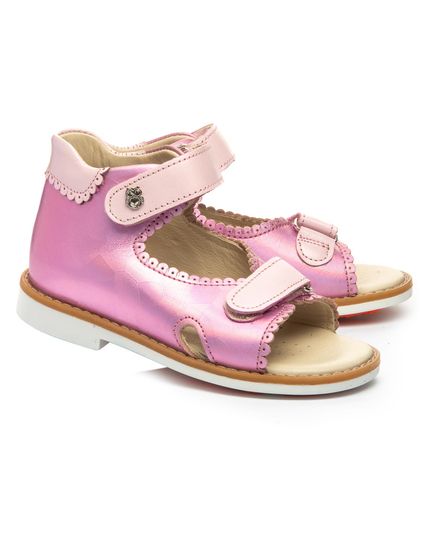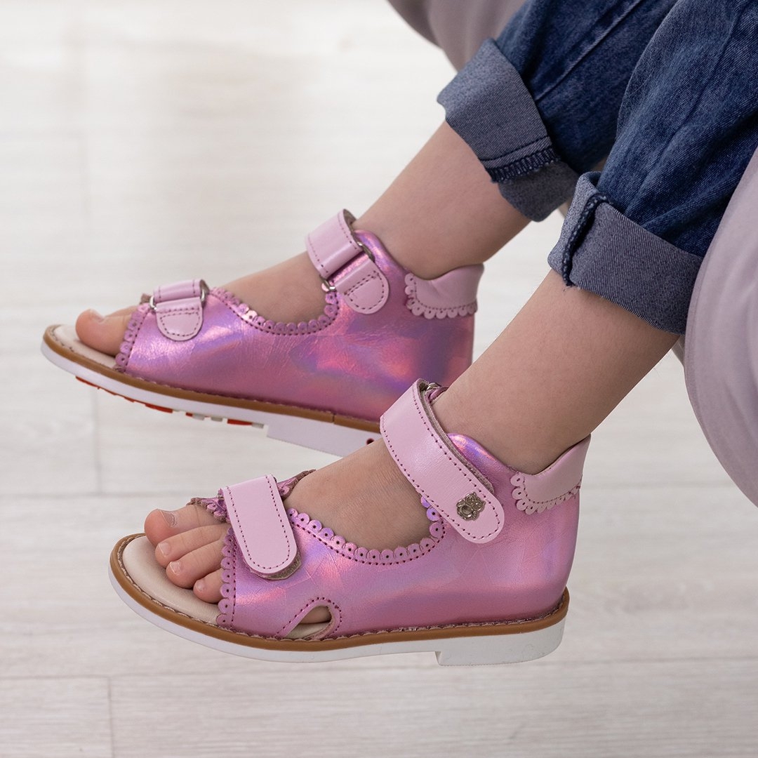 Босоніжки для дівчинки, виконані з натуральної шкіри в рожевому кольорі з перламутровим відтінком. Оригінальний принт додає унікальності та привабливості, роблячи ці босоніжки особливими серед інших моделей. Застібки-липучки забезпечують надійну фіксацію на ніжці, що дозволяє легко взувати і знімати взуття. Для забезпечення правильного розвитку стопи, здоров'я ніг та максимального комфорту, взуття має: