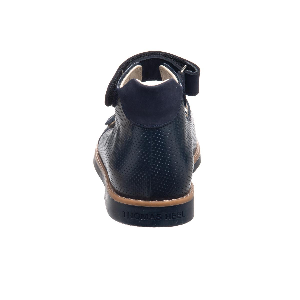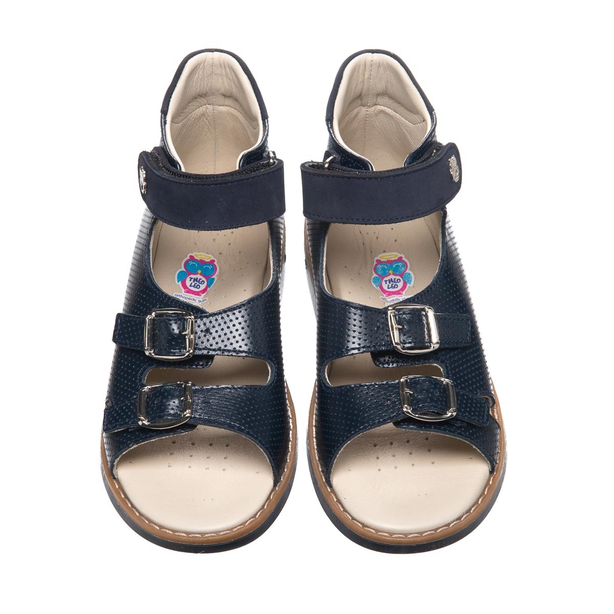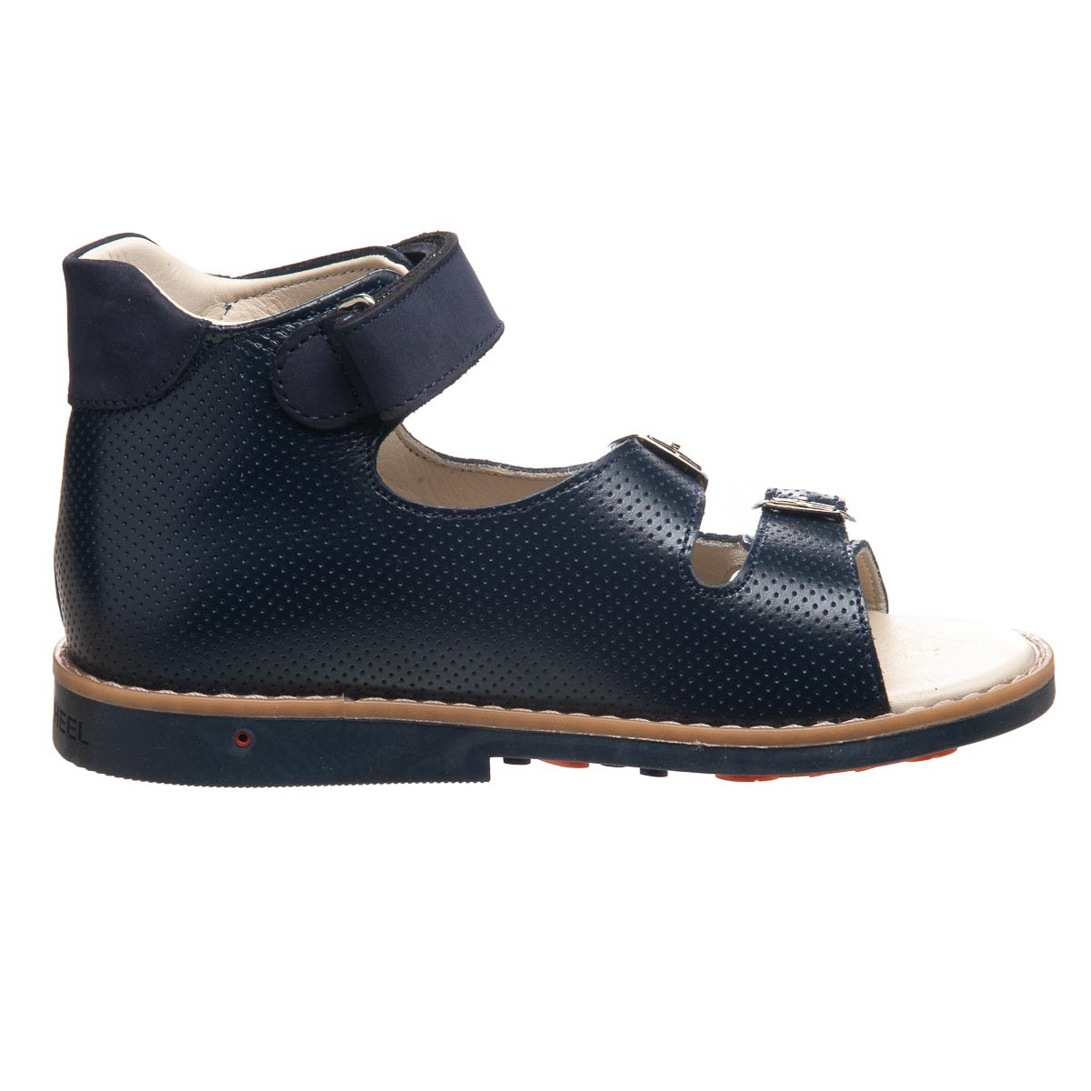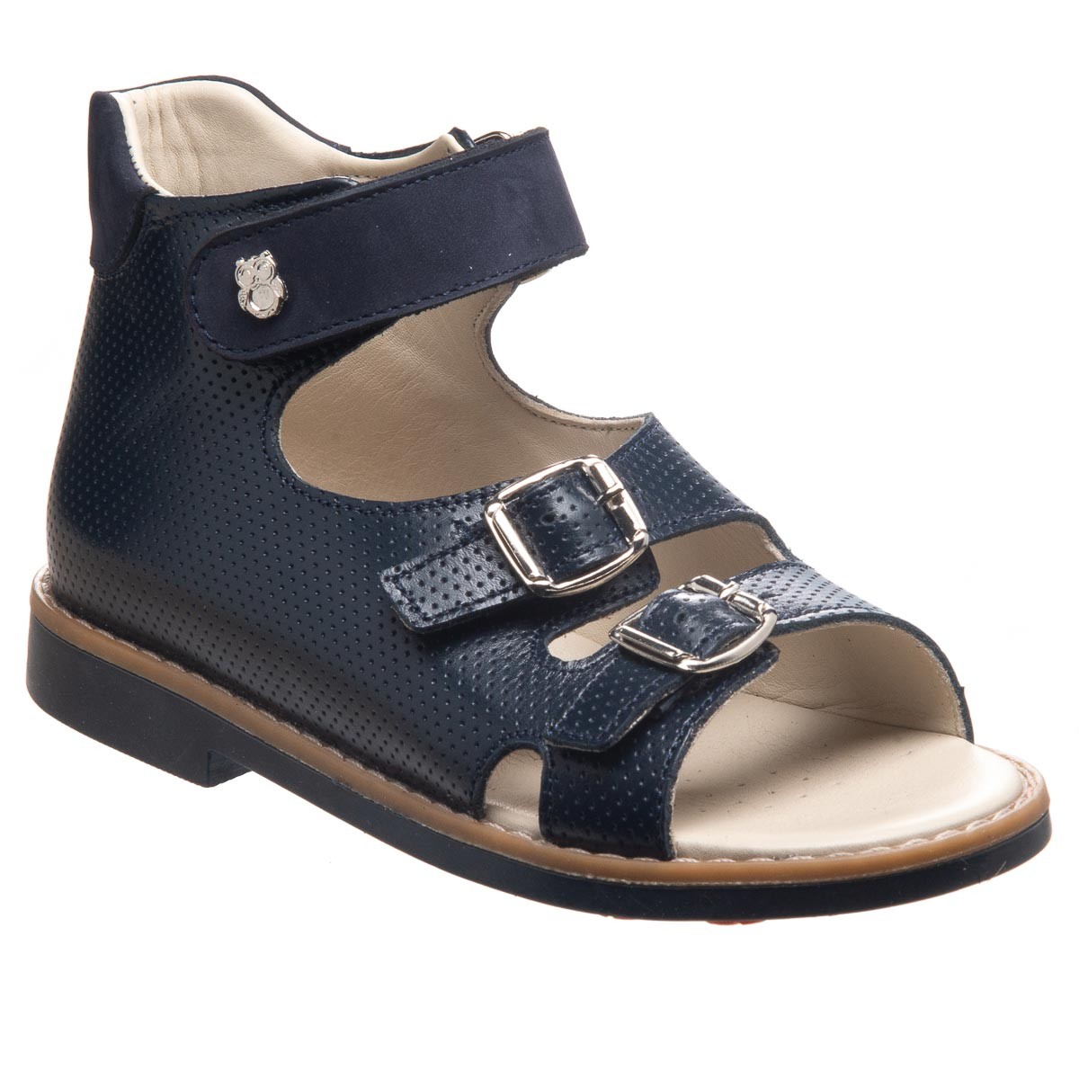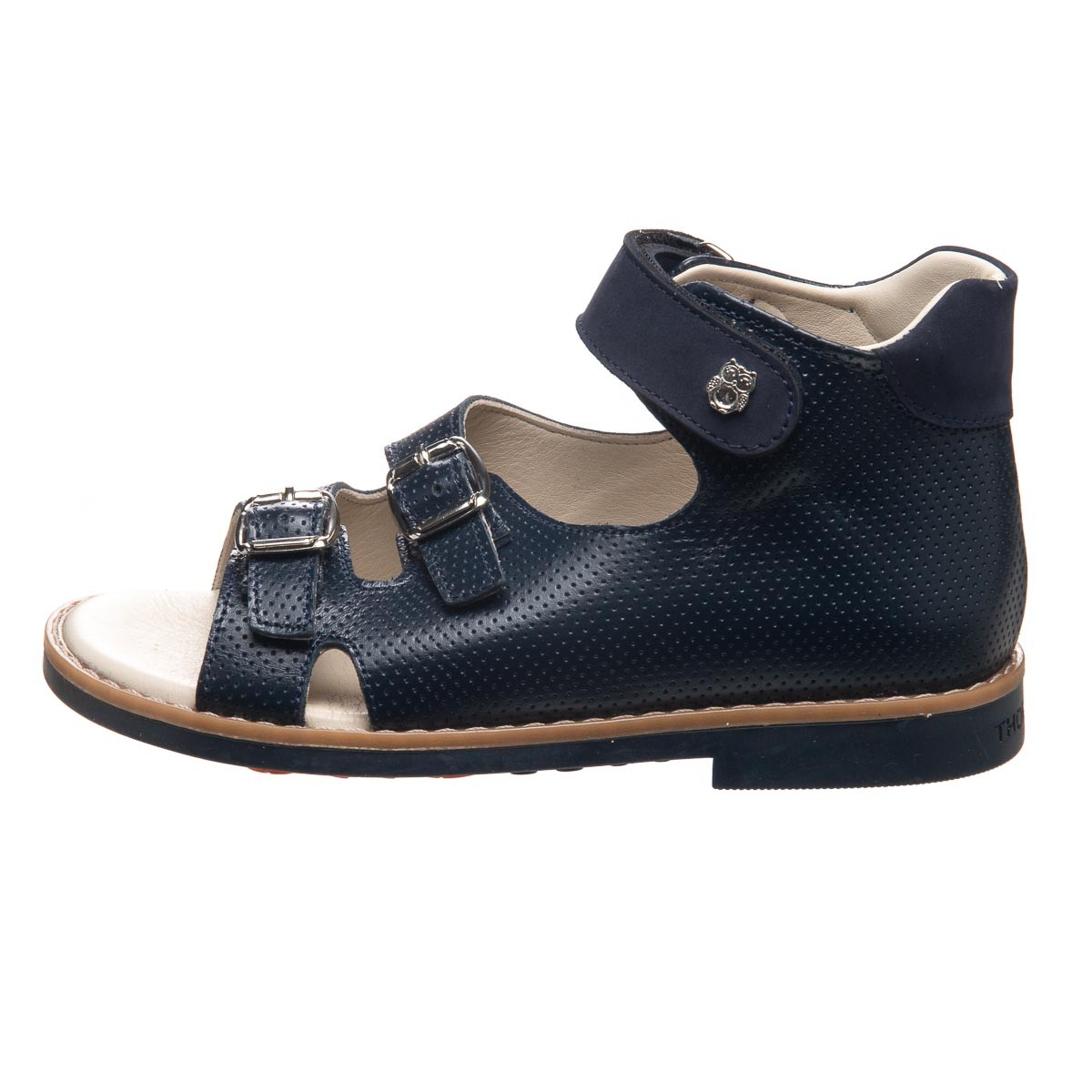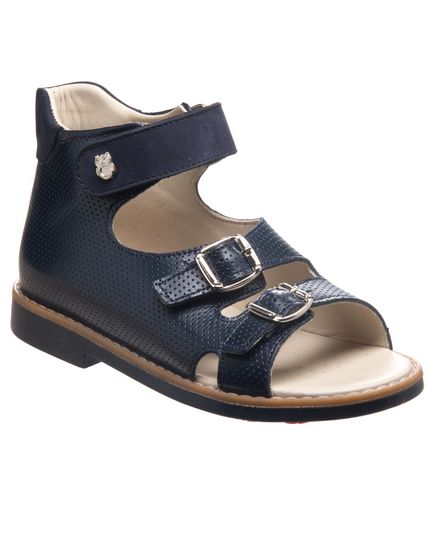 Профілактичні босоніжки для хлопчика, виконані з натуральної темно-синьої шкіри з текстурним тисненням на ній. Застібка на липучці дозволяє швидко і легко надягати і знімати взуття, що особливо зручно літом, коли швидкість і комфорт на першому місці. А два ремінця зрегулюють посадку босоніжок на нозі. Для забезпечення правильного розвитку стопи, здоров'я ніг і максимального комфорту, взуття має:
