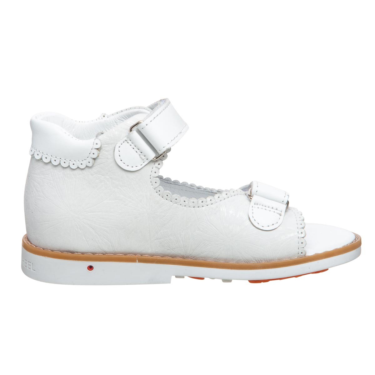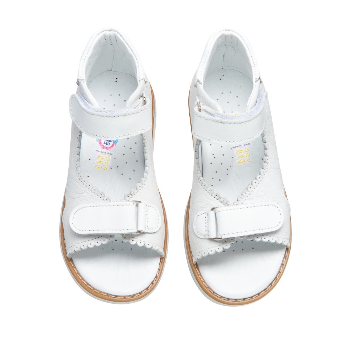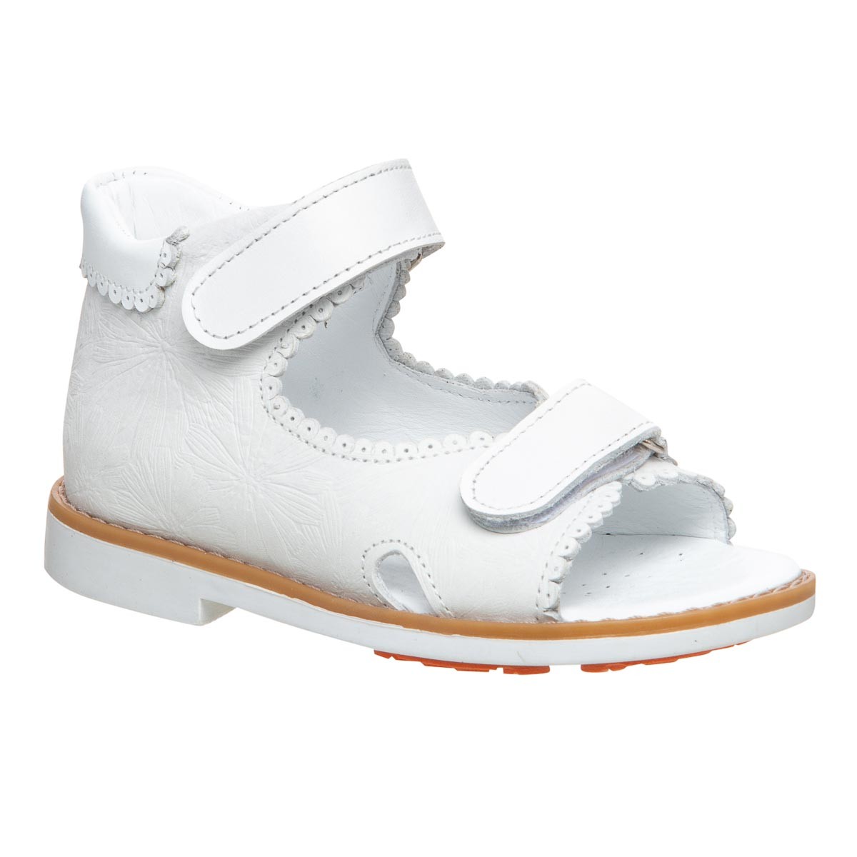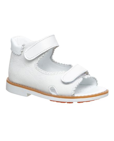 Елегантні білі босоніжки для дівчинки, прикрашені витонченим тисненням на натуральній шкірі. М'яка підкладка та устілка з анатомічним супінатором також виготовлені з натуральної шкіри, забезпечуючи комфорт і правильний розвиток стопи. Застібка на дві липучки дозволяє легко фіксувати взуття на ніжці. Підошва з термопластичної гуми гарантує стійкість та амортизацію під час ходьби.